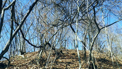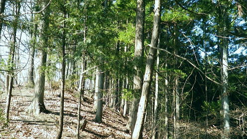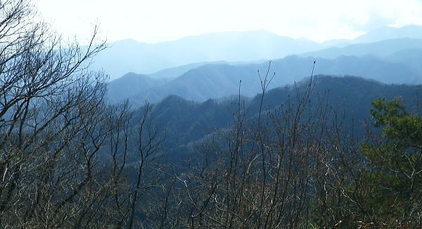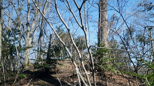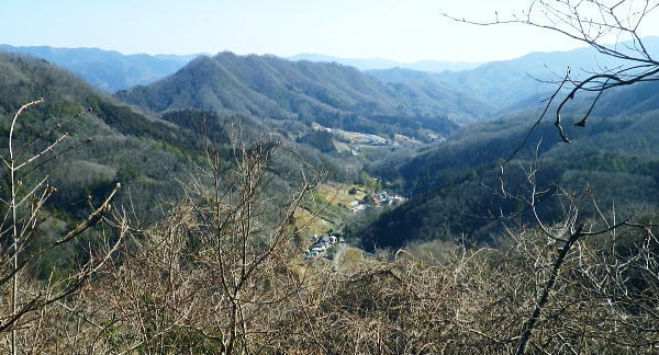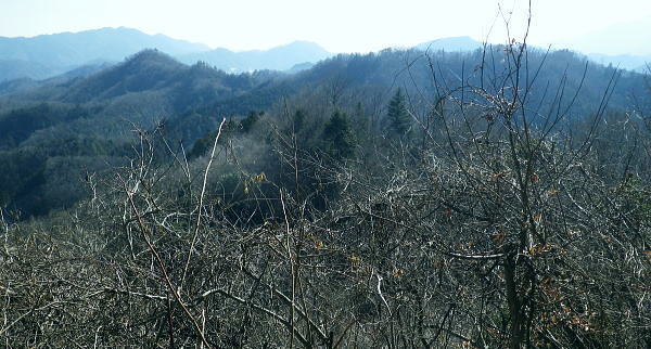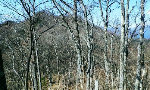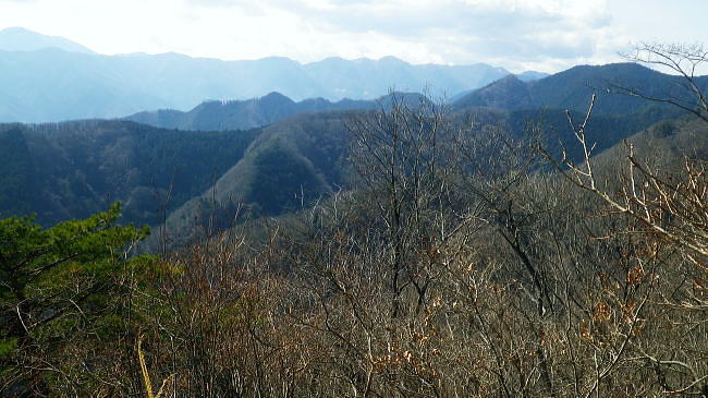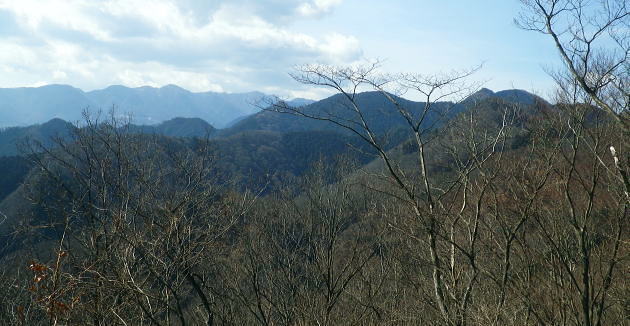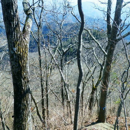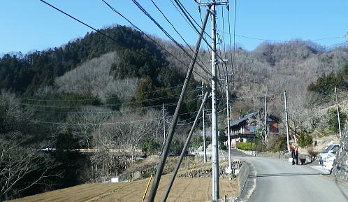 | 旧秋山村.端奥の低山3・・前道志山地Top 高柄山と御前山・新矢ノ根峠と田野入林道 2017年02月. 落合から田野入林道を右に見て.左の金山川側から高柄山中尾根に乗り.北尾根からは杖穴を経て里道を綴り.久保からjr四方津 2019年04月. 落合から犬鳩神社の裏から新矢ノ根峠・東尾根に乗り.鶴島御前山・栃穴御前山から牧野を経てjr四方津・・鶴島法性寺と下谷燈明寺 2019年05月. 田野入林道に入り新矢ノ根峠から高柄山―大丸・矢平山・丸ツヅク山・727m点コブ北尾根・鳥屋山北尾根からjr梁川 安寺沢川・綱子川流域 2017年04月. 釣場bsから御牧戸山北尾根に立ち.大タギレを経て金波美峠―阿夫利山から金剛山北東尾根を経て富岡.奥牧野bs 2017年04月. 奥牧野から綱子峠・平野峠にでて綱子川両岸尾根を周回―峯山から舟久保.十一面観音へ.林道・県道を綴りjr藤野 旧秋山村の東端奥の前道志.低山・・秋山川金山川から高柄山東尾根から北尾根で桂川に没す。 落合から高柄山中(東)尾根を詰め高柄山に立ち.北尾根の鶴島・杖穴と御前山を越え.桂川左岸からjr四方津駅 2017年02月26日.松村 落合から高柄山中(東)尾根を詰める・・頂でコーヒーの茶会に誘われる 高柄山北尾根から桂川沿いに杖突・久保.四方津へと抜ける 今週は上信の草津.嬬恋山域に入り.雪山の懐から帰宅し週を待たずして.再び前道志.旧秋山村の低山に出向く。 白根の嬬恋山行では新雪に翌日は降雨と情けないOB親睦ハイクになり.先輩の新築祝いに誘われ.3日間.酒に浴びる日々が続いていた。 2度目の正月を迎えたようで.体はアルコール漬けのだるさが残されている。 体には汗を掻くのが一番よいと考え.前回桂川対岸の寺山から遠望した高柄山を選び.旧秋山村の里山を目指す。 午前中に曇天に変わる予報がでていたが展望は二の次. 寺山に続き.その対岸の高柄山山域に初めて訪ずれる。 高柄山は山梨県上野原市の東端に突き出す部分に属し.前道志の東端に位置して神奈川県相模原市と山梨県大月市と接している。 標高は733mと山梨百名山の中でも最も低い山域に入っている。ただ以外に藪絡みが多く.短い距離の割には複雑に絡み合う枝尾根を多く持っていた。 2日前に急に決めた山行。下調べもそこそこに紀行文を読み.6.7年前に奈良倉山に登って以来.初めてjr上野原駅ホームに降りる。 扉が開いた下り線ホームから見上げたのが御前山。その裏に聳えるのが道志最東端の高柄山になる。 鶴島御前山と栃穴御前山 jr上野原駅下り線ホームより.8:43予想は外れ晴天に恵まれた。鶴島御前山484mと右手に連なるのが栃穴御前山431m。 その裏側が杖穴地区で.尾根末端は栃穴地区に下りている。栃穴御前山に登るには杖穴橋を渡って登った三差路を左に折れ. 杖穴沢を渡り.栃穴集落への坂道を辿れば取付けられる。 左側の高台は桂川を隔てた駒門地区. 見ずらいが.その上部.左側の尾根上から正面の尾根を横切る鉄塔群は秋山川の吉原(きっぱら)を繋ぐ. 道志第一発電所からの送電線。桂川鶴川出合脇にある八ッ沢発電所と結ばれ.そこで昇圧されている。 先月,桂川の対岸の寺山に登るまでは上野原駅ホームから望む御前山を高柄山と勘違いしていた。 高柄山はホームから望めぬが鶴島御前山の裏側に聳えている。それほど東京近郊の山々は山音痴だった。 2月26日(日)快晴後 jr御徒町.¥1144. 6:49=6:53神田:55=8:01高尾.甲府行:07=8:25上野原北口.無生野行:30=落合入口バス停・・本来は! 高尾=西八王子.大月行:8:13=8:41上野原.タクシー.¥1540=8:55落合入口バス停. 電車がjr高尾駅ホームに入線する前に車内放送は「電車を乗り継ぐには向い側ホームから甲府行の列車に乗車する!」と何時も道理案内されていた。 それが下車し.行先を見定めずに電車に乗った途端.扉は閉ざされ.戻る中央快速に乗ってしまう。 改めて西八王子駅から折り返す破目になった。上野原駅では当然.無生野行の路線バスを逃し.慌てて北口駅前でタクシ-を拾い落合へ。 落合入口バス停 右上に県界尾根(山梨県上野原市と神奈川県藤野町).8:55バス停を振り返り.左側が高柄山域.右側には藤野丘陵が広がっている 右後方が秋山街道(無生野へのバス路線)の道路になり.右前方が上野原から登ってきた田野入峠(新天神トンネル)方面になる。 バス停手前左後方に枝分かれする県道は秋山トンネルを潜り.県内から街道沿いの桜井.富岡へ直接入り.手前で落合から金山への里道をも分けていた。 秋山街道 タクシーは駅前からバス路線沿いに桂川橋で右岸に渡り.秋山街道(県道35号線.四日市上野原線)に乗り.新天神トンネルを潜り秋山山稜に入っている。 秋山村と上野原を結ぶ天神峠(田野入峠)の隧道を潜ると街道の左側には県界尾根が併走し.越えた東側には奥相模湖南岸の低山へと繋がれる。 ・・前道志からの東端の尾根. 無生野行の路線バスは一度.県境を越え神奈川県側の相模原市奥牧野に回り込み.秋山川沿いに上野原市側の道志地区へ再び戻る形を取っていた。 無生野から更に街道を西へ進み.雛姫峠を潜れば朝日川大旅川沿いに下り.終点は道志みち(