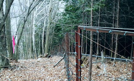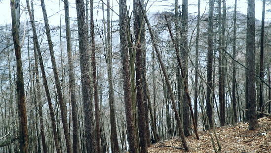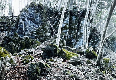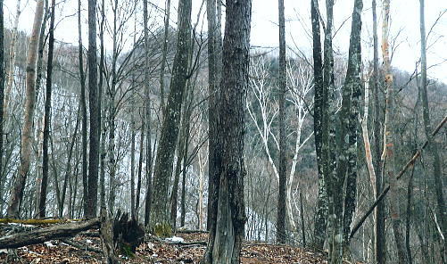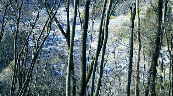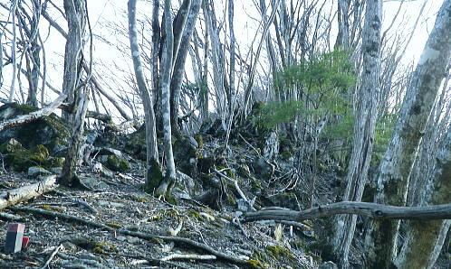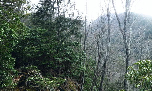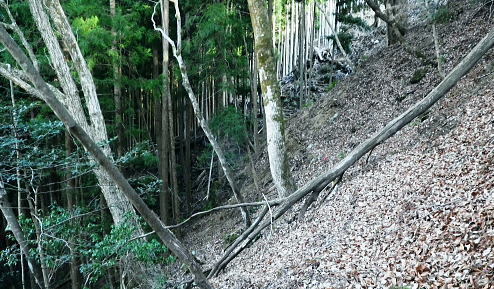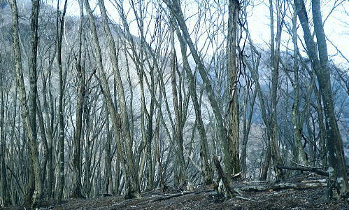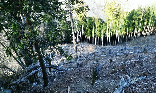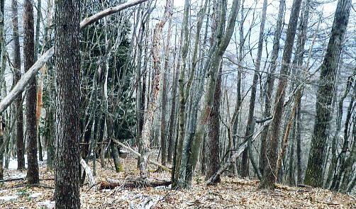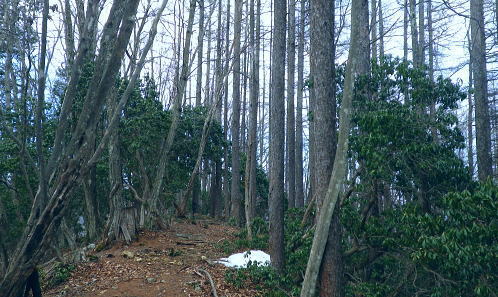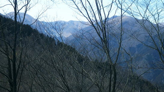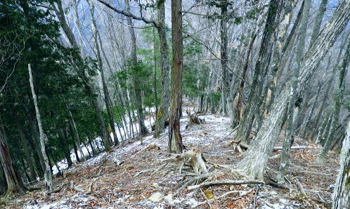 | 東日原バス停前の対岸に聳える石尾根の北支尾根群・・ 稲村岩尾根からその残る1つ樽沢尾根を下る 稲村岩尾根から積雪少ない榧ノ木尾根を変更し樽沢尾根 東日原から周回・・鷹ノ巣山から水根山榧ノ木尾根コースを諦め.石尾尾根から将門馬場樽沢尾根を下る 東日原より稲村岩尾根から鷹ノ巣尾根 石尾根.将門馬場から樽沢尾根・・モノレール軌道・目指すこと3度目にして下山 タル沢尾根のツメ 北東面を下り直ぐ現れたタル尾根.13:42鷹ノ巣山〜樽沢尾根 11:34鷹ノ巣山12:15一13:07涸沢ノ頭一13:18将門馬場:40一13:54(1297mコブ)一14:14鹿柵現れる 一14:49(916mコブ)一15::05大岩下:10一15:18旧日原右岸道一16:04無妙橋一16:17東日原bs. 樽沢尾根 将門馬場を源にカラ沢とタル沢に隔てられ.東日原バス停前の東端に没するのが樽沢尾根。この尾根は私にとっては不運の尾根だった。 12年04月.ネズミサス尾根から鷹ノ巣山にでて.石尾根の楢沢尾根の取付きに一度向うも.途中で残雪の榧ノ木尾根に魅了され水根山に戻っている。 楢沢尾根は呆気なく下山できるとふと気付き.榧ノ木尾根から広がる雪尾根に入りたく奥多摩湖へ抜けていた。 一昨年8月には再び巳ノ戸尾根から鷹ノ巣尾根詰め.樽沢尾根を周回する予定で出向いている。現地.将門馬場から北尾根を下りだしたものの. 2.3m先が臨めぬ濃霧に遭い.暫く居たが諦め石尾根に戻っている。吸い込まれそうな厚い濃霧の壁に襲われていた。 立木のマーキングも分からぬ状況に陥り.途中まで下るも尾根筋に入る最初の所が掴めず.諦め石尾根を登り返している。 今回は榧ノ木尾根・大麦尾根を下山路に選んでいたが残雪が殆どなく.逆に樽沢尾根を下ることにした。 偵察 前回は北東の樽沢尾根へ.磁石で確認しながら落葉松の森を抜けると直ぐ赤テープのマーキングが現れた。 ただその先は濃霧が流れ込み.地形が分からずマーキングを探し回るも時間ばかり費やし,先のマーキンクは全く見付けることはできなくなった。 尾根筋が分からず.足元に傾く斜面も見定められず。視界は2.3mの範囲。漸くして一つは見付けるも.赤テープの先が又分からず諦めている。 今回はひと休みする前に.北東方に10数m進めば尾根が起き上がっているのが分かり.同じ場所で.これほど簡単なルートもなかった。 それが分からなかったと云うことは余ほどの濃霧。諦めて正解だった。小コブまで進めれば難渋しながら下っても苦労だけが残されたことだろう。 以前,これも若い時だが東北吾妻山浄土平でホアイトアウトに遭い.全く動けなくなったことがある。暫く様子を伺うも変化はなかった。 頭が上げられぬ烈風の中.歩数で距離.方向を見出し.闇が迫る前に5人パーティを率いていた。偵察隊がこの時のため立てた赤旗を見付け. 安とし感激したことがある。その時の悲壮な体験は今でも忘れることはない。 狩倉山山ノ神尾根 右手.タル沢を隔て.13:48ストックを1本に変え,心地よい気分で北尾根に入る。大葉の落葉は風に吹き飛ばされたのか.足元には優しい枯れた針葉樹の尾根筋が続く。 本来なら尾根の半ば辺りまで残雪を踏むことができればトレースが築かれ.もっと深みのある楽しい山行になっただろう。 一時痩せ尾根になり.尾根を挟む谷間の両岸は雪面に覆われるも.尾根筋は疎らに残るのみ。 右手の展望は乱立する落葉松林を透し望まれた山ノ神尾根。西側の斜面は一面に雪白き山肌を現わしていた。 1370m圏コブ手前の鞍部で雪面を踏むも.直ぐ疎らになり消え伏せている。 狩倉山と石尾根 1370m圏コブより右後方のワサビ窪を望む.13:54小松チタワ・・大堀から狩倉山を巻く登山道が通っている 1290m点コブ 2つ目の植林に被われたコブ.越えると広場にでる。13:58 爽快そのものの勇み足で下る.14:03 老樹のブナの巨大倒木.14:07 ミズナラに白樺の大木を点々と見付ける.14:10 鹿棚の最上部端.14:14大白樺の立つ尾根を過ぎると直ぐ尾根筋の右側は膨らみを持ち.ワイドな広がりを見せてきた。 植林との林層の境でもあり.モノレール軌道がその縁をぐるりと回り込むよう設けられていた。又赤テープが綴られ棚扉を見る。 鹿柵は一度離れここからは見えぬが軌道と併行してをり.急坂の樹冠越に連なり見えた山々は倉沢谷を囲む山並の頭達だろう。 1170m付近で鹿棚が尾根に近ずき.モノレール軌道も併行して綴られ.ここからは尾根筋を下るようなる。 棚角に扉があるが鹿柵の左脇を抜けて下っている。尾根筋の西側縁は切れ落ち.その間を進む。随所で針金と鉄条網に交わり. 見ずらく注意を要した。作業小屋手前の急斜面は狭く.鹿柵に寄り過ぎるため.針金と鉄条網に引っ掛からぬよう気を配っている。 作業小屋977m.14:31滝谷ノ峰タワ尾根と滝入ノ峰 間がカロー谷.14:40手前が涸沢尾根 作業小屋を過ぎ急斜面に入ると一時.左遠方にカロー谷が見渡せた。綺麗に整った谷間の先の都県界尾根が見上げられた。 手前には涸沢尾根が同じような斜面を構え並行している。北面の山肌は何処を見渡しても.もう雪白さを見ることはなかった。 3つ目のコブ916m