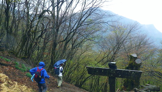 | 崩れた天候の合間からの展望と久し振り雨粒に叩かれた山行 雹に降られ高ワラビ尾根のツメから小持山を経て大持山 雨露で霞む境界尾根からは展望は得られなかったが嬉しく.又懐かしい妻坂峠から下山した・・武甲温泉と寺坂棚田からの展望 武甲山表参道から小持山 大持山から妻坂峠を経て一の鳥居へ周回・・台地を跳ね雹と寺坂棚田・武甲温泉 小持山1つ手前の小コブ 「茶平」への古い道標ある分岐.12:4112:41小持山北肩一13:29大持山一14:36妻坂峠一15:16一の鳥居p. 小コブに乗ると「←武甲山.↓武士平.小持山↑」の道票が立ち.「茶平」への古い道標を見て,高ワラビ尾根が合わさりのは間違いなかった。 ここから僅かに登り返すと細長い平頂の小持山にでる。 小持山(1273m.ソバツカド山,高ドッケ) 小持山の小さな頂では色とりどりのカッパを身に着けたハイカーと擦れ違っている。頂はで立溢れ.体を寄せ合うよう休み. 新たに足場が取れぬほど狭く飽和状態になっていた。総勢25名前後のハイカーが狭い頂で引き締め会っている。その上.雨が降り続いていた。 そこを失礼してカラフルなカッパ姿を分けるよう抜け.頂を素通りした。 大持山への露岩混ざりの稜 12:49秩父側から望む長沢脊稜 大持山の北尾根から.13:12途切れ途切れの降雨に秩父側は更に霞むも.初めて眺める都界山稜(長沢脊稜)の展望が得られただけで嬉しい感覚を持っていた。 中央の3つの小突起を抱く三ッドッケ(天目山)から北側に延びるのシャクナイ尾根を一気に秩父側に落ちるのを見たのは初めて。 ここ北尾根は昨年4月.新緑が覆う季節に仙元谷のグミの滝とカロー谷のカロー大滝を繋ぎ.小川左岸歩道へ回り込んでいる。 手前は仙元尾根の南山腹にある枝尾根に乗る新秩父線の56号〜60号鉄塔。尾根末端の60号鉄塔.基部から浦山大日堂に下る踏み跡があった。 右寄りの大きな谷間は細久保谷.大平山北尾根から東方へ峠ノ尾根を派生させ.尾根末端には新秩父線の61号鉄塔が建つ。 浦山川と細久保谷流域 左景アップ・・3つの尾根は時期相応に踏んでいる。南西方面・・蕎麦粒山.三ッドッケ.大平山.七蹴山. 右の山の3つ目が酉谷山。 大栗山.七蹴山.坊主山.日向沢ノ頭に酉谷峠を越え酉谷山が連なり.七蹴山からは大クビレ越えの大ドッケ.その後方が大平山北尾根になる。 正面を下る北尾根はジャンクションで2つの主尾根を分け.正面左に落ちるのが峠尾根.浦山川の細久保谷出合に没している。 右下に長く斜めに延びるのが栗山.三角点峰を擁する尾根で.秩父さくら湖に没していた。 その先は矢岳方面だろう。脊稜の更に奥は芋ノ木ドッケになるのだろうか? 仙元峠仙元尾根・・枝尾根に乗るの送電線は真名井北稜から長沢脊稜越えてきた新秩父線56号〜58号鉄塔。 三ッドッケ北尾根のシャクナイ尾根。昨年4月に細久保谷左俣仙元谷から詰めている。その上が七蹴山から大平山に延びる峠ノ尾根。 その広い尾根の裾尾根に連なる送電線鉄塔群. 小持山からの高ワラビ尾根 右景・・右後方を振り返り浦山川を隔て浦山川左岸の大神楽沢流域を挟んでの展望。大平山.矢岳に続く上部(西)中央寄りが熊倉山. 大平山北尾根.大ドッケから派生する尾根二又西方尾根末端は浦山川左岸の各支尾根に乗る新秩父線で.新山梨開閉所と結ばれている。 小持山から大持山に掛けては細かい起伏に痩せ尾根と露岩帯を示し.アカヤシオの咲き競う稜とも云われている。 ただ今回は殆ど全部と云えるほど蕾の間々で.咲き競い合う姿を見るには早々過ぎていた。まだカタクリの方は小さな可憐な花を咲かせていた。 それも頂稜での点。点としても僅かでカタクリも同じ状況だった。群れと云うより疎らな1点に過ぎず。 登山道脇に仄か珍しく姿を現したと思えば.足元の枯葉から覗く小さ過ぎるカタクリを見る。 本来なら爽やかな風に揺れ動き.薫風の季節になったと肌で感じる時期だが.今年はまだその1つタイミングにも合わなかった。 右手手前に延びるのが高ワラビ尾根. 巣山ノ頭1090mから南(左)に延びる支尾根はタワノ尾根。この下流で更に大塚尾根と分けている。 仙元尾根末端の鉄塔は60号鉄塔だろう。基部から下ると浦山大日堂にでる。その上部に乗るの北尾根は三ッドッケに乗るシャクナイ尾根。 浦山川大神樂楽沢東沢源流 足元から湧き上がる谷雲山稜は大持山西尾根と右手の山稜は雨乞岩から西方に延びる905m点尾根 大持山 別名.赤原山.13:29大持山・・三等三角点標石1294.10m..基準点は「持山」. 小雨が降り続く中.弱くとも風が流れ込むと素手では.微妙な寒さを感じるようなる。すると白い氷粒が落ちてきた。 大地に跳ね転がる姿は雹。小さ過ぎる丸い小粒が風に押され崩れては大地に当たり跳ね上げる。最近では何時出会っただろうか? 寒い筈である。 大持山西尾根 方向から見ると南西尾根。南尾根(山ノ神尾根)は1142m点コブから南尾根と分かれ.又カタクリの多く咲く尾根とも云われている。 送電線安雲幹線342号と奥秩父線16号との基部を抜け.尾根が浦山川沿いに下りてから見上げると鉄