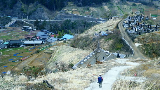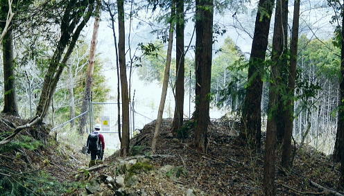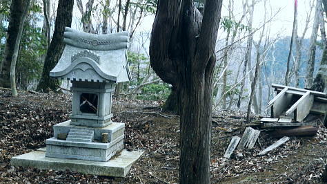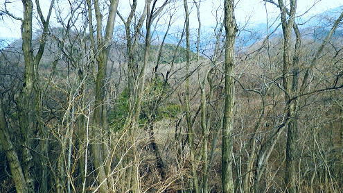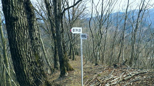 | まだ冬木に被われる阿夫利山と富岡の棚田 安寺沢左岸尾根と金剛山北東尾根 井戸沢ノ頭から右に折れ安寺沢左岸尾根を忠実に下り金剛山北東尾根―末端の棚田から県境を越える・・津久井のバス停「奥牧野」 神野.栗谷林道から御牧戸山北尾根 大タギレから金波美峠を経て阿夫利山 井戸沢ノ頭から金剛山北東尾根・・富岡の棚田と2つの系列の別.奥牧野バス停 阿夫利山々頂.14:32阿夫利山から金剛山を経て富岡から奥牧野 阿夫利山14:32一14:56井戸沢ノ頭一15:20金剛山一15:41鹿柵扉一15:43展望台16:05一16:18秋山大橋 一16:35奥牧野bs⇔秋山川前川橋・・次回の下見. 頂でヒョッコリ.奥牧野から綱子川沿いに大平山を越え.平野峠を下り返し.登ってきた単独行に出会っている。 前川橋は立派に改修されたとのこと。下山してから次回は綱子川の両岸尾根を周回するため.同名の2つのバス停「奥牧野」と共に 前川橋を確認しようと考えていた。 「綱子川左岸尾根は大きな3階建てのビルを過ぎると小さな道標があり.渡渉して大平山にでている。ここは尾根末端から登り詰めている。 平野峠辺りは迷い易い。」と云い残して彼は通り過ぎた。この後も.幾度となく彼と出会う運命が待ち構えていた。 袖平山 この地点からは相変わらずピラミダルな山容を誇る.14:34阿夫利山の山頂は灌木に囲まれ.南西だけが切り開かれている。御牧戸山肩から眺めた袖平山はここから 飛び出るよう突き上げていた。正面の下りる尾根は神ノ川ヒュッテpからの風巻尾根。手前に隔てるのが安寺沢右岸尾根。 大室山東面の神ノ川流域に入りたい願望はあるものの.交通の便を含めまだまだ知らなすぎる山域だった。 阿夫利山南尾根の取り付き.14:47道標は「←富岡バス停・秋山温泉・阿夫利山↓」とある。 南尾根分岐・・頂からの下りは北東へ急下降し.一度阿夫利山の東側山復を巻く道と合わさり. 南尾根の取り付き地点には市のL字道標が立ち.従い下っている。右手は高見山方面からの巻き道になる。 正面は阿夫利山南尾根が安寺沢沿いに落ちている。確りしているものの藪尾根. 下れば林道金波美線で金波美沢を左岸に渡り.最初に左へS字状にカーブする東側にでる。700m圏と650m圏で東側に尾根を派生させていた。 縦走は尾根の西縁沿いを確認しながら下ればよい。巻き道の分岐を左に折れれば山腹を巻き北東に延びる主尾根にでられる。 井戸沢ノ頭と金剛山 右下の安寺沢の谷間に集落が見下ろされる.14:48穏やかな小広い井戸沢ノ頭 雑木に覆われ展望はない.14:59道標には「↓阿夫利山・富岡バス停.秋山温泉←」とある富岡へ直接下りる分岐。又富岡バス停.秋山温泉とある。 南北250mの高低差のない地形が広がる台地は井戸沢ノ頭.670m圏コブ。又富岡の分岐.ここは左に富岡方面に折れず. 直進して金剛山へ下る。石祠を通り573m点コブへ続く北尾根から東に回り込むと北東への尾根を分けている。 右に折れ南東へ安寺沢左岸尾根を進み尾根伝いに左に大きく回り込む。すると金剛山637mへと綴る確りした踏み跡を 歩むと市の道標はここまでのようだ。踏み跡から作業道.そして金剛山からは参道へと開かれた山道を下る。 井戸沢ノ頭から北北西に進む尾根は410m圏で2つの尾根に分かれ北東を選んでいる。 草深くなり330mで右後方からの道を合わせ.左奥に廃屋を見て井戸沢を渡るとT字路林道から富岡の金山神社にでられた。 金剛山と590m圏付近 左は直進尾根.右は大きく尾根筋を回り込み金剛山へ.15:02左手の富岡方面に行かず.右手の金剛山を大きく回り込み.それから富岡の棚田に降りるコース。 金剛山南尾根と安寺沢の集落 590m圏コブ付近より.15:05金剛山 樹林に覆われ何も見えず.富岡方面を望む石祠.15:20頂手前の露岩帯を過ぎ金剛山へ。金剛山の頂632mには崩壊した木祠「刻印」があり.その中央側に真新しい「古峯神社」と彫られた 石祠が祀られていた。石祠は富岡方面を向くも.樹林に囲まれ眺望はない。その左手.裏側から登り着いている。 又右脇の壊れた木祠は放置された間々だった。寂峰の藪山と呼ばれていたが今は開かれ.既にその雰囲気はなかった。 この「古峰神社」は栃木県の古峰ケ原神社の分社。前日光の地蔵岳や薬師岳などの登山口.その近くに修行の山. 金剛山瑞峰寺というのがあった。ここはその分社にあたるようだ。金剛山の分身を古峯に祀ったことから金剛山とか. 古峯神社と呼ばれている。江戸時代以降.関東各地に古峰講が組織されていたと云われていた。 この10年.地元の人により参道が整備されている。東肩から植林帯の斜面をジグザグに刻む参道は ゆとりある広い道幅で造られていた。現在は藪絡む気配は大分失わさせている。 反面.この参道を下りは谷を下り始め.馬の背状の尾根は両側が沢の形を取り.途中から.左手正面を見つつ下る北尾根。 荒い起伏が目立ち.初めは道形が不明瞭で.藪絡みの踏み跡の尾根になっていた。 尾根末端は暮ケ沢林道がZ字にUターンする角にでて.降りる最後の擁壁は右側に回り込んで林道に降りている。 370m.ただこの尾
