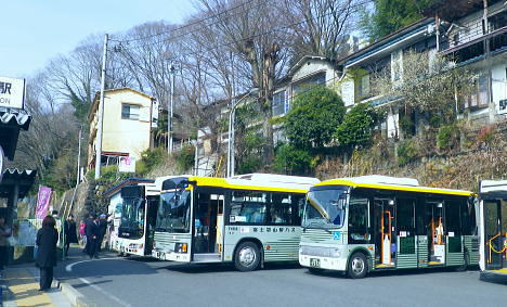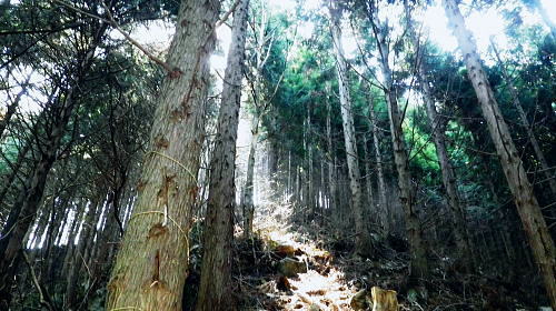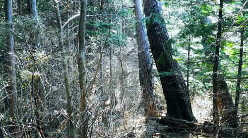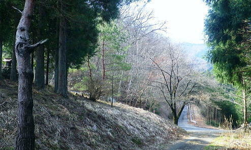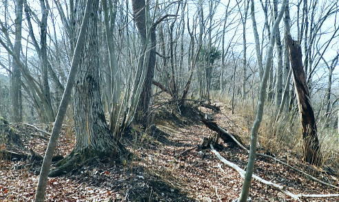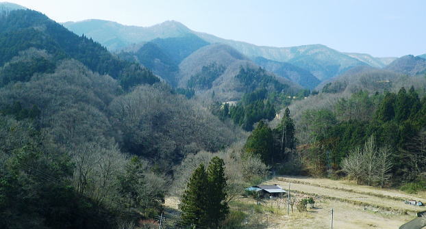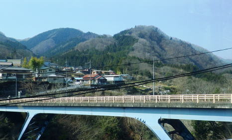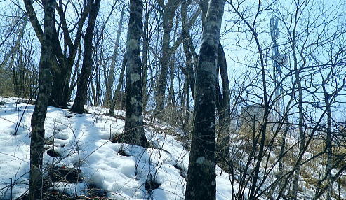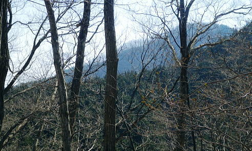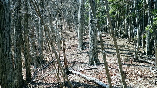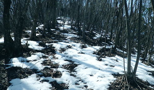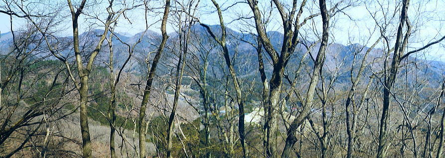 | 旧秋山村.端東奥の低山4. 御牧戸山と阿夫利山.金剛山・・旧秋山村の東端周辺Top 神野栗谷林道から秋山川右岸尾根沿いの安寺沢左岸尾根を末端の富岡の棚田まで綴る 御牧戸山北尾根から安寺沢左岸尾根.大タギレを下り返し.山之上・金波美峠・阿夫利山から金剛山北東尾根 2017年04月05日.松村 栗谷.釣場bsから御牧戸山北尾根・・県境越しの2つの「奥牧野」バス停・自衛隊ヘリ軍団・頂は幾つもの電波無線塔 大タギレから金波美峠を経て阿夫利山 井戸沢ノ頭から金剛山北東尾根 武蔵.武甲山のOB山行の延期に伴い.先々月に訪れた高柄山中尾根から左後方に遠望された旧秋山村の低山を改めて綴ることにした。 前回登った高柄山中尾根からは新大地峠へと延びるデン笠・金ピラ山の低尾根が並行し.又そこを越える背には 阿夫利山を擁する尾根が重なるよう望まれていた。 今回はこの尾根伝いに道志の主稜.御牧戸山から安寺沢左岸尾根を綴り.阿夫利山を越え金剛山から富岡の里に下りる。 入山のアプローチとして.バスの車窓からは前景に阿夫利山が.その背には旧秋山村の綱子川両岸の山並が重なり合う姿で眺められていた。 道志川で隔てられた北丹沢山地.県界尾根の山々が堂々とした姿も見上げられている。それが御牧戸山に立つと更に間近になった大室山. 加入道山の雪白き煌きが.怒涛の如く押し寄せた。競り上がる姿を見せつけている。その御牧戸山からの山稜を延々と歩み下ることになる。 旧秋山村 道志山地東側の旧秋山村の流域には奥牧野を起点として.安寺沢川と網子川の出合の秋山川付近から旧秋山村の境界尾根を含め3つの尾根が 並行するが如く起き.まず高柄山中尾根から間近に聳える安寺沢左岸尾根にある阿夫利山を秋山川沿いの御牧戸山から綴る。 前回の登山口の「落合入口」バス停から更に秋山街道を先へ進み.「釣場」バス停まで足を運び.入山は御牧戸山北尾根を選んでいる。 下山は秋山川と安寺沢川に挟まれた尾根から末端に繋がる金剛山北東尾根を下り.東京近郊では珍しい棚田の山村風景を見下すことにした。 「前道志」と呼ばれる山域は道志山地の最東端に位置し.山梨県南東部の県境にも当たっている。上野原市の旧秋山地区に繋がる山並で. 旧秋山村は山梨県上野原市と神奈川県藤野町との境をなす。南都留郡秋山村が上野原市と併合されたのは2005年.僅か12年前のことだった。 取付いた道志主稜に聳える御牧戸山の南面は道志みち側で.道志七里と呼ばれ.東西に細長く広がる道志村が広がっている。 道志川の対岸は甲相尾根が連ね.そこからは真近に北丹沢の雄大に聳える大室山が望まれた。 今回は春雪残る御牧戸山から奥牧野へと主尾根を末端まで綴る。ここは低山を繋げる幾つもの細尾根と絡み合い. 裾野の広がりは分かりずらい丘陵を持つている。下山のアプローチは県道517号から藤野丘陵にでることにした。 釣場バス停から御牧戸山北尾根を目指す jr上野原駅北口の高台ターミナル.8:194月05日(水)快晴.午後風強く曇 jr御徒町6:22=6:26東京.中央特快:32=7:32高尾.河口湖行:47=8:06上野原.富士急山梨バス無生野行¥680. 8:30=9:06釣場bs.490m 今回は路線バスがアプローチ. jr上野原駅北口広場は雲1つない蒼空に恵まれている。ただ朝方から霞みが強く.8時9分発.新井線行バスが 広場を発車した。駅前広場には奥から飯尾線.井戸線に無生野線の路線バスが整然と並び.それぞれが8時30分発を待っていた。 後続のバスも次々と広場の片隅に集まり.数えると10台もの大型バスが駅前広場を埋め尽くしていた。何時も見る風景なのだろう。 時刻に合わせ整然と発つ姿は異様にも思えた。最初に発ったのが無生野行バス線. この線のみ座席は少なく.12名ほどの小型乗合バスに7名が乗り込む。 420m圏コブと鶴島御前山 駒門地区と桂川.桂川橋.8:58秋山街道 秋山街道に入って桂橋を渡ると橋の袂に友鮎の大きな看板と遊漁場があり.上流側には御前山の雄姿が見上げられた。 対岸の鶴島.南区地区を抜けて山間に入ると左側の谷間に土堀場を見て.路線バスは新天神トンネルと分かれ.右脇の狭い旧道を進む。 そして短い天神隧道を潜ると下田野で再び秋山街道に戻っている。道幅は街道を含め.奥牧野に至るまで狭く,超スローで運行されていた。 車の擦れ違いには慣れと要領を要している。ましてバスの擦れ違いは定められた所以外は無理のようだった。 2つの「奥牧野」バス停 今回は落合入口で街道の右山を潜る村内沿いの秋山トンネルへ続く県道を分けている。この車道は先で.落合集落への里道とも分けていた。 前回は落合までタクシーを利用し県道を走っている。又金山川沿いの里道を歩んだことで.この辺の地形は大分詳しくなった。 路線バスはそのまま街道を進み.下田野入に入ると更に狭まった街道は金山川を渡り.県境(神奈川県相模原市)を越え.藤野奥牧野に至る。 左手からやまなみ温泉から綴られた県道517号とぶつかるT字路の角が富士急山梨の「奥牧野」バス停だった。 更に直進して街道を進むと県境手前で大きくカ