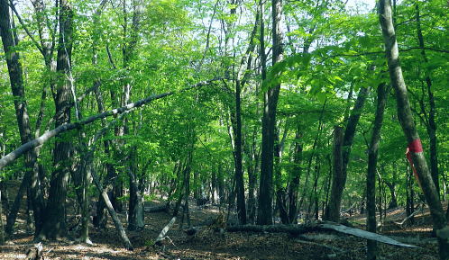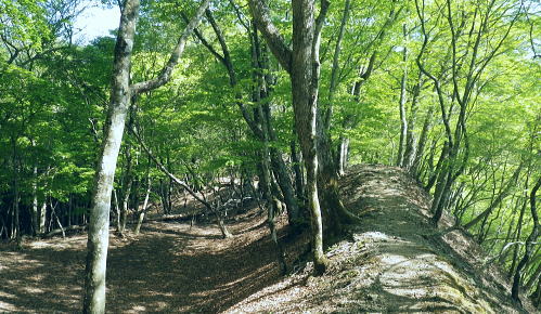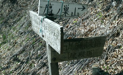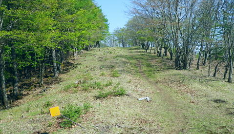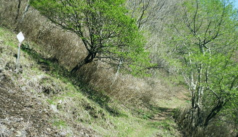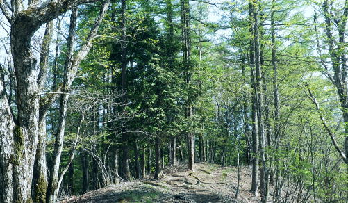 | 奥多摩石尾根.高丸山ツバノ尾根から戸倉山北よりの藪絡む大麦尾根に入り奥多摩湖ダムサイドへ 奥多摩.日原林道から石尾根の高丸山ツバノ尾根を詰め.日陰名栗山から鷹ノ巣山の南山腹道を巻き.石尾根からは水根山から榧ノ木尾根を選び 倉戸山に出てからは北側に大麦尾根を見付け.直接湖畔の「水と緑のふれあい館」へ降りる。 日原林道から高丸山ツバノ尾根 日蔭名栗山を越え鷹ノ巣山南側経路から榧ノ木尾根.大麦尾根・・湖畔ダムサイト 頂も大らかな台地 防火帯の高丸山の頂.13:48欠けてしまった山名板 奥秩父と石尾根七ッ石山方面 山頂を跨ぐ石尾根.13:51石尾根から雲取山.飛龍山へと。手前は七ッ石山赤指尾根.登り尾根.中指山 高丸山から小河内ダム 13:48高丸山一14:04東側鞍部.南側山腹道一避難小屋一14:39鷹ノ巣山南側経路の分岐一14:58榧ノ木尾根分岐 一15:24ノボリ尾根分岐一16:00倉戸山一16:24大麦尾根一16:42展望台散策路一17:15奥多摩湖bs. 三頭山町村界尾根・・倉掛山.砥山.三頭山 高丸山東側の防火帯斜面より.14:39左奥が笹尾根・・浅間峠から大ツイジ. 見ずらいが湖畔の峰谷川出合に赤い峰谷橋が見下ろされた。 石尾根防火帯・・日陰名栗山との鞍部 鞍部から右手の巻き道.縦走路に入る.14:04巻道山腹道 防火帯の鞍部から南側の巻道に入いる。薄日の照り付ける木洩れ日を綴る道。 暫く巻道を歩み林班界標柱「79/ー」を見て.右手を見定めていると踏み跡の取付きには2本の枝木が並び置かれていた。 ここが日陰名栗峰南尾根の取付きで.下ればモクボ谷785m.峰谷林道にでる。 本来の計画ではここから南尾根を下る積もりでいた。ただ中途半端な時間に下ることになる。峰谷発の最終バスは16時55分 それ故.出発直前に食事を自炊から弁当に換え.奥多摩湖ダムサイトまで.新緑の青葉溢れる森を綴り下ることにした。 歩き易い山腹道を歩むこと500m. 巳ノ戸の大クビレで一度尾根筋と合わせ.下れば鷹ノ巣山避難小屋にでる。1年半振りの再来になろうか? 又200m先の水場から浅間尾根を下れば奥集落から峰谷バス停に下りられる。私は石尾根縦走路とも別れ.南山腹の日溜まりを求め榧ノ木尾根に入る。 鷹ノ巣山南山腹道 鷹ノ巣山南側を巻く経路の分岐付近.14:39緩やかな長い日溜まりには「奥多摩区分78|」林班界標が立つ. 常に日差しがあり.枯タケが覆う入奥沢源流の斜面を横切る。幾度となく通い続けている作業道でもあるが.まだここでハイカーと 擦れ違ったことはない。長閑で静かな山腹道. 淡い若草色の若葉が大地に沁み込む季節になってきた。足元は緩むが先はまだまだ長い。 水根山手前の防火帯と経路の分岐点.15:54この辺からの道標は追加されたり.旧登山道の崩壊で腕木が切られている所も多くある。 鷹ノ巣山山腹道 水根山手前の贅沢な巻き道.14:55下草 5月も半ばを過ぎたとは言え.石尾根は尾根筋も南面の山復道も.まだまだ新緑の若葉覆う世界とは遠く隔てられていた。 樹葉の瑞々しさだけでなく.下草ももう1つ薄い。色とりどりのスミレは見忘れる前に又咲いていた。ツツジ類も咲き始めたが斑過ぎこれからになる。 日当たりの巻き道は幾らか若草色に大地に変え始めていた。ツバノ尾根の尾根筋も殆どが裸土で.下草はまだ見当たらず。 もう少しまとまるには湿り気が必要な時期と思われる。前線は今.遠く太平洋沖合に押し止められていた。 もう2週間ほど経てば下る榧ノ木尾根や大麦尾根も.新緑は枝々だけでなく大地を這い.覆われるだろう。 瑞々しい下草を踏むようなれば小鳥達の囀りも多くなる。 榧ノ木尾根分岐 石尾根巻道分岐と林界標柱「奥多摩区分77/62」.14:58初夏を思わす陽射しの榧ノ木尾根 昨日.今日と乾き切った台地.14:59六ッ石山への南山腹道分岐 「奥多摩分岐76/62」林班界標.15:07右手は六ッ石山山腹道に入ると将門馬場近くで,石尾根の縦走路と結ばれている。そこから小中沢の経路に結べば面白いかも。 途中で水根林道への分岐に合わさった。一昨年はヤケト尾根を詰め水根谷林道を下り.コースタイムの間違えから日没と競走している。 更に尾根伝いを倉戸山へと下れば.直ぐ先に入奥沢への腕木のない道標がある。ここは閉鎖されたロープ越えで入奥沢中腹道に抜けられた。 入奥沢右岸道から奥の集落にでて.奥沢林道.峰谷林道と結ばれている。その下に今日降りる筈だった峰谷のバス停がある。 榧ノ木尾根の二重山稜.15:10ノボリ尾根分岐 手前が切られた榧ノ木山の南寄りの道標.15:24榧ノ木山裏側の分岐 登山道が尾根の左へ反れると榧ノ木山の頂肩を捲いてしまう恐れのある小さな頂に立つ。 狭い山頂にこれ又色褪せた赤テープが立木に巻かれ.金属の板にポンチで榧ノ尾山と打ち込まれていた。 大きさの割には地味な頂. 榧ノ木山と知らずして通り過ぎてしまう人も多いだろう。 頂から南肩へ下ると間を開けず巻道の登山道と合わさり.道標の裏にでる。「←石尾根縦走路,鷹ノ巣山.六ッ石山. 倉戸山・熱海→」が立ち. ノボリ尾根を指す道標の腕木だけが今だ切り落とされていた。榧ノ木山ノボリ尾