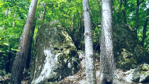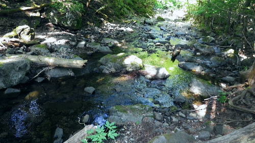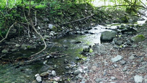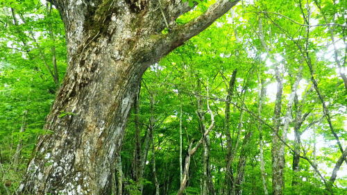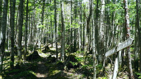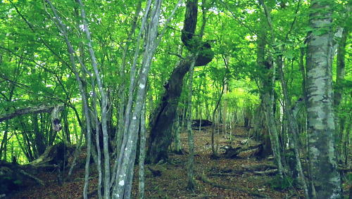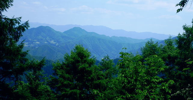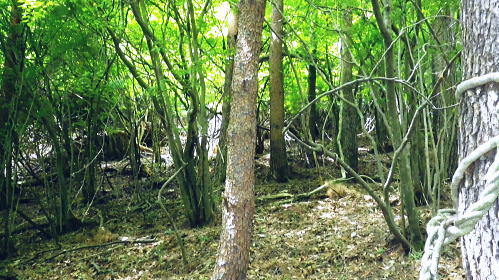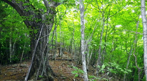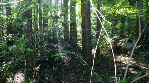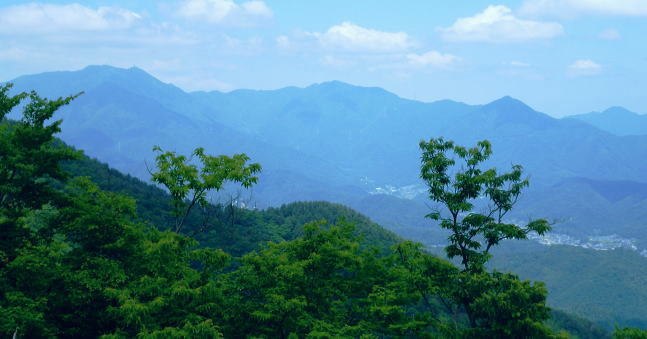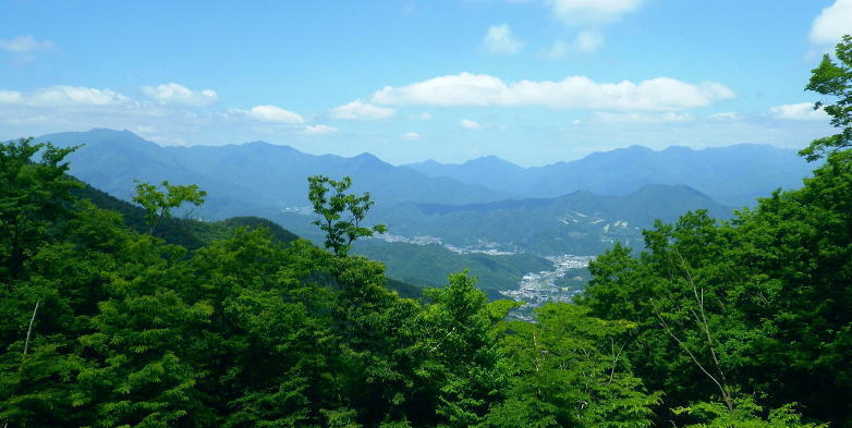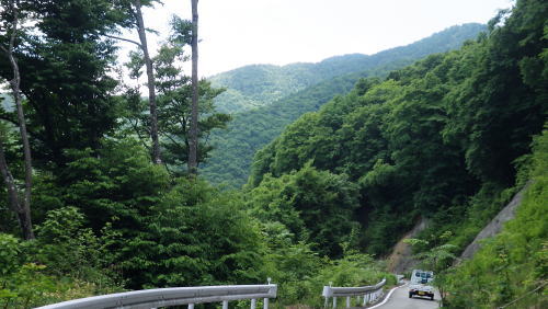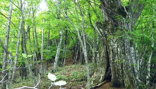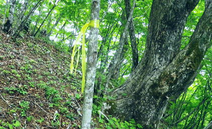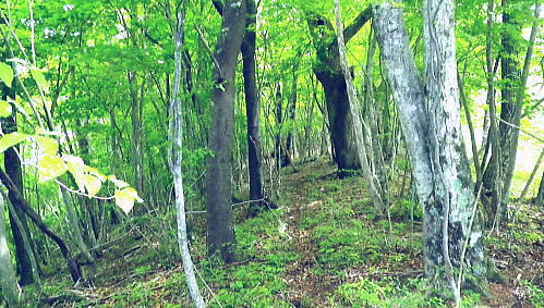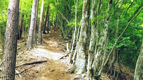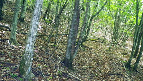 | 都留二十六夜山. 月待ち信仰の山と今回は松山北尾根に右支尾根から登っている。 ・・道志主稜の北尾根群Top 道志.今倉山稜の1410m峰の北.西尾根から入山し.二十六夜山へと繋ぐ。 御座入山北尾根から猿焼山へ下り「芭蕉の湯」に訪れてから6年振りになる北尾根. 入道P1コブを経て今倉山稜の1410m峰にでる。 戸沢川源流から410m峰北尾根左支尾根(西沢左岸尾根)から二十六夜山西尾根. 下りは引野田.富士急赤坂駅 2017年06月17日.松村 戸沢川から1410m峰北尾根の左支尾根・・親子鹿・前回は1410m峰北尾根の右支尾根を詰める 主稜から道志二十六夜山西尾根を越える 今倉山稜と二十六夜山 国道ふじ道.赤坂交差点より.15:34今倉山稜の中央から手前に下っているのが1410m峰北尾根で.今回は左支尾根を選んでいる 戸沢川上流南岸の山々 下山してから富士急赤坂駅前の国道赤坂交差点からの遠望。 左端の支尾根から綴り松山を越えて.菅野盛里線を2度横切り.右端の二十六夜山西尾根の支尾根を下っている。今回の山行の全コースが望まれる。 今倉山稜の左側2本目の尾根が松山北尾根の右・右支尾根,右手の頂点が二十六夜山北尾根と西尾根。 山腹を刻む直線は林道菅野盛里線で.今倉山西峰(御座入山)北尾根手前まで両側から開削中だが開通はまだまだ先にようだ。 本来は西ケ原ノ台1246m点.本流東沢右岸尾根を詰めて.西峰の北尾根に合流する積もりでいた。 それが取り付き地点の間違いと南南西に尾根筋が延びているのを知り.左に回り込むと安易な考えが再び入道P1コブに立つことになる。 細い小沢の間違いから6年前に右支尾根を登っている。その合わさるコブの東側の枝尾根から詰めている。 以前の漠然となってしまった所を改めて登り,詰めた北尾根では巨樹の立木群に再会している。 6月17日(土)晴 jr御徒町¥1490, 4:49=4:53神田5:00=豊田6:06=7:06富士急大月.¥460,.:22 =7:37都留市.ツルタクシー¥2330=7:50「芭蕉月待ちの湯」. 1410m峰北尾根の右支尾根と二十六夜山北尾根1014mコブ 戸沢川林道より.北岸沿いの尾根末端を振り返える.8:05「芭蕉月待ちの湯」から1410m峰北尾根の左支尾根 7:50「芭蕉月待ちの湯」一8:23本流取り付き一9:00左支尾根に乗る一9:51入道,第1コブ一10:25菅野盛里林道一11:29今倉山稜1410m 富士急都留市駅の改札口前で予約していたタクシーに乗り込む。菅野川本流を右手に分け,支流の戸沢川を遡る。 10分ほどで「芭蕉月待ちの湯」に着いている。運転手からここから何処へ登るのか尋ねられる。「この北側の尾根を登る!」と答えると 「登山道がないよ!」とトンチン感に思ったらしい。道がない所を登ると云った方が分かり易かったかも。 「気を付けて!」の言葉に.「ありがとうございます!」と答え後にした。 朝方の眩い日差しを浴びている。「芭蕉月待ち湯」590m,周辺には施設が整っているもののまだ人気もなく,閑散とした風景が広がっている。 「芭蕉月待ち湯」の隣り都留戸沢の森「なごみの里」は,芝生の原っぱが広がり.緊急用ヘリ離着場にもなっていた。 渡った右岸から振り返り.8:08舗装が途切れると左手は「せせらぎ荘」口へ。右手に分ける幅広い道は右に坂を回り込んで,直ぐ上の高台で行き止まっている。 ここは2011年7月に1410m峰北尾根の右支尾根に登った折.取付きを探し偵察していた。 直進して少しジャリ混ざりの裸土の林道に入ると直ぐ.戸沢川に架かる鉄板とポールの手摺りで造られた橋があり.右岸に渡るっている。 写真左側の右岸ヘチ沿いから薄い踏み跡が右岸沿いにある。選んでみたが藪絡みで手間が掛かりに戻っている。 戸沢川本流右岸沿いの薄い踏み跡口.8:09戸沢川 左岸沿いは松山北尾根の左支尾根が没している.8:13猿焼山登山口と反対側の河原を覗き込む 橋を渡って70mほど先に市設の「登山道」があり,左手に猿焼山西尾根に入る登山口を見送っている。 以前松山北尾根から城ケ丸へ周遊し.雷鳴に追われて檜の植林急斜面を駆け下りている。そして土砂降りの雷雨を露天風呂で受けた覚えがある。 又その後は前道志からサイマル山を経て.城ケ丸北尾根に突き上げ,西尾根を下り富士急赤坂駅にでている。 一度道標前,林道の反対側,戸沢川左岸の河原に下りてみた。この上流側に堰堤と貯水池があるようだ。 林道から堰堤の左側を巻き,河原に降り立つと左前方に今倉山西峰北尾根の一段と高くに聳えるバラジマ沢ノ頭が見上げられた。 戸沢川二俣を過ぎると林道に橋はなく,浅いゴーロ状の東沢を浮石伝えに左岸に渡ると.ここは既に西ケ原の台に突き上げる尾根末端になっていた。 林道は道幅広く更に確り登っている。 渡渉した先で旧作業道の分岐にでている.8:23分岐を右に折れ下れば西沢に突き当たる 「芭蕉月待ちの湯」から20分ほどで林道の右脇に.不思議な場所と出会う。「遊山拍」と称し.奇怪な案山子が立ち,「遊山そば」ともある。 民宿か? 駐車場が広く.「監視カメラに,立入り禁止」.「この先行き止り」ともある。この足元の尾根が本来の西ノ原の台から延びる東沢右岸尾根だった。 ここは後に分かるが本