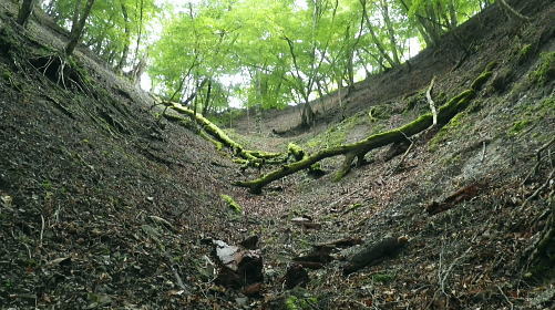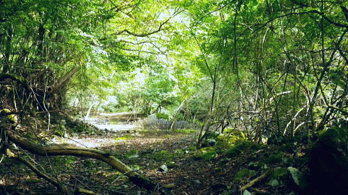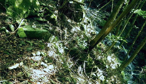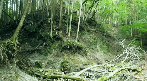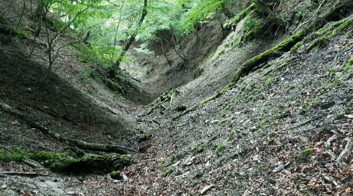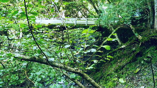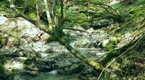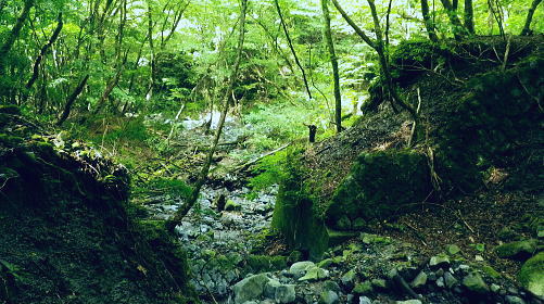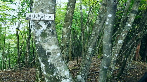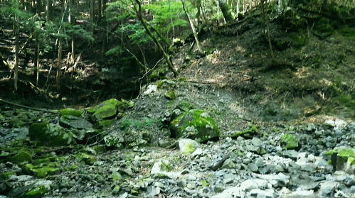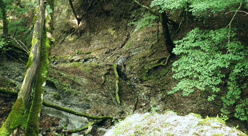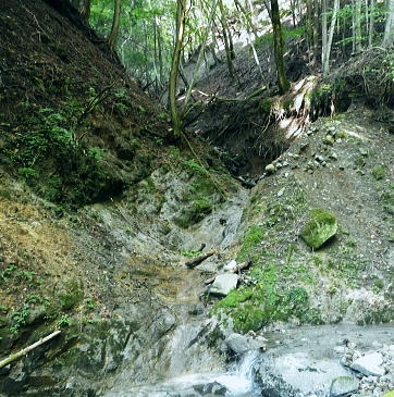 | 権現歩道・・地蔵平から大又沢右俣を遡り大滝峠へ 大杉歩道から地蔵平―地蔵平から権現歩道で上流の関ノ沢.権現沢を遡り大滝峠へ。屏風岩山東尾根は諦め.再び二本杉峠へ戻る 二本杉峠から大杉歩道を経て地蔵平 権現歩道から大滝峠前・屏風岩山と二本杉峠 地蔵沢林道・・左岸道 地蔵平からの立派に保持された林道.12:04地蔵平11:55一12:30大滝沢橋一13:20大滝と堰堤上一14:04三俣一14:28大滝峠下950m一15:02屏風岩山 一15:50二本杉峠一16:47細川橋bs. 大又沢二俣で地蔵沢とイデン沢に分かれる地蔵平からは2つの林道に分け延びている。 地蔵平で富士見橋を渡り西側に延びるイデン沢側の法行沢林道は白水橋を過ぎ.更に北側と西側の2手に分かれていた。 地蔵平北側の地蔵沢左岸沿いに延びるている地蔵沢林道は地蔵沢から派生するセキノ沢沿いに回り込み.大滝沢橋から戻るよう甲相尾根へ北上する。 今回は地蔵平から林道に入り.大滝沢橋で林道と分かれ.セキノ沢左岸から古道「権現歩道」に入り.大滝峠を目指すことにした。 地蔵沢林道・・右岸道 右岸に渡った林道跡.12:07林道の右岸道 林道としてはっきり分かるのは地蔵平から北上すると直ぐ.信玄平から城ケ尾峠に至る尾根筋の踏み跡を左に分けている。 徒渉する本流の河原.直ぐ上流側で地蔵沢と支流のセキノ沢の出合がある。。 林道を更に進むと正面にセキノ沢が回り込み突き当たる。林道は途切れて,対岸に渡っている。ここまでが手入れの行き渡る林道だった。 渡渉した対岸の右岸に至ると林道としては.路面跡が広い意味で.平坦な空地として残されている。 ただ平坦地な路面を見付けるだけで異常を感じ.周りの茂みは荒々しくなっていた。広い平坦地もチョッと外れると樹林のジャングルになっている。 大又沢に人が住んでいた頃の地蔵尊はオバケ沢とセキノ沢との分岐点からセギノ沢に寄った高台(マルサン平)に安置されていたと云われている。 ここ右岸上部の高台がマルサン平だろうか? 大滝沢橋を渡った先の林道.744m点コブ付近の南側がマルサン平か? セキノ沢.最初の堰堤.12:11現実的に維持している林道はそう長く続かなかった。直ぐ右前方に堰堤が望まれる。 上部にある筈の広い林道は痩せ狭まり.失われている。直ぐ痩せた狭い踏み跡に変わり.堰堤の左脇の高巻きを抜けている。 堰堤で留められた上部は広い平坦な河原が開かれ,左岸に戻る林道の渡る地点を示し.見渡される対岸の岸縁も広く切り開かれる。 荒れた台地が続き.更に左岸の上流側に延びているようだった。 地蔵沢林道 再び対岸に見付けた左岸の林道跡.12:14林道はこの先で大崩壊地のガレ場へと続く。 林道の法面は殆どが崩れ.林道の道端は岩屑やゴロ石が散ばめられ.雑草は生え放題の幅広い林道で.造形を示す姿は形を失わさせている。 又脇を流れる枝沢周辺は流失し寸断された石積みが崩れていた。跡形もなく.本流を渡るゴーロ状の所にも.全く見る影はなくなっていた。 左岸道の高台845m.12:21稀にほぼ現状通り維持しているカーブミラーと林道路面 大滝沢橋への道中.一番まともな姿で林道が残されていた所があった。 大きなカーブミラーはガラスはないものの.ほぼそのままの姿を現わしている。標柱には「平塚営林署」の文字が読めた。 正式名は関東森林管理局.東京神奈川森林管理署,平塚営林署となり.国有林事業に左右された地域。 明治から入植され次第に栄えた伐採事業は一度大震災で衰退するが.その後.世附森林軌道の終結する昭和35年まで大きな影響を受けている。 左岸の枝沢出合 林道の橋があっただろう崩壊地跡.12:25大滝沢橋 崩壊地から見る林道のコンクリートの大滝沢橋.12:29古道 地蔵平から大滝沢橋との間を綴る林道は本流に橋を造らず.左岸に戻るには2ケ所で自然を利用した平坦な河原を横切っている。 そして林道は大滝沢橋で右岸に渡り.地蔵沢沿いに入っている。この東詰から林道と分かれで.セキノ沢左岸沿いの権現歩道に入り込む。 セキノ沢の上流は権現沢と沢名を変え.権現沢に沿いに支流を遡っていた。この古道は大滝峠に至る権現歩道といわれる。 大滝沢周辺は県有林で.大又と同様に炭焼きに従事する部落があり.3~4家族が一組になって家屋に住んでいた。 場所は東電の取水口の少し上と一軒屋避難小屋付近。大滝沢にも分校があり.15人位の生徒がいた時があり.の前は大又分教場まで通学していた。 雨や雪が降ると峠越えのため.大滝沢の生徒は休んでいる。この歩道は大滝澤集落と結ぶ生活道だった。 ただここで云うコンクリートの「大滝沢橋」は位置からして.今では分からぬ橋名になっていた。箒沢側には「大滝橋」があり間際らしい。 又沢名も漢字では「堰ノ沢」.「関ノ沢」とも表示され.橋の前後に2つの堰堤があり.その意味か如何かも分からないでいる。 大滝沢橋を渡った先の林道から地蔵沢左俣の源流へは1084m点に至り.古道の奥野歩道と結ばれ信玄平付近に至っている。 右俣は水晶沢・バケモノ沢を横切る奥野歩道(廃道)があり.幾つもの枝沢を横切って