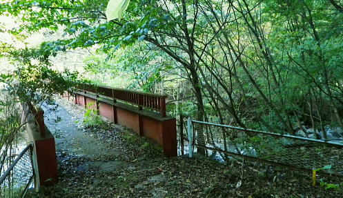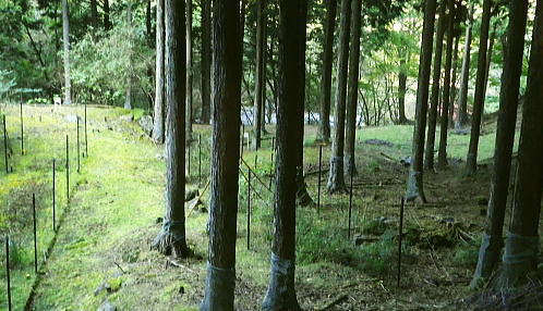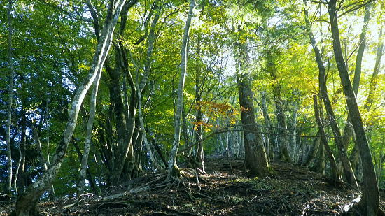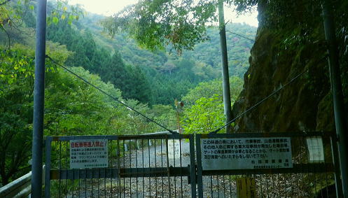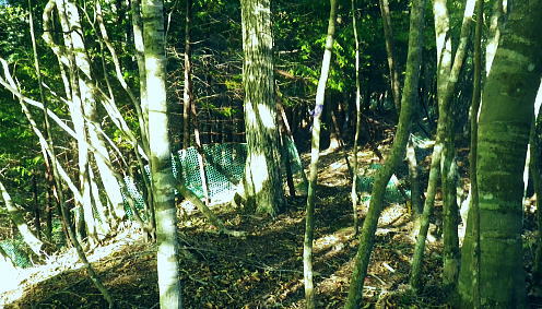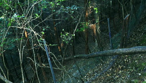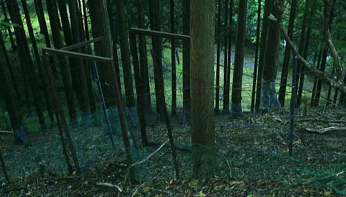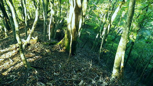 | 畦ケ丸からのモロクボ沢右岸尾根・・塩地窪ノ頭北尾根から白石沢との出合に至る 大らかな自然林の疎らな台地. 塩地窪ノ頭の頂から北尾根を下り.後半は鹿柵絡む尾根筋に変わる白石林道へ 鬼石沢左岸尾根から吊尾根.畦ケ丸 善六山と塩地窪ノ頭 塩地窪ノ頭北尾根から室窪沢出合・・作業用ヘリ・西丹沢ビジターセンター 塩地窪ノ頭北尾根 北尾根取付き.14:27塩地窪ノ頭14:17一14:36鹿柵一14:57旧白石キャンプ場跡地一15:02白石林道一15:15ゲート一15:40西丹沢ビジターセンターbs. 塩地窪ノ頭北尾根(ショチボ沢右岸尾根)は河内川の中川支流・鎌田沢とモロクボ沢(室窪沢)の支流・塩地窪沢との分水嶺をなし. 上半は豊かな自然林で明るい広葉樹に覆われるも.後半は深い植林帯の薄暗い鹿柵に囲まれて.末端は旧白石キャンプ場の台地に下りている。 塩地窪沢はイガイガ氏のブログによると「塩地窪」と書き“ショチクボと言っていますが.沢の字を付けて塩地窪沢と言うこともある。 水流はなく.滝といえるような段差もない.よく言って涸れ沢.悪く言えばガレ沢.ひいき目に言って窪です」とある。 源流のツメは善六山と塩地窪ノ頭とに挟まれたコル。登った当時1月にコルで転落事故が遭ったらしい。・・2015.04にはこの沢の右岸尾根を下っている。 この先鹿柵の途切れぬ尾根に.14:28北尾根970mの尾根の分岐.焼山849mを雍する尾根で.下る場合はここを南へ折れ南東方面へ下る。 なだらかな広場670m.その下に大倒木あり.650m位で北側に巻道ある。最後は急壁.ザイルがあれば助かるようだ。 後半の鹿柵尾根 第1ポイント846m.鹿柵が現れる.14:36鹿柵・・北尾根の距離にして約半分ほど下ると鹿柵が尾根筋を覆うようなる。それは尾根末端の裾のまで続いている。 上部は大分古く.崩れ倒れ掛かった有刺鉄線が張られているも鹿柵としての機能は失われていた。又横に絡む鹿柵なり.割線があった。 切り裂かれ崩れた鹿柵から柵内に入り.鹿柵を右に常に見つつ尾根を末端まで下っている。 第2ポイントは両側から挟み込むよう鹿柵が萎み.それに合わさる間の枠中を抜けていた。松浦本によると後は 延々と鹿柵が尾根筋に連なり構え.後半では尾根筋の右へ柵穴を潜り末端まで下るとある。ただ柵穴は見付けられなかった。 第3ポイント717m.横の鹿柵より・・14:44第3ポイントの右T字形に合わさる場所の角にある柵扉は南京錠が掛けられていた。 左に折れた鹿柵沿へ少し回り込むと崩れ外れた柵扉を見付けている。柵扉でなく.外れた脇から抜けている。 又鹿柵は二重に張られ.外側の古い有刺鉄線との間には丁度人一人が通れる間隔があり.その間の先で柵が崩れ.押し潰され抜けられ助かっている。 又鹿柵を抜けてから左に折れた距離分.柵沿いを戻っている。右L字柵形の向かい側に戻り.再び尾根筋を下降した。 第4ポイント.左柵は潜れず・・14:48末端の河原台地が見下ろされるようなると最後の鹿柵に隔てられている。ここは新旧二重に張られた鹿柵が綺麗に並行して設けられていた。 古いほうは相変わらずの有刺鉄線. 本来は尾根の途中で柵が巻き上げられ.尾根筋の右へ潜れる所が最後にあると聞いていたが見当たらず。 末端まで右側に鹿柵を見ながら下ることにした。 右にT字形の交差を左に折れ.前回と同様に抜けられる所を探すが中々見つからず。尾根上からかなり左方へ.離れた所まで移動している。 その間で鹿柵を支える針金に足を引掛ける。急斜面もズッと気を付けてきたが.この薄暗さが中途半端になり.更に見ずらくなっていた。 負け惜しみだがそれほど痛かった。越えれば見晴らしのよい大地にでる。その直前でどじっている。 今度は鹿柵を乗り越える.14:55右前方に鹿柵を越える為の黄色テープのマーキングを見付け.近づくと大岩に鹿柵が寄り添っている。ただ同じ高さまで有刺鉄線があり高い。 一度諦めるも覚悟を決めるしかなかった。鉄条網に引掛けぬよう.丁寧にゆっくり渡るしかない。まずストックを放り投げる。 古い有刺鉄線が大石側に並行して張られ,大岩に乗っても高さは優にある。ゆっくり鉄条網の枠に左足を掛け.右足も掛ける。 梯子に乗る要領で右手は柵柱を軽く支えとして.バランスを取って飽くまでもゆっくり足を上げた。 靴底が完全に枠に乗ると綱渡りのよう揺れる。まして両足が各々の枠に乗っている。それから柵上を跨ぎ.新しい鹿柵の枠に移れホッとした。 尾根後半は鹿柵に沿いの薄暗い植林の急斜面をドンドン下っていた。 最後の鹿柵を乗り越えると目前には檜の植林が途切れ.一線を引き急に明るく開かれた河原の台地にでた。 旧白石キャンプ場跡地.14:57旧白石キャンプ場からモロクボ沢.大滝は片道20分ほどの距離 山の裏側に陰る檜の密る暗い植林帯から最後の鹿柵を抜けると急に北尾根の末端.西側の明るい河川丘陵にでる。 旧白石キャンプ場の跡地.その先に流れるのがモロクボ沢。 左に折れ「山びこ橋」を渡り左岸へ.14:57山びこ橋 旧キャンプ場の散策路をそのまま突き進むと道なり.山びこ橋にでて.左に折