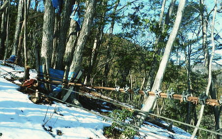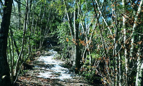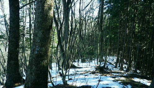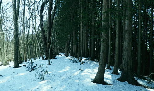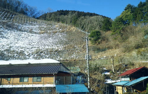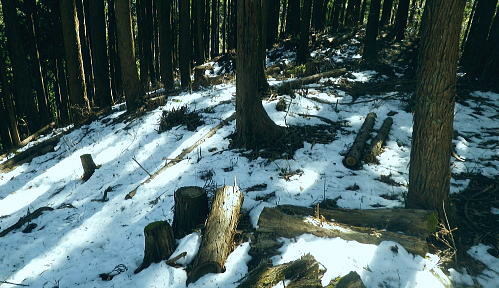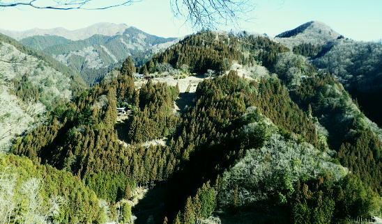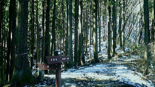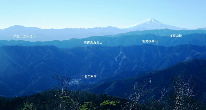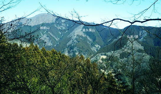 初めての浅間尾根と失いつつある尾根末端の「バケモノ山」・・秋川流域周辺案内図・・奥多摩概念図.山行表 2018年02月. 藤倉分岐尾根を詰め雪原を踏み.一本松・浅間嶺・松生山。払沢ノ頭からはバケモノ山へ。東尾根の南方枝尾根下降.笹野・本宿 2019年09月. 払沢ノ峰北東尾根を詰め出野沢左岸尾根―檜原街道から嫁取坂を経て旧醍醐峠え・・古道を綴り醍醐の集落へ 2023年10月. 一本松北東尾根から浅間尾根上半・数馬峠から御林山.周遊道浅間尾根Pへ。ハンビコ平東尾根から白岩林道.末端二俣―藤倉bs 2024年05月. 本宿役所前bsから旧ベケモノ山東尾根の北方枝尾根から払沢ノ頭.松生山にでて.出野沢右岸尾根から南郷神社.南郷bs 2024年10月. 藤倉bs.陣馬尾根で小河内峠にでて.町村界尾根.風張尾根と風張峠.浅間尾根からは森ノ沢右岸尾根を下る。数馬から数馬下bs 浅間尾根道 「武蔵通志」によると浅間尾根は平坦で茅が茂っていたことから.平茅尾根(たいらがや)の別称があったらしく. 「武蔵国郡村誌」.「奥多摩」.「山麓滞在」もそれに習い伝えられていた。 昔の桧原谷の交通を考えると木村から谷沿いの道は南谷の出野までで.北谷は大沢まで通じているだけで.その頃の時代が長く続いている。 「奥多摩」では数馬や人里が経済的関係を檜原中部に仰ぐようなった頃は.決して南秋川の道ではなかったようだ。 桧原谷はV字の両端を強くしばりあげた形で.谷奥からよりは浅間尾根道の方が両側の谷道よりも近道で.桧原は尾根交通の時代が. 古くから続き.笛吹から数馬までの谷沿いの檜原街道は.近年になってからの街道で.昔は笛吹峠の枝尾根から取り付いている。 そこから数馬まで下り.江戸と甲州を結ぶ「古甲州道」。或いは「中甲州道」の一部でもあった模様。 浅間尾根と「ばけもの山」 浅間尾根の西側の中端.北秋川の陣馬尾根の取付き地点.藤倉から青梅街道沿いの下端に消えた山・・バケモノ山を越え下山する。 初めての浅間尾根. 藤倉bs(藤原.倉掛の地名を合わせて藤倉)と呼ばれている。そこから雪原の稜にでて.929m点コブをピストン。 雪稜を踏みしめ浅間嶺を越えで.松生山南東尾根からバケモノ山へ。一本松・浅間嶺・松生山とトレースする。払沢ノ頭の東端にあるのがバケモノ山。 その東尾根二又で南側の里.笹野地区にでて.街道を下り本宿役所前まで回り込む。 2018年02月14日.松村 藤倉分岐尾根から929m点コブをピストンし浅間尾根を東進して人里峠 ・・点線都道・残雪覆う台地 浅間嶺から小岩.松生山分岐.松生山・840m圏小コブ 払沢ノ峰からバケモノ山とに立ち.支尾根の540m圏南尾根から笹平 古来から浅間尾根は小河内と五日市を結ぶ交易路(旧甲州街道)として.本宿・時坂を経て浅間尾根に通じて折. 戦前までは五日市と檜原.数馬の間には.薪炭の牛馬が往来する生活道として通い.今でも路傍に石仏や石畳とその面影が残されている。 浅間尾根は地形的には風張峠から笹野に至る長大な尾根を指し.今回は雪原が消えぬ内に藤倉から取り付き.浅間嶺からの展望を楽しむ。 下山は松生山の東南尾根に乗り.尾根伝いに探索しながら浅間尾根の東側半分を回り込み.バケモン山の里山へと抜け笹野に下ることにした。 又まとめたメモ地図を忘れ.反省すべき山行にもなっている。 浅間尾根と小岩の集落 大岳山より南面の展望・・2015.12.18/11:14 大岳山から足元に横切るのが馬頭刈尾根. 右下が湯久保尾根。6年前の1月.シゲクラ沢右岸尾根から御前山を横切り.尾根通しから小岩へ下りている。 小岩の集落を背負うのが浅間尾根・・松生山に麓は小岩.浅間嶺.ムケシノ頭.人里峠.三本松と連なり.今回は浅間尾根を右手から左.東方へ縦走した。 浅間尾根に並ぶ背の山並は三頭山から延びる笹尾根で. 更にその右上の山並は権現山稜.大菩薩峠越えの牛ノ寝通りへと続くいている。 左奥は道志山地越えの北丹沢の大室山. 甲相国境尾根から三国山に続く駿甲尾根が富嶽に向かい長く延びる尾根。 中央は聳えるのは丹沢山塊と隔てる西道志川越えの御正体山で.御坂山地の東端になる鹿留山へと延びる。 678m点コブ 浅間尾根.藤倉分岐尾根・北尾根の末端.8:332月14日快晴 jr御徒町5:54=6:00東京.中央特快:14=6:52立川.直通:43=7:36武蔵五日市.西東京バス¥750. :43=8:32藤倉bs1.480m. バスの時刻に合わせ,東京駅発,始発の中央特快に乗車した。新宿の高層ビルを見ながら日の出を迎えている。6時32分. 鮮やかなオレンジ色の朝焼けが東空を背に冬空の高層ビル群に陽光を反射させている。遠めには淡くピンク色に染まる姿が眺められた。 濃い色合いは天候の不安定な兆しを示していた。夕方には南岸低気圧の影響を受け.関東地方は荒れる予報がだされていた。 武蔵五日市駅発の藤倉行路線バスは7分待ち。車内は通勤バスらしく.ハイカーは4パーティほど。 殆どの乗客は五日市警察前で下車.急に車内は疎らになった。一昨年は盆掘川.醍醐川流域に通い続けている。 そのアプローチとなった沢戸橋から路線バスは街道に戻り.荷田子バス停を過ぎている。畔荷田から檜原