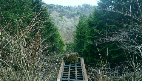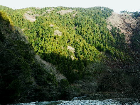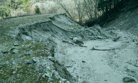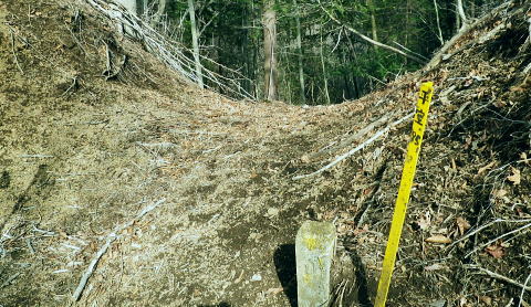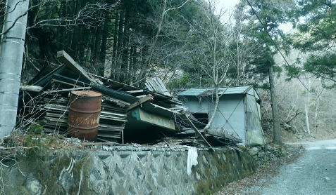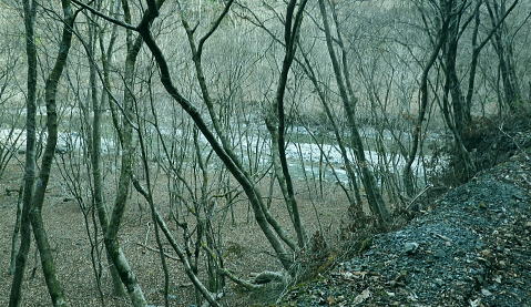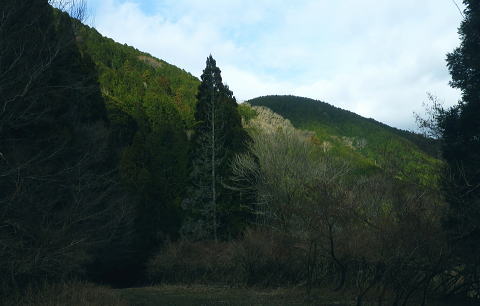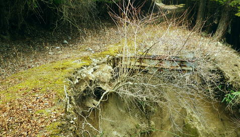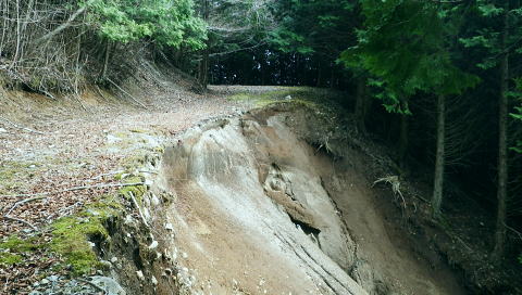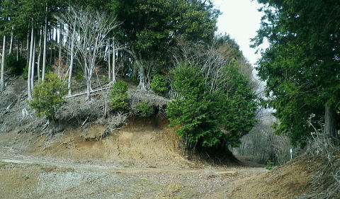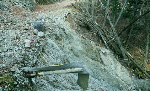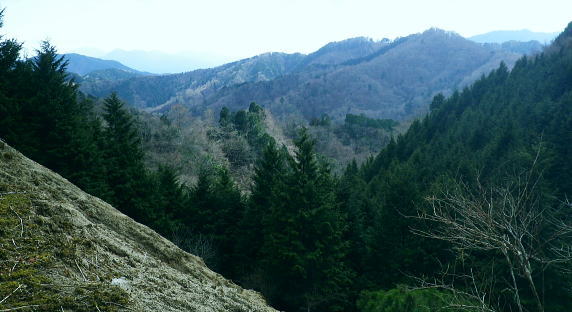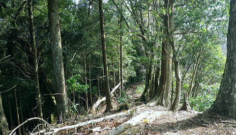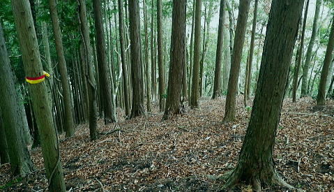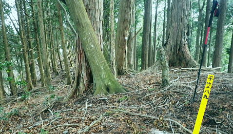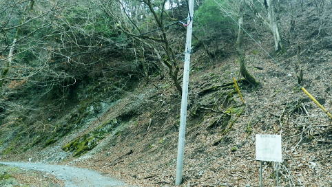 | 富士見林道から富士見峠―法行沢左岸尾根下半(南尾根)から法行沢林道・大又沢林道と繋げ.今回は浅瀬橋に戻る 浅瀬のゲートから熊ノ沢ノ頭南尾根を詰め椿丸・・チェンスパイク 織戸峠で軽食.偵察して小沢二俣から本流を渡渉し富士見林道へ 富士見峠から法行沢左岸尾根を下降し.法行・大又林道から浅瀬橋に戻る・・熊の話と送り車 富士見林道 路肩が崩落している.14:18910m圏小ピークと織戸峠 林道から上法行沢越えの織戸峠.14:19右奥が駿相国境尾根に乗る湯船山方面 路肩の固定鋼が抉りでている.14:20 林道の道幅半分が崩落.剥き出しになった排水枡.14:21法行沢右岸沿いの山並 右手が803m点コブ.14:25世附権現山と重なるミツバ岳. 熊沢ノ頭東尾根と中央が椿丸.右手前が910m圏の石柱平81 富士見林道の支線分岐.14:29左手に分ける林道は富士見林道本線でイデン沢の左岸に回り込み.二俣支尾根で忍橋林道を分け. 白水沢橋・富士見橋を経て.でた地蔵平が起点になる。右手に入ると直ぐ100mほどで富士見峠の脇にでた。 林道ができる以前の法行沢歩道の小さな過ぎる可愛らしい峠があった。過ぎれば熊沢ノ頭東尾根(878m点尾根)に乗る 富士見峠林道と結ばれていた。そこには下る予定の上法行沢下半左岸尾根(南尾根)が延びている。 富士見峠 小さな小さな峠.実際はもう少し先のようだ.14:36林道の左脇から見る外れた小さな切通しの富士見峠. 林道先で富嶽が望めるがここからの展望はない。 又道標類はなく.林班界標「130/127」も見付けられなかった。黄色い「平空95」と脇に石柱あり。 峠の窪地の奥へは上法行沢歩道が横切り.手前は歩んできた富士見林道の南側山腹と直ぐ並行するよう刻まれていた。 峠手前では激しく崩壊し歩道は消失している。 甲相尾根・・三国山.鉄砲木ノ頭.高指山 富士見峠を過ぎ広がる南方の展望.14:44富士見峠を過ぎると936m点小コブの南寄りの林道からは大きく富嶽を絡めた大展望が開かれる筈だった。 だが今は雲の中になる。その右側の切れ目から望まれたのが三国山。 中央の鉄砲木ノ頭から右下の鞍部が切通峠.その少し上部1110m圏コブから手前に延びるのが丸尾山を雍する尾根。 尾根下部に聳える中央左下が1007.0mの三角点を持つ橡ノ丸。末端は大棚沢出合に没している。 再び山に向い東京近郊の山へ登り始めた頃,道坂峠から暮れに御正体山から甲相尾根,三国山と初めて歩んでいる。 それから10年を越す月日が経ち.東丹沢から西丹沢へと攻め続け.世附川流域に今入っている。もう少しで山中湖の東岸に至る。 写真の手前右が所小屋ノ頭南東尾根の東丸と西丸。憧れ続けてきた山並が間近に迫り望められた。湧きあがる気持ちに踊らされていた。 手前の鞍部が織戸峠 峠右脇の小尾根を下り旧道と合わさり離れて沢底に下降.枝沢二俣から登り直し,更に上側の尾根の末端付近で乗って. 再び旧道にでている。後は旧道沿いに法行沢本谷を渡渉し.802m点コブ北側の鞍部にでている。 峠の反対側へと織戸沢を下れば出合.対岸が「水ノ木」になり.又東丸からの尾根の末端に当たる所が「水ノ木」になる。 富士見峠林道 936m点コブ南側のU字の広場.14:49白い標柱が富士見峠南東尾根の取付き地点. 右前端には南尾根の取付きがある, 富士見峠南東尾根の取付き地点.14:46南東尾根は林道との分岐で南側に極端に急カーブする地点から東に回り込むと向かう位置に2つの尾根の取付きがある。 古い林班界標「129/128」の支柱だけが立ち.標識板は転がっていた。 地形的には法行沢の支流.井戸沢左岸尾根に当たり.830m点コブには「平空87」の黄ポールがある植林のコブを越えている。 南西に進むと倒木が多く.道形は不明瞭で注意を要す。又この山は大又沢幹線林道から見上げると誰が定めたのか 「トトロ」の名を持つお伽の山になる。 富士見峠南尾根取付き地点.14:49先程の南側に林道が急カーブする地点が上法行沢左岸尾根の下半の取付きに。2本の立木に二重丸が書かれていたとあるが 薄れたのか分からなかった。古いボロボロの林班界標が転がっていたがこれも文字の判読はできなかった。 左手に長尾沢と法行沢に挟まれ.短時間で法行沢林道に降りられる。迷うことはあっても790m圏で. 尾根が2つの分かれる地点と最後の側壁がポイント。南方に目指し下ればよい。ほぼ植林に覆われていた。 法行沢左岸尾根 15:02790m圏で尾根は2つ分かれ右奥は鹿柵に閉ざされ.左前方に進んでいる。痩せ気味の見た目すっきりした尾根。 尾根末端は土崖が有るため650m圏で左手の枝尾根から小沢沿いを選べば法行沢林道にでられた。 赤と黄色のテープが重なる矢印があり.この印は南尾根に点々とある。 痩せ尾根気味 南尾根650m付近の尾根を外れる目印.15:18尾根末端は側壁で直接林道にでられず.左の枝尾根から適当に窪溝沿いに降りている。 下れば沢底に出て.目の前の林道に合わさっている。沢沿いの流水は殆どなかった。 法行沢林道 枝沢沿いから荒れる林道にでて.15:22法行沢林道の工事は平成5年度.伐採は8年頃. 富士見峠南東尾根の830m点コブ? 左