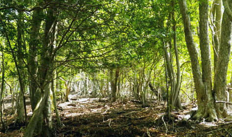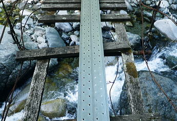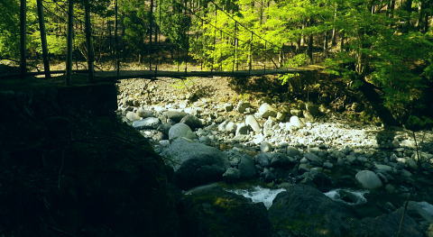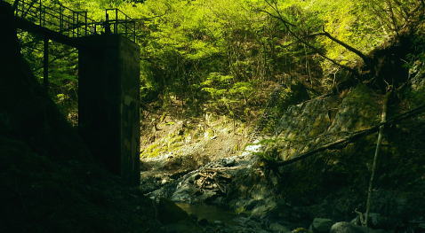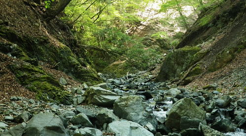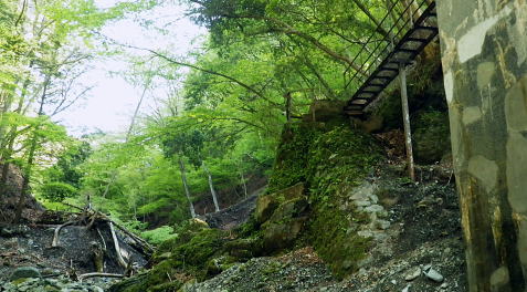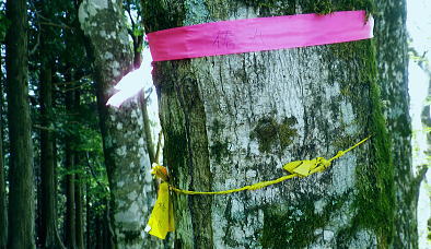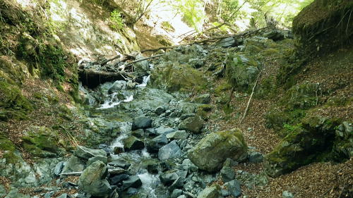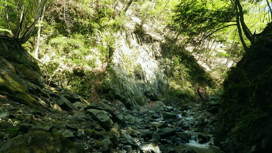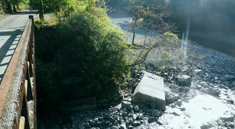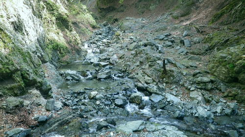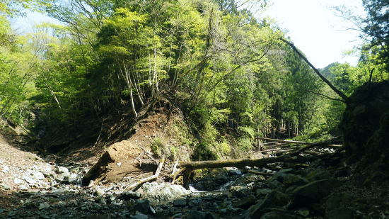 | 悪沢からの新たに訂正された椿丸南尾根を登る 改めて世附川悪沢二俣の中間尾根(椿丸南尾根)からの椿丸. 熊沢ノ頭.小熊沢ノ頭を越える ・・世附川.悪沢流域Top 悪沢右俣のセイゼン畑沢に挟まれた本来の椿丸南尾根を詰めて熊沢ノ頭南尾根.小熊沢ノ頭南東尾根を大又沢側に下る。 悪沢と熊沢との中間尾根に乗り椿丸へ―熊沢ノ頭南尾根から小熊沢ノ頭南東尾根を下り.大又沢.世附林道から丹沢湖.三保ダムへ 2018年04月22日 松村 悪沢熊沢を改めて椿丸南尾根を詰める ・・無難な沢歩き 熊ノ沢ノ頭南尾根から小熊沢ノ頭南東尾根を下り三保ダム 前回は悪沢左俣から山神峠を越え水ノ木周辺を探索した。前々回は熊ノ沢ノ頭南尾根を回り込み.椿丸に立ち富士見峠へ抜けている。 言葉の上では登山詳細図を読み.椿丸南尾根のルートと勘違いして呼んでしまったが.それに習う意味を含めて椿丸南尾根を改めて登り詰めている。 少しでも悪沢右俣に入渓したい気持ちは衰えず.改めて椿丸南尾根を目指すことにした。椿丸に出てからはのんびり昼食と昼寝を取り. 小熊沢ノ頭の南東尾根を下りている。又大又沢林道.世附林道と辿り.三保ダムまで回り込む積りでいる。 先々週は東京都鮒釣り競技会が佐原地区で行われ好天に恵まれて.その後の週明けも好天の予報がだされていた。 それが早めに南岸に前線が生まれ.17日から18日に掛けの雨量は20mmを超える降雨の予報だされ. 入渓に一日の間を入れた出発前日には肉離れを起こす。重なるアクシデントで出発は更に週末に遅れている。 花の行楽シーズンを迎え.週末からのタクシーの予約は3ケ月前から満杯とのこと。云われれば納得いく言葉だが全くの無音痴だった私。 月曜の予約も満杯.それでも連絡を繰り返し.近頃密に乗車しているせいか.上手く工夫できたと幸運な連絡を頂いた。 熊沢ノ頭南尾根 3週間を隔てた山は新緑に溢れ飾られる.7:26左下は大又沢に架かる浅瀬橋 4月22日(日)快晴.夏日 jr御徒町山手線.¥1940. 5:11=5:17東京.東海道線始発H:20=6:32国府津.御殿場線:35 =7:04谷峨.松田合同タクシー.(メーター¥3970+固定迎車¥210=¥4180)=7:25浅瀬ゲート. 今朝は東海道線の始発前に.日の出を迎えている。今年になり随時東海道線を利用している。 年初めには御殿場線に乗り換え.日の出を迎えていた。日が経つのは早く陽光も大分伸びてきた。又今回から東海道線のボックス車は無くなった模様。 夏日になる予報が出されたせいか.行楽者が多く品川駅を過ぎると座席は満席になっている。その中.何故かカメムシが1匹.私の手元に現れた。 浅瀬橋 東詰に見る軌道の橋桁の遺構.7:29椿丸南尾根 7:25浅瀬ゲート一8:11吊橋一8:49悪沢二俣一9:25センカイ畑沢と熊沢出合一南尾根一10:46椿丸. 御殿場線.谷峨駅に下車. 今日も贅沢に予約タクシーで丹沢湖の北岸を回り込み浅瀬にでている。 浅瀬から林道を歩み浅瀬橋を渡り.左手に折れると水ノ木林道に入る。直ぐ右に回り込む所に熊沢ノ頭南尾根の取付きがある。 ここは急斜面の登りから始まるがズリ落ちて怪我する場所ではなかった。そこに真新しいピンクロープが固定されていた。 最近訪れるハイカーが多くなったのは私を含め思うも.何故と同時に如何して固定せけばの言葉がでくる。 設置すれば安全と思う一方.却って危険と思う考えもある。下山の折15.16人の中高年女子パーティと12時半頃.小熊沢ノ頭付近で擦れ違っている。 椿丸をピストンするとのこと。前に付き歩んでいるだけのハイカーが多い。トンチンカンな質問を受けている。リーダーだけ確りしていれば良いのだろうか? 低山では好天ならばピクニック気分を楽しめるだろう。何とも言えぬ気持ちを押さえ.「気を抜いた時に怪我しますから!」と言葉を添え別れている。 芦沢橋西詰肩 上流側左岸に見る軌道の橋桁遺構と崩れた欄干.7:48湯ノ沢橋 山蔭でも木々は緑に染まる時期.7:53旧本州製紙の吊橋 連続して訪れることになった吊橋.8:11今回は再び巡視路を歩み悪沢二俣から熊沢を詰め椿丸に立ち.そのまま悪沢左岸尾根を大きく回り込んで大又林道に下る積りでいる。 先ほどゲート手前の漁協小屋の釣場図を見ても.悪沢に入渓している釣師は今日はまだいなかった。ホッとする入山になる。 倒木を縫っての遡行と中間尾根からの椿丸. 少々暑くなってしまったがまず擦れ違う人は居ないだろう。気儘な道中を独り占めし味わえられる。 橋床が落ちて足留めにアルミ板が置かれている 水ノ木林道に入るもまだ道端に花らしい花は見られなかった。吊橋の袂にでて.日当りの3房の黄色いタンポポを足元に見ている。 林道脇には「山神悪沢取水路入口」の標柱と少し離れ.「工事のお願い」と「王子製紙」の看板が目立つ所に立てられていた。 ここで身支度を整えている。 旧三俣山荘跡.8:12吊橋を渡った向かいの道端に紫の小さなスミレが一輪咲いていた。その脇に踏み跡を見付け.今回は旧三俣山荘に寄らず 直接尾根に取り付く。東電のプラ階段を越えた所で巡視路と合わさり.この上は平坦な台地の枝尾根か