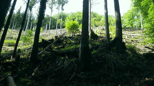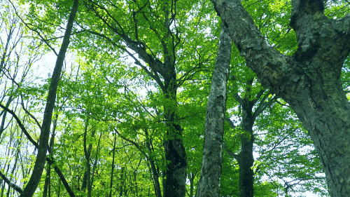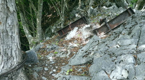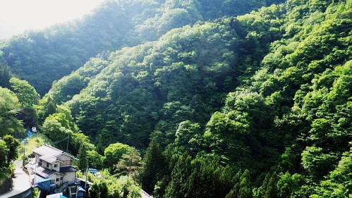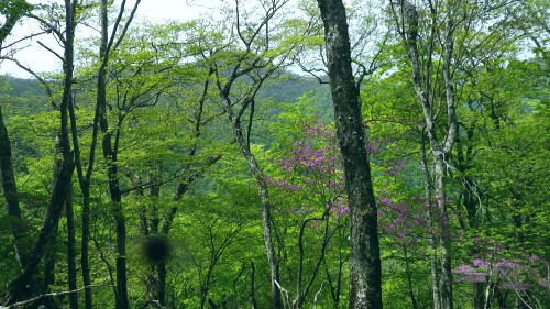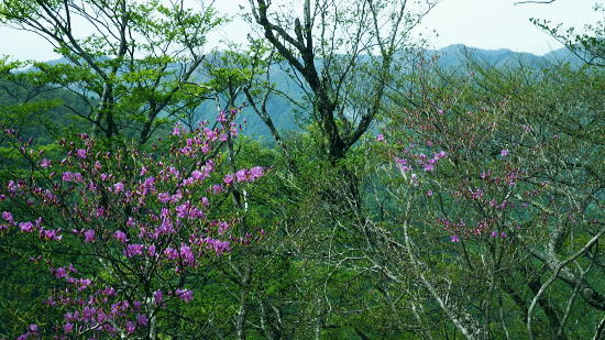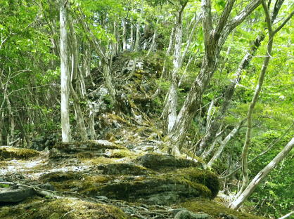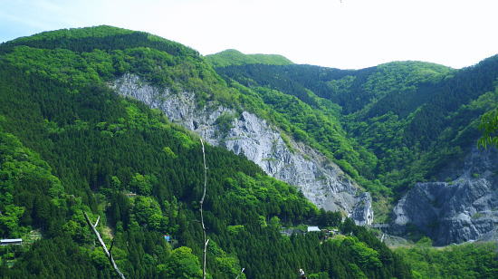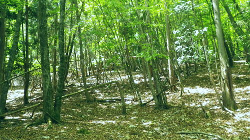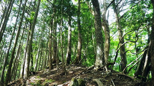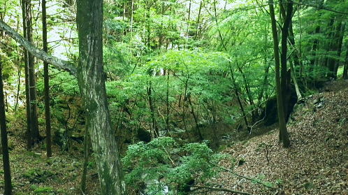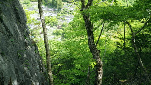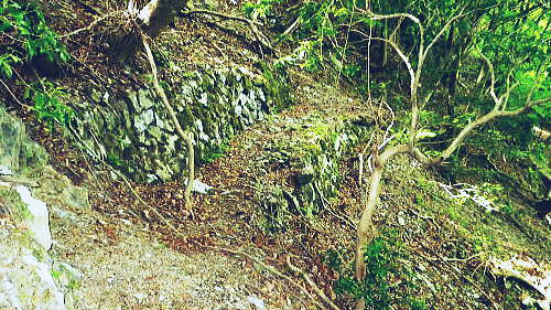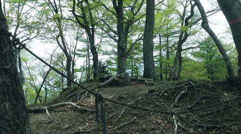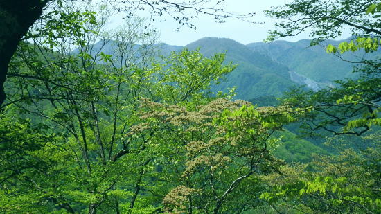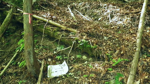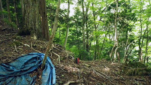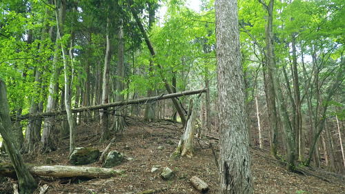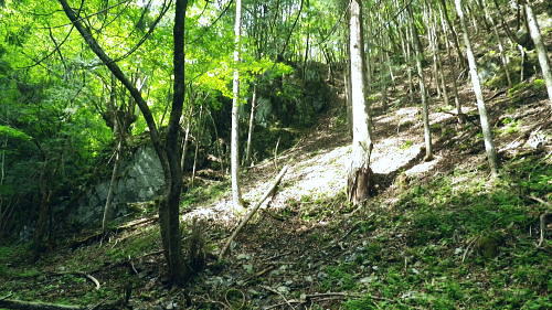 | 東日原バス停前広場の日原川対岸に聳える石尾根の北支尾根群.その1つ涸沢尾根を詰め榛ノ木尾根へ ・・日原を拠点に石尾根の支尾根Top 新緑のバス停前から最後に残された北尾根の涸沢尾根を詰め.六ッ石山に立つ。後半は榛ノ木尾根からイソツネ山南尾根を綴り梅久保地区へ 榛ノ木尾山・トオノクボから防火帯の榛ノ木尾根から小さな杉の小に寄り.イソツネ山南尾根から梅久保へ 2018年05月06日.松村 東日原から涸沢尾根を詰め雲取山石尾根に乗る・・岩場から植林満る尾根 六ッ石山を越え榛ノ木尾根から小森に寄りイソツネ山南尾根 東日原のバス停広場から南側を見上げると石尾根から3本の北支尾根が壁のように急角度で日原川の河原へ没している。 東寄りから樽沢尾根.西よりがネズミサス尾根.その間にあって岩峰をまとっているのが涸沢尾根.上部でネズミサス尾根を合わせている。 その北支尾根の中で.ただ1つ登らず残されていたのが涸沢尾根だった。 初めて登ったのが6年前の4月.ネズミサス尾根から涸沢尾根の上部を攻めている。昨年は春雪を求め鷹ノ巣尾根を登り.榧ノ木尾根を下る 積もりでいた。ただ早い融雪に残雪が乏しく.奥多摩湖への倉戸尾根を諦め樽沢尾根に変えている。 考えてみると日原川右岸沿いの各支尾根は上流側の高丸山ツバノ尾根から下流の三ノ木戸山十二天.見通尾根まで四季を通し通い続けている。 涸沢尾根はその最後に残された北支尾根にもなっている。 今回は新緑を求め岩稜の痩せた涸沢尾根から植林帯に入り.石尾根を北から南へ縦断する形で六ッ石山を経て榛ノ木尾根を下ることにした。 榛ノ木尾根の取付きには奥多摩石尾根.長沢脊稜.丹波と数多くある防火帯の中で.短いながら私が好む雰囲気を持つ防火帯の1つ。 春嵐の後の好天に恵まれ.奥多摩は26℃を超す夏日の予報がでていた。程よい心地よさに迎えられ.朝方の空は蒼さを増している。 東日原と樽沢・涸沢尾根の末端 東日原バス停前より.7:51尾根末端の急稜が幾らか緩んだ所に岩峰が聳えている. 5月06日(日)快晴後曇 jr御徒町4:49=4:55東京:59=5:55立川6:04=6:34青梅:35=7:18奥多摩.西東京バス:27=7:51東日原bs.620m. 連休最終日のせいか.jr青梅線の車内は幾らか目立つ。それでも路線バスの日原線の混雑ぶりは変わらず.満杯のハイカーで臨時便がでる。 わざわざ連休のラッシュ日と重なってしまったが.その時に合わせ臨機応変にコースを選ぶ積りでいる。 旧日原左岸道の桟橋.8:01昨年と同様に東日原バス停前の広場から軒下に掛かる路地で日原川に下り.左岸の下流方面に進んで日原橋を渡っている。 途中で舗装された車道と合わさり.そこを末端まで下って終い.旧日原道下に降りて突然.車道が幅広い間々途切れていた。 前回の下山路へと登り直し.少し面を食らっている。余り通らぬ小径を見付け.私道を1本横切り旧道にでる。 8:06無妙橋は改修された後.旧日原橋と同名に戻されている 日原橋を渡った対岸に.前回は気が付かなかったが名残りある丸いリス標識が.旧右岸道沿いに奇麗なまま残されていた。 そこから左に折れ下流側に進むこと数十m先.前回.樽沢尾根から直接下り立った地点にでる。更に約60mほど下流で旧日原道と分岐にでる。 右前方斜面の作業道に入る。更に本流の旧道を下流沿いに進めばセベ岩窪から倉沢の石灰採石場に至る。今は廃道化していた。 旧日原右岸道と樽沢古道との分岐.8:18 ![]() 植林帯を抜けた向かいが樽沢尾根の伐採地.8:31 旧日原右岸道と樽沢古道の分岐 旧分岐 右前方に回り込んで南東に高度を上げると樽沢古道との分岐にでる。右前方の大木の根元には黄色と赤色各2本のプラ杭があり.道標を兼ねている。 各杭には「カラサワ入口」と印字された白いテープが巻かれていた。左に直進すれば今は作業道になり.尾根の踏み跡にはモノレール軌道が通っている。 古道の樽沢道は旧日原道から石尾根.将門馬場へと辿り.六ッ石山を経て青梅街道水根と繋がれている。今の水源林巡視路. 分岐の右手に入れば旧日原道の右岸道を綴り涸沢尾根を越えている。そのまま日原川に遡れば鷹ノ巣谷出合にでる筈。 出合には昔.水車小屋があったとか。以前は中日原に架かる巳ノ戸橋の上流側に旧橋があり.巳ノ戸の集落とも結ばれていた。 今の左岸道は涸沢出合付近から崩落し.道形は消滅している。 旧日原右岸道 トラバースして右の樽沢尾根末端を乗り越す.8:34ブルーシートがある樽沢尾根の末端を乗っ越す。前回は将門馬場からここまで下りてきた。分岐に向かうと登山靴が隠れる深い枯葉に埋まり嫌う。 それではと谷側の末端は土壁に塞がれていたものの右に回り込み.そのまま河原へ直下した。落葉落しと共に滑るよう河原に降りている。 新たに右岸道を進むと樽沢尾根の山腹を巻き.確りした2段の石積みの間を通る。細かいガラ場を抜けている。 先には朽ちり崩壊した木橋に固定ロープがあり.更に荒れ気味で人の気配は薄く.伏流するカラ沢にでている。 ここには確りした2段の石積みが残されていた.8:36 崩壊した桟橋.8