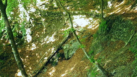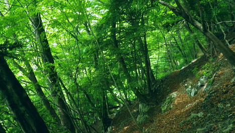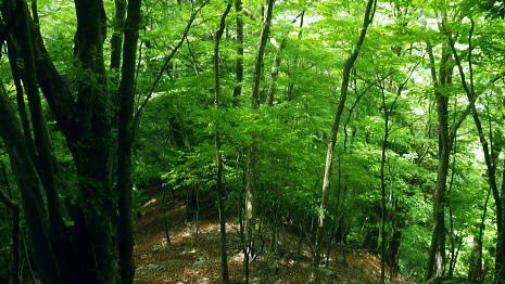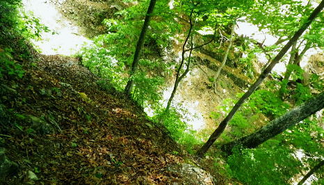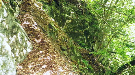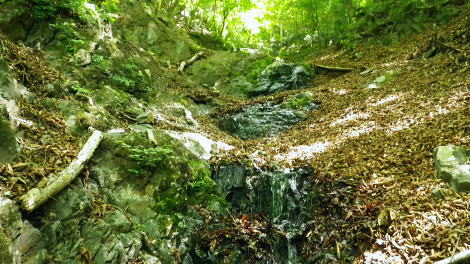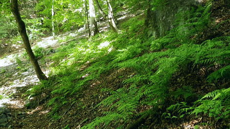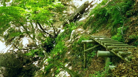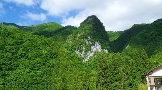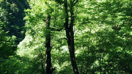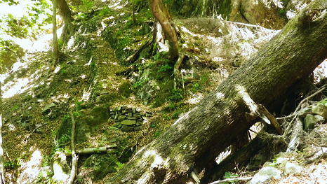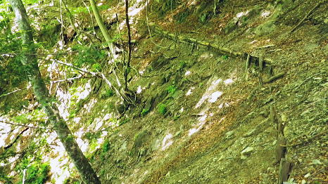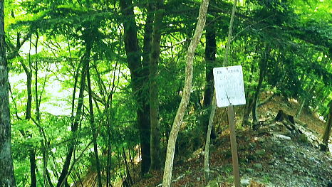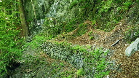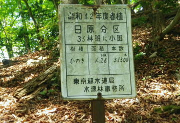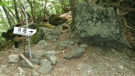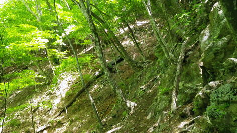 | 奥多摩.天祖山中腹道から楢平へ ・・天祖山周辺Top 若葉燃える日原林道ゲートから旧日原道と日原川右岸の天祖山中腹道から楢平へ下り周回する。 天祖山表参道を経て南中腹道の旧日原林道(水源巡視路)を綴り.日原林道.日原街道を往復する 2018年05月20日.松村 日原林道から旧道に入り.ナメダギ西側の小尾根越え.松尾尾根に突き当たる 松尾尾根から赤石尾根末端の楢平へ下り.旧日原林道へ回り込む 先々週は東日原バス停広場から旧日原街道に降り.対岸の涸沢尾根を詰め榛ノ木尾根からイソツネ山南尾根を下りている。 今回も同じ時刻の路線バスに乗車.増発された2台のバスは満杯のハイカーを乗せている。倉沢橋の下車は単独者1人と相変わらず少ない。 燕岩洞門は工事で通行止めのため天祖山口から南側中腹道の旧日原林道兼水源林巡視路の経路に入る。 東側.中日原から望む稲村岩.7:555月20日(日)快晴後曇 jr御徒町4:49=4:55東京:59=5:55立川6:04=6:34青梅:35=7:18奥多摩.西東京バス:27=7:51東日原bs.620m. メーントーム(春の嵐) 高尾近くで中央東線の車窓から都心を振り返ると夜半.東京を通過した雨雲が東空に大きなどす黒い雲堰を創り抜けてゆくのが仰がれた。 それに比べ頭上は雲1つない青空が押し寄せていた。やや風があり肌寒くい.薄いジャンバーを羽織っている。 今年の偏西風はやや大陸寄りに回り込み.この時期になると日本付近は北からの冷たい気団と南から入る込む暖かい気団がぶつかり合い. 極端な寒暖差が生じ上昇気流を起こさせ.温暖低気圧を発達させていた。台風と異なり急激な天候の悪化は広範囲で.又風の影響を強く受けている。 日原林道の起点 都道204号.日原街道小川谷橋を渡った分岐の看板類.8:067:51東日原bs一8:33天祖山登山口一9:40旧日原林道口一10:10曲り尾根一10:25ナメダキ窪一10:50巻道と合流一11:05松尾尾根. 小川林道起点の燕岩洞門の工事が延長され.期待していた小川谷に今回も入渓できず。 日原林道の起点.小川谷橋分岐に「お知らせ.この先(鍾乳洞奥)道路災害改善工事中」と大きな看板が立てられていた。 日原川水系の沢 日原川は秋川と並ぶ多摩川の二大支流の一つ。遺書尾根の北面と長沢脊稜の南面を水源とする支流を集めて.氷川で多摩川に注ぐ。 氷川から日原までの間に左岸から余毛沢.川海苔谷.倉沢谷が.日原では小川谷が合流している。 改修工事終了予定日を過ぎ小川谷へ入れるか? 3日前に.奥多摩ビジターセンターに連絡を取るが.小川林道起点にある隧道工事は秋まで延長される。 又もや人も通れず諦めざるえなかった。今回も変更を余儀なくされている。左へ日原林道に折れ.新緑を求め天祖山南山腹の旧日原林道に入る。 正式名の林道日原線は全長約8km. 起点は県道204号線小川谷橋北詰になり.日原街道の終点は小川谷林道の起点と結ばれている。 日原林道は支線,孫惣谷線を分け7.5kmポストを過ぎと唐松谷への下降点があり.ポストの標識を過ぎると更に支線の大ダワ林道の起点がある。 2005年5月に原付バイクの運転手が熊に襲われている。現在は八丁橋ゲート先は閉鎖され.孫惣谷線は奥に採石場があるため.起点から一般車は通行止。 天祖山登山口 八丁橋を渡りゲート前の道標から天祖山口.8:33天祖山 天祖山(白石山・鍋冠山)の表参道は日原林道のゲート前右が参道口で水源林巡視路と兼ねている。ゲート先は雲取山方面へ. 天祖神社に至るまでは尾根伝いに進み.タワ尾根から周回した時は天祖神社先の裏参道は孫惣谷の直登コースが崩壊していた。 今は長沢脊稜の水松山に突き上げ.長沢脊稜にでてから回り込んでいる。又天祖山南側の山腹には旧道に当たる旧日原林道が綴られていた。 現日原林道が開かれる前の旧道は交易の道として.ブナ坂越えの唐松林道は日原の集落と結ばれ盛んに活用されていた。 当時は長沢脊稜へと裏参道の尾根を綴り雲取山へ.或いは天目山に至り秩父へと。今は巡視路として利用されている。このルートは前にタワー尾根から 回り込み赤石尾根を下り楢平に寄って旧日原林道を横切っている。今回は水平道として若葉満る涼を求め辿ることにした。 オロセ橋を右手に見て孫惣谷林道の起点を分け.八丁橋を渡れば天祖山南東尾根の末端にでると南側に登山口がある。 林道と分かれ一気に詰める急登.石積みで整備され.確りした登山道を喘ぎ登る。高度感あるガレ場を過ぎると小尾根に乗っている。 急登から始まる天祖山表参道.8:46 8:52 日原川上流側の樹林.8:49 痩せ尾根の急斜面に石積みが上手く工夫されていた.8:50 小尾根に乗る.9:02小尾根に乗ると道標「日原→」には「この先急斜面.注意!」と手書きで注意書きが付け加えられていた。 尾根幅が広がり.小木林の若葉の薫る斜面を清々しい気分で抜けると最初の道標分岐にでる。脇に小さな祠があった。 又少し先に林班界標「奥多摩区分35/32」が立ち.一時の痩せ尾根に変わってもいる。 正面は旧日原道で孫惣谷へ下る.9:19立木に三又を示す古い道標と真新しく立てられた新旧2つの道標が立つ。新道標には「←天祖山・雲