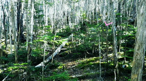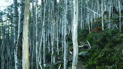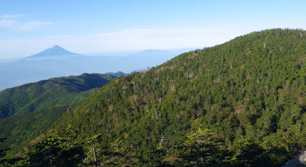 | 奥秩父最高峰.北奥千丈岳から大丸戸尾根.鳥ノ尾根と繋げ.笛吹川の麓.塩山へ下る。・・北奥千丈岳周辺Top 再び大弛峠にでて北奥千丈岳から荒川左岸尾根を綴り琴川左岸尾根へ.国師岳をピストンし石楠花新道へ。 ゴトメキから鳥ノ尾根に乗り.大久保山で勘違いし.東御殿南尾根から東沢を下降。杣口林から.柳平塩山線に降りる 2018年06月3〜4日.松村 大弛小屋から国師岳.鶏塚山林道から余沢林道を合わさせ石楠花尾根・・夢の庭園 ゴトメキから遠見山を経て大丸戸尾根の林道を横切り大鳥山.大鳥沢ノ頭へ 鳥ノ尾根から大久保山を勘違いし.東御殿南尾根から東沢を下降 もう50年以上前に川崎精雄著の「雪山.藪山」と「山を見る日」を愛読し.奥利根の源流を綴ったことがある。 春山ではなく晩秋の平ケ岳から尾瀬へ。執行部会で反対され続け.それを押し切り登っての藪山。残雪期が本場の山域で.ラッセルと如く藪に時間を費し. 一週間の山行だった。1年生の企画山行だった筈が上級生の参加希望が多い山行にもなっている。 その後.山と離れ再び山登りを始めるようなると東京近郊の藪山を目指すようなった。2005年5月.大菩薩重川左岸尾根を下った折. その前日に「静かな尾根歩き」松浦隆康著が手元に届き.好奇心を抱き急遽恩若ノ峰南西尾根が記載されていることを知り追加している。 松浦本を読むと私が探り歩んでいたコースが続々と書かれているのには驚かさせられた。それからは発刊される都度.愛読させて頂いている。 その初本に川崎精雄氏の言葉も添えられた鳥ノ尾根の文章が載せられ.北奥千丈岳からのコースを紹介し.著者も密かに訪れたいと願っていたとある。 私がこの尾根に見逸れたのは12年の9月.乾徳山からその大らかな長大な尾根に見惚れ.何時か訪れなければならぬとチャンスを狙っていた。 その後大弛線が開通.昨年はゴトメキから東奥山窪を下り.今回は古希を迎え.山小屋泊りで.直接鳥ノ尾根をゆっくり下りたく実行する運びになった。 大鳥山鳥ノ尾根 クリスタルライン(柳平塩山線・県企業局管理道路)3日9:41琴川左岸尾根の大鳥山と馬止馬場.小鳥山から小コブを越え東御殿. そして大久保山南東尾根が手前に延びている。 その右奥に大きく聳える三角錐が乾徳山。ほぼ1年前に大弛峠から北奥千丈岳石楠花新道からゴトメキ.大ダワを経て東奥山窪を下っている。 里の徳和は乾徳山の登山口. デマンドタクシーは塩山駅からリスタルラインに入り.柳平からは川上牧丘林道に乗り大弛峠にでる。 鳥ノ尾根 前回は昨年の同じ時頃,季節バスの開通に合わせ.北奥千丈岳から石楠花尾根を経て東奥山窪を下り徳和の集落に下りている。 ゴトメキまでは前回のルート.右尾根に分かれると南下して大鳥山・小鳥山を擁する尾根に魅せられ.鳥ノ尾根を下り大久保峠に至るルートを辿ることにした。 デマンドタクシーを利用しても大弛峠に至るには9時を回ってしまい.日帰りでは到底無理の長い尾根。 小屋泊りで早朝5時に立てば如何にかなる。大弛小屋に連絡を取ると残雪は昨年より更に少なく.踏み跡は綴られていると云う。 藪尾根を探索するロス時間が大分省けそうだ。国師ケ岳からの長帳場.コンロは持参しなければ炊事の時間も省け.持たずに実行した。 又入山には一番手軽な金峰山表参道も考えられたが.鳥ノ尾根の下降一本に絞り.前日の昼頃は小屋の周辺でゴロゴロすることにした。 ルートとしてはゴトメキまでは全行程の1/3程.前回はここまで歩んでいる。黒金山徳和林道を横切る笹原辺りが丁度行程の半分ほどになる。 更に大鳥山を越えた小鳥山の分岐辺りが2/3行程になるだろう。予定では休みも含み11時間掛け高度差2000mを下ることにした。 大久保峠から杣口林道と繋がる乙ケ妻集落へ。ただ飛んでもない頓珍漢を起こしている。 東御殿と大久保山南東尾根 支尾根に乗る西群馬幹線170号鉄塔.9:43琴川左岸尾根・・県道の右側には琴川が流れ.その左岸に杣口林道が綴れている. 6月03日.快晴後曇 jr御徒町6:49=6:53神田:55=8:01高尾:10=9:15塩山.栄和交通デマンドタクシー:30=10:12柳平 ー11:00大弛峠bs.¥1800. 土.日曜日には一日3本の塩山駅発大弛峠行バスが出ている。その3番目.9時30分発に間に合うよう神田から快速に乗り. 高尾で乗り換える。行楽日和に恵まれ天空は蒼い.座席はほぼ満席で3/4ほどがハイカーで占められていた。 大月を過ぎ鶴川出合に差し掛かると右の車窓から鶴川の河原に多くの太公望が集り.竿が出す姿が見下ろされた。 6月第2週が鮎釣りの解禁日. 大型の大ヤマベが混ざる鶴川出合付近に.今年はまだ入渓していないが昨年の今頃はあの河原に私もいた。 風はなく条件は良い。ただ陽射しは既に真夏のよう強く射している。 ・・6/7日.文京の釣会が鶴川でヤマベ釣りを催す。 30匹検量で山崎氏1.230g.1位.大型が揃う。ポイントは上流橋上と出合のダム放流地点上。雑魚¥800. 小樽山 乙女湖北岸の柳平より.10:16湖畔対岸が琴川ダム.その背が小楢山。琴川湖右岸沿いの鉄塔は西群馬幹線165号と164号鉄塔。 昨年の始発