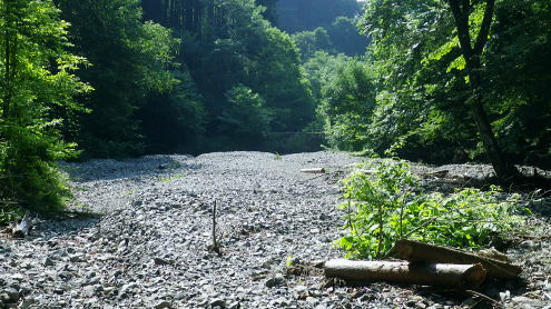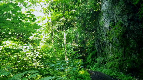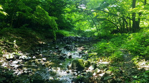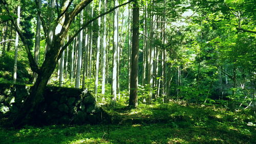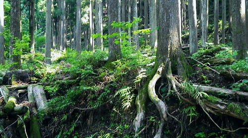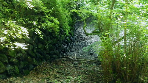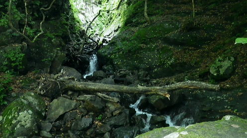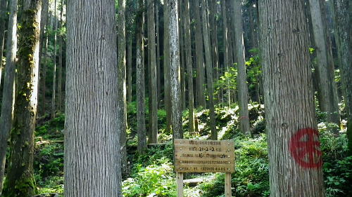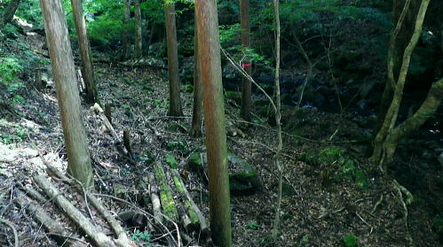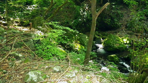 | 峰入沢谷・・入川谷流域絵図 2018年06月. jr古里駅から周回.古里附.入川林道を経てトキの倉骨.布滝―オキの倉骨から巡視路を経て旧峰集落・・林道終点に戻りjr古里 2018年07月. 杉ノ尾根末端から旧峰集落を経て入川谷―布滝沢径路からエビ小屋山南尾根.そして向ウ山を経て末端に至る・・林道起点から周遊 2019年08月. 入川谷布滝から峰歩道の作業道? 旧峰集落―大根山ノ神から杉ノ尾根を経て荏ノ久保山南尾根・・jr鳩ノ巣 2019年10月. jr鳩ノ巣から峰歩道を経て入川谷を横切りエビ小屋山南南西尾根―赤杭尾根から曲ケ谷沢を下り林道・県道‥清東橋bs 第一弾.川苔山南東部に位置し.赤杭尾根と舟井戸から大根ノ山ノ神に延びる南東尾根。その間に挟まれる峰入川谷とそこを取り囲む尾根尾根に入る。 峰入川谷.布滝と旧峰集落を取り囲む峰歩道から倉沢橋脇に戻っている。・・川苔山とその周辺の尾根Top 初めて真近な青梅線.古里駅から入川林道に入り.2つの山行で峰入川谷に入渓し右岸と左岸沿いを探索する 最初は布滝から峰入川谷を遡り.右岸の経路と本命の右岸の経路に入るも先が読めず.旧峰集落から入川林道に戻った 2018年06月26日.松村 入川谷出合.古里附から布滝・・登山口は採石所口 布滝から左岸道.及び旧峰の集落へ 多摩川の左岸支流.入沢谷に初めての入渓は如何にかなると云う適当な発想は通用しなかった。 本来は本谷に入渓しエビ小屋山南南西尾根から赤杭山を経て.三ノ戸山南東尾根から熊沢林道に出る積りでいた。 入川林道から峰入川谷に入り.布滝沢出合から先は.早くも行き詰っている。苔むしる本谷の右岸の側壁沿いに2往復したが.ザイルを持たず. 技術的にも無理。概念も分からぬ間々入渓し立ち往生した本流。立派過ぎる改修された右岸の作業道を見付けている。 入るも,既に旧作業道の「川乗山.峰を経て」の木片はなく.そこが本命のコースだった。 それが分からず.諦め踏み込んだ作業道が後に正しいと知ることになる。踏み跡と作業道の違いを帰宅して知るとわ。 本流左岸の山腹には新旧幾つもの作業道が絡み.見付けては入り込むも.その絡みの先に迷い.動くことができず完敗し下山した。 現地で如何にか判断できたのが峰歩道.旧峰集落のコースを探索しながら下山した。 初めての下車jr古里駅.7:216月26日(火)快晴. jr御徒町5:01=5:05神田:12=6:07立川:10=7:21古里. 午前中は曇天の予報が外れ.雲1つない晴天の真夏日を迎える。ただ渓谷も尾根筋も以外と深い樹林の木陰に守られ. 暑さが避けられ気をよくしている。ただ午後の復路は採石所に戻ると舗装された路面は照り返しが強く.猛烈な猛暑の壁にぶち当った。 下山してからは圧する暑さの洗礼を受けていた。 単線の奥多摩行電車が1つ手前の川井駅を過ぎ.左前手に斜張橋が現れると直ぐ古里駅ホームに入線する。 古里駅は初めて下車する小さな駅舎だった。青梅線では最後の変電所設備を持つ駅としか知らなかったが以外と家並みが満る地区. 駅舎は小丹波のほぼ中央に位置し.乗降者が多く.10人ほどが一緒に下車している。それも通勤客ばかり。 ホームの案内板には「赤杭山の登山口」と示されているが.ハイカーが降りたのは私独りだった。 2車線の駅前通りを抜けると青梅街道にでて突き当りがセブンイレブン. 鳩ノ巣方面へ右の青梅街道に入り古里小学校を過ぎると 左並びに駐在所がある。留守だが登山届を出してきた。下山した折.駅舎構内に登山届台があったが入山の時は気が付かなかった。 その先街道の標高278m点で高度計を合わせる。 古里附 R411号.青梅街道古里附橋を渡った右手が林道口.7:34背は杉ノ殿尾根に乗る荏ノ窪山南尾根・・将門尾根 古里附 古里駅から青梅街道に出て右折して.右に川苔山への道を分けると左側にウォーイングトレイルの道標がある。これに従い左前方の細道に入れば 寸庭橋方面の滝廻りにでられる。写真はjr鳩ノ巣駅方面から見て橋左脇に清身滝が落ち.入川谷は多摩川へ流入する。 正面の大きな看板の裏は春日神社。 古里附とは「奥多摩町誌」によると御岳山や一石山の参拝者が水垢離「神仏に祈願するため.冷水を浴び.身体の汚れを去って清浄にすること」。 そための「垢離尽の滝」。・・古里附橋の下流側に古里附滝・清身滝があり.本流の下流側(手前)には釜ノ水があり. 松浦本では「奥多摩町誌」から引用され.駅の自動券売機の脇に貼ってある案内図によると清身滝の別名が古里附滝と云うことらしい。 又古里附は奥多摩町相澤にある神社で入川林道の起点.左(西)脇に建てられ.社号は春日神社とされたが建立は不詳。 神木のイヌグスは樹高23mで東京都指定天然記念物がある。青梅街道の改修と鉄道建設のため.社地の大半は削られ.今は窮屈な狭い境内になっている。 三ノ戸山 入川林道に入り古里附の集落.7:36赤杭尾根に乗る(峰戸山)809m. 左奥に赤杭山の山腹があり巨大な採石所がある 街道は又ダンプ街道. この時間帯に行き通う車の半分はダンプ。それも頻繁に通り.入谷林道に入ると直ぐ昭和石材工業の砕石所が
