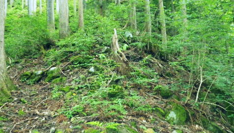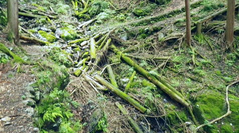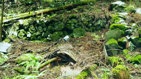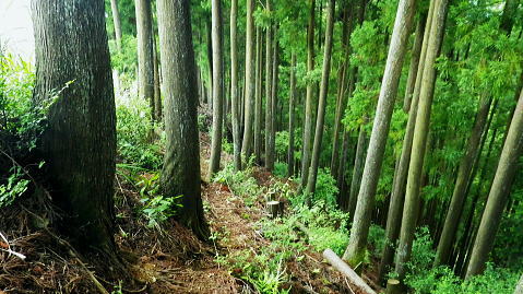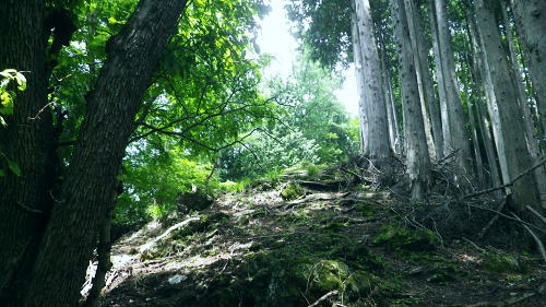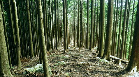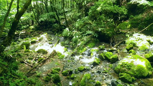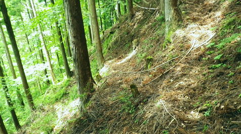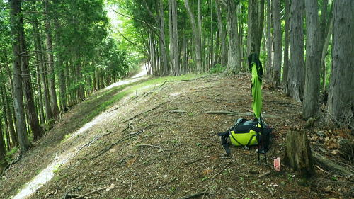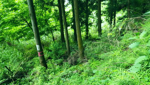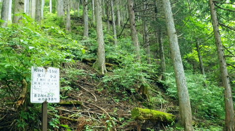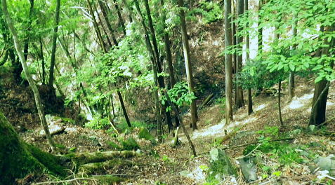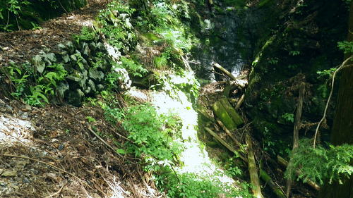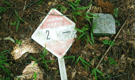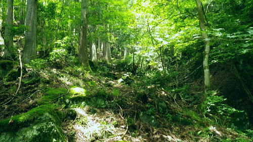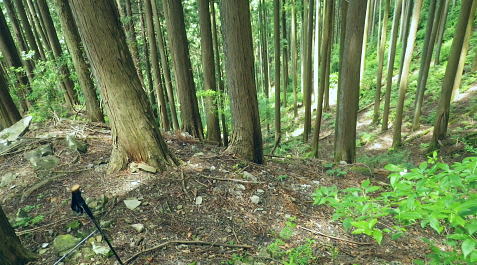 | 峰入川谷中流の左岸の布滝沢の山腹道からエビ小屋山尾根へ 猛暑を避け布滝沢の山腹道を綴り―エビ小屋山南尾根の向ウ山末端から東支尾根を南下・・再び入川林道の起点に戻る。古里附から周回. 杉ノ殿尾根末端から旧峰集落を経て峰入川谷 小屋跡から布滝沢山腹道に入り.エビ小屋山南尾根.向ウ山から南下し周回・・6台目になった新登山靴 エビ小屋山南西尾根の末端 入川谷本流を渡渉・左岸の踏み跡に乗り下流を見下ろす.10:54布滝沢中腹道から南尾根.向フ山から下山 10:48峰入川谷一11:01枝尾根に乗る一11:17小屋跡一三ッ又分岐一12:10南尾根上部防火帯一12:45向フ山 一13:21展望台一14:10事務所脇一入川林道大蔵橋一14:52jr古里. 二つに分かれた枝尾根を見上げる.10:55枝沢を横切り枝尾根右岸に乗る 対岸(本流左岸)の正面はエビ小屋山南西尾根末端の枝尾根で.西側の左岸枝沢に入り.ここで右岸沿いの枝尾根に乗り移っている。660m圏. そして乗り移った枝尾根から枝沢の右岸沿いの山腹の踏み跡を戻り気味に詰めている。 右岸の尾根に一度乗り.右岸沿いに沢筋を詰める.11:01 奥は天然の堰堤と手前の石積み.11:04 枝沢本流を渡渉した右(東)尾根から対岸を見下ろしている.11:14本流を渡渉し対岸に登った枝沢の中流部分。 沢底から枝沢を左岸に渡り直し枝沢本流から分かれ.足元の左岸の右尾根(本流下流側)を越えている。760m圏 布滝沢山腹道 左岸の枝尾根を横切る.11:14尾根を横切り山腹道を東方へ回り込む 枝沢右岸の薮にあった石積み小屋跡・・布滝沢本流?11:17更に東側の枝沢に入り廃屋跡を見付けている。そのまま一度.右岸沿いに藪絡みに薄い踏み跡を辿るが進退が取れず戻っている。 そして旧小屋跡を見付け.小屋手前で枝沢を横切っていた。この尾根を北上すれば南西尾根に乗るのだろう。そのまま布滝沢山腹道に入る。 布滝沢山腹道 3度目の枝沢を抜ける.11:24 枝沢左岸の尾根にでて.11:32布滝沢左岸尾根 左に折れ尾根伝いに踏み跡を辿る.11:35 途中に立つ林班境界標.11:41林班境界標には「昭和45年度春樹,氷川区分.2林班ほ小班」ヒノキ.カラマツとある。 古い作業道の三ッ又分岐.11:59左下から登って来た。先行者の記録に従い.右手に入ってしまったが.正解は左手かも。 もしかして登り放しの山腹道かも知れないが?右を選ぶと間を空かずしてエビ小屋山の南尾根の中段に乗っている。 エビ小屋山尾根に乗る 林相の境になり正面が南尾根.12:05このエビ小屋山尾根の頂は赤杭尾根の1147mに聳えるエビ小屋山(布滝沢ノ頭・クマタカ山)。 入川谷と大蔵谷とに挟まれ.南側にダッと下り.古里鉱山の採石場脇の大蔵谷の出合を尾根末端に持つ。。 南尾根上部の防火帯 平坦で長閑な尾根にでて昼食.12:10〜尾根上部.931m点コブは少し植林が開かれた明るい台地. その南肩910m付近は東方に枝尾根を分け.林班界板が立つ。 直進は枝尾根の樹林帯. 右に折れるのが南尾根で.尾根筋は開かれた防火帯に変わっている。 その直ぐ下部に当たる南尾根にでて.左に折れ気持ち登ると防火帯にでた。ここで大休止し昼食を摂る。 薄日の差す明るい台地にでた。汗でシャツがびしょ濡れのせいか.風に当たるとやや肌寒くジャンバーを羽織っている。 今回も猛暑でお茶漬けにした。前回忘れたお茶漬けの素と冷凍した焼酎缶は忘れず持参した。 程よく溶けた焼酎の喉こしは絶品になる。缶に冷えた汗玉が付き.見るも冷たく握り?む心地は絶大なもので何も言う必要はなかった。 今日初めての煙草も美味い。猛暑の壁は煙草を吸うのさえ嫌っていた。 更に美味かったのがお茶漬け.全てよし。又ポリに入れ替えた沢水も以外と冷えているのには驚かされている。 昼食は持参したお茶漬けまだ午後1時前. 南尾根を後30.40分詰めればエビ小屋山にでる。又赤杭尾根にでて下れば後は知れている。ただ猛暑の気温は 途轍もない暑さに変わっていた。熱風ではなく.気団となり私の周りに居座っている。無理して登山道を歩いても意義があるのか考える。 下山は夕方になってしまうだろう。そして下山を決意する。一度1時間半ほどの違いと一瞬考え直したが再び戻り下っている。 今回はあくまでも猛暑トレーイングと屁理屈を付け.その意義にも反すまいと茹だる猛暑に負けていた。 下山途中に倒れていた林班界標.12:42防火帯の下端.810m圏からは露岩混ざりを登り返し.そこそこ過激な尾根歩きが続く。 尾根に西側山腹を巻き気味に下り.右から尾根が合わさると掠れ倒れた奥多摩区分の林班界標「2/―」と石杭を見ている。 「奥多摩尾根歩き」氏が3年前に訪れた時は真新しい標識だったようだ。台風の影響か? 荒れ果てた姿に変えられていた。 向フ山841m 猛暑で難渋下山を決意.12:43防火帯の末端を過ぎ.そこそこ荒れた灌木帯を抜けると整備された植林帯に入り.林班界標を見て.踏み跡は薄いが歩き易い尾根.独標にでる。 南尾根を下り出る筈のない独標.向フ山に立つ。細長い台形の頂は整然と植林され.居心地のよい美林。 ほぼ中央に山名標が立木に掛けられていた。下る尾根筋も展望台