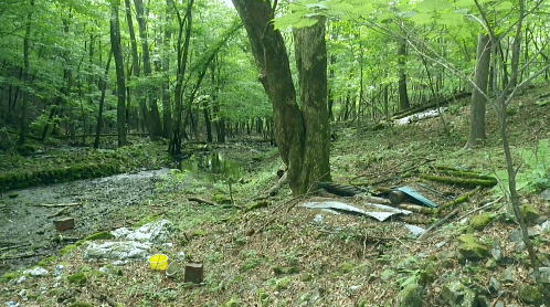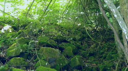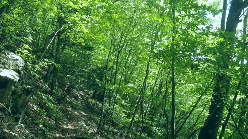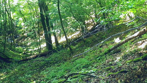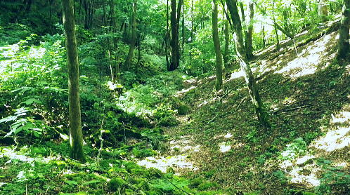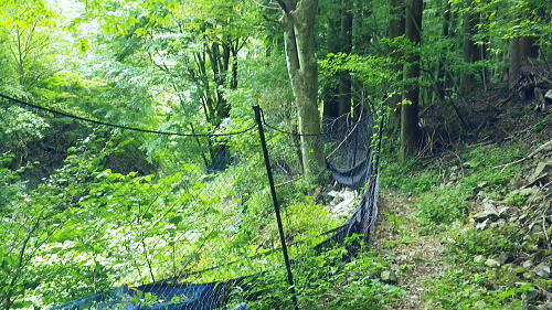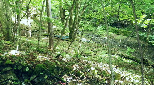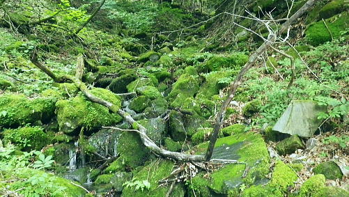 | 三頭山西峰北面の谷・・三頭山玉川の源流ナメリ沢に入渓 境ノ尾根とアシ沢尾根に挟まれた小菅沢右岸の玉川ナメリ沢を下降・・奥多摩湖北岸の峰谷橋へ 石原小屋窪左岸尾根から大沢山東尾根 三頭山北側の巻道から玉川ナメリ沢を下り.小菅川玉川.圧ノ指 ・・旧小菅・青梅街道の峰谷橋 三頭山西峰笹尾根 頂直前の驚嘆にZ字に曲がるブナと再会.13:0612:24三頭山避難小屋.昼食:50一13:13三頭山西峰一13:29鶴峠分岐一13:40玉川本流下降一14:50旧集落跡 一15:00「栗子庵」一15:50玉川林道一16:56旧青梅街道.玉川bs. 三頭山玉川メリ沢を取り囲む尾根は入小沢ノ峰(境ノ尾根)と三頭山西尾根にオマキ平(向山・むこうやま)へと延びる北西尾根に挟まれた広い流域。 過って北側の境ノ尾根から三頭山を越え牛飼尾根を下りている。それを踏まえ.沢沿いからの入渓・下山を試みる。 何時だったかKodama氏のHPを拝読させて頂き.その時に惹きつけられた涼風情を想い返し企画させて頂いた。 避難小屋で昼食を済ませ.玉川ナメリ沢を下る。小屋の外にでると軒下で食事を摂っていたのは1組の団体だった。 狭い敷地内に驚くほど大勢のハイカーが休み.大声をだす人も居ず.気が付かなかった。去ると私と例のハイカー1組だけが残されている。 三頭山の登りではZ字に曲がるブナの幹を久し振り見る。四季それぞれに訪れ.見詰めるのが習慣になっていた奇木。 木段を詰め.御堂峠からの巻き道と合わさると三頭山西峰にでた。 西峰の風景 溢れるハイカーで頂の居場所なし.13:13驚くことに避難小屋と同じく20数名の中高年団体に.ここ頂でも占拠されていた。余りにも多いグループに他のハイカー達も遠目に見守っているようだった。 私は頂を遠慮して鶴峠方面に「都民の森」境の看板が立つ所まで進み.頂北側の巻き道を偵察する。 だが北側には肩台地が広がるも下る踏み跡は分からずにいた。 戻り.西峰左肩の都県界線の北側を探ると踏み跡がある。台地状に広がりを見せ.下ると直ぐ左の足元縁が抉れ落ちる尾根になり. マーキング類はないがそのまま下ると御堂峠からのヌカザス尾根の登山道と合わさりってしまった。抉れた場所にも下る踏み跡があったようだ。 そのまま下れば峰ノ尾根と合わさる入小沢ノ峰へ至り.北側にそのまま下れば糠指山でムロクボ尾根を分けている。共に奥多摩湖.南岸に下りている。 鶴峠への分岐からナメリ沢を下降 分岐直進は三頭山の北側都県界尾根.ヌカザス尾根を下る尾根.13:29それではと無難な鶴峠の分岐に急下降し.分岐からよく踏まれた三頭山西尾根に繋がる北面の山腹道に入ることにした。 この直ぐ手前で3人パーティのハイカーと出会っている。その後は山を下りてからは旧青梅街道を歩き.雲取山からの単独行者と。出会う。 今日は多くのハイカーと出会っている。彼とは深山橋で別れ.女ノ湯で再会している。 ザレ荒れた斜面の登山道から灌木の茂みも目立つ水平歩道へ。歩き易い散策路になり木洩れ日の自然林に囲まれ. 潤う緑の茂みが心地よい。又山蔭に入り程よい風を受けている。頂とは別世界の静寂に満た北面の作業道を綴る。 三頭山北面の巻き道 散策的に木洩れ日を浴びる.13:30源流ナメリ沢 ナメリ沢が伏流する下流側.13:40巻き道の水平道を南下し,ほぼ直角に右に折れると玉川の本流ナメリ沢が現れた。この上流側は急斜面に石堰が連続し築かれていた。 ナメリ川は何の技術もいらず下れる渓谷だが.巻道の径路は狭く.土木建設の凄さを感じさせる風景を映していた。撮るのを忘れたのが残念だが. それなのに1320mから800mまで高度差500m強の間に堰堤類はない。そのナメリ沢の沢底を下り玉川から玉川林道にでられる。 灌木に被われた山腹道には薄し木漏れ日が漏れる水平道で.擦れ違うハイカーもいず.静寂に満ちている。 そこを綴りナメリ川の源流.沢底にでて.唐沢の本流ナメリ川を下降する。 玉川本流の右岸降地点.13:40左下の斜面に頂からの踏み跡が残されていた 下りのアプローチ ナメリ沢を下る場合.鶴峠分岐から登山道を下り.出合まで2時間20分。午後のバス便は2本で玉川バス停3時5分発の乗車は到底無理になる。 更に沢沿いを下れば時間を多く費やすことにもなる。最終便6時12分まで.長い時間待たされることになった。 深山橋まで歩めば青梅街道にでて便が多くある。如何にかなるという甘い考えも果たすことはできなかった。それを覚悟の下降。 水平径路に乗る.13:50伏流する下降地点からはまず沢底の右岸斜面を下りている 大きなゴロ石が沢底を埋めていた.13:59 穏やかな斜面だが沢底は細かなゴロ石地帯.14:05沢歩き 三道具を必要としない渓谷だが踏み跡径と異なるのは確か。沢底のゴロ石の起伏が激しく.時には藪絡みの倒木もあり.歩む様相も複雑になる。 遠くから見渡せば楽に歩めそうな沢底が何処からも見渡せられた。ただ現実は厳しい。足元ばかり見ていれば横に動く動作が多くなる。 ロスを少なくするには沢全体を見詰めつつ.大きな障害物をできるだけ避け前進するに限る。 基本は横で