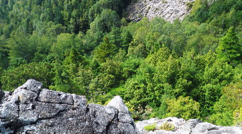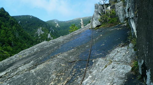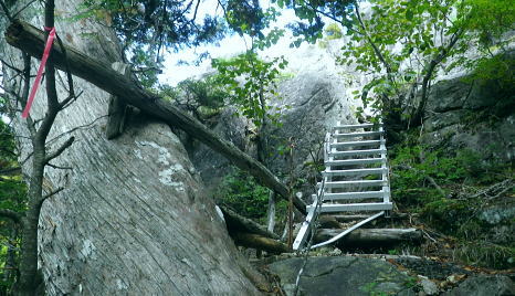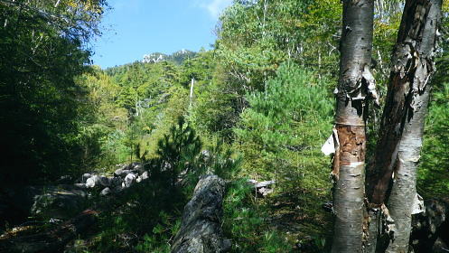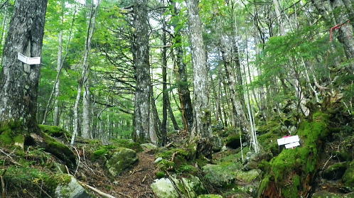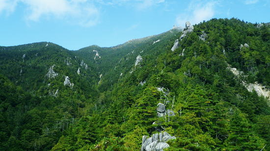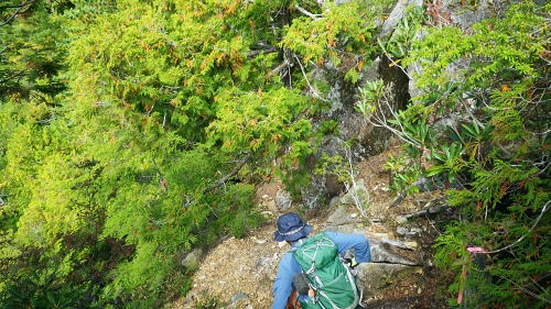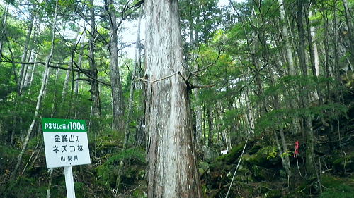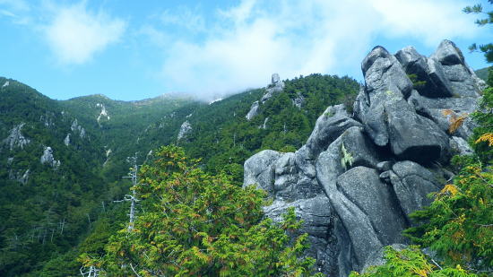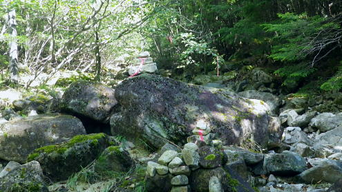 | 半世紀振りの秩父金峰山. 懐かしい旧表参道とこれまた懐かしいクリスタルラインを通り.秩父大弛峠へ・・奥秩父の主峰 アコウ土場から旧表参道に廻り込み.金峰山へ五丈岩を直上し大弛峠に至るコース。 荒川を渡渉し金峰山旧表参道に入り.鶏冠岩.奇岩.隻手廻り岩を越え五丈岩に立つ。締めはこれまた懐かしい大弛峠へ 2018年09月23日.松村 荒川を渡渉し旧表参道と2100m圏の大岩・・デマンドタクシー 隻手廻し岩.五丈岩から金峰山・・下りは大弛峠 北奥千丈ケ岳から連なる大鳥山鳥ノ尾根 クリスタルラインから川上牧丘林道へ.7:47正面は 大久保山南東尾根・・再び柳平へ琴川沿いに遡る 古くから信仰の山でもあり.10代の後半に初めてこの山域に入り.当時は幾度となく金峰山周辺を登り返していた。 時が経ち忘れられた山域になってしまったが昨年は北奥千丈ケ岳から石楠花新道を訪れ.大ダワから徳和に下りたのを切っ掛けに. 先々月は国師岳から鳥ノ尾根を下り.もう一つの金峰山の参拝道を綴り.窪平の金桜神社脇に下りている。 その道中から金峰山を望み.頂から南方に派生する表参道の尾根を見て.気を高ぶらさせていた。昔金峰山へ集中登山したルートの1つでもある。 昇仙峡の金桜神社からの表参道. その一部分だが荒川の上流部から取付き.表参道と合せ金峰山五丈岩を目指すことにした。 入山のアプローチは昇仙峡からではなく.東口の御岳道・・前回の下山した鳥ノ尾根からの杣口.金桜神社に至る尾根。 今回はこの琴川沿いの金柵神社を塩山駅発のデマンドタクシーにお願いし繋ぎ.終点の大弛峠に至る林道から表参道に入る。 アコウ平 1940m圏.ミラーポストには「アコウの土場(とば)」とある.8:409月23日(日)晴後曇 jr御徒町.京浜東北線¥1944. 4:49=4:53神田5:00=6:13高尾:14=7:22塩山.デマンドタクシー¥1000=柳平.¥800=8:40アコウ平. 今までと同様にデマンドタクシーを利用し県道219号線(クリスタルライン)を通り.乙女湖にでて.川上牧丘林道から荒川流域を目指す。 山行前は連日降雨に見舞われ。昨日漸く秋霖前線が伊豆諸島に南下.その合間の晴天を狙い山に入る。 東京では午前中.小雨が残るも甲府市では2日続きの晴れ間をみ.一日の間を開け減水した荒川を楽に渡渉し.初秋の登山日和に迎えられた。 高尾付近では小雨に見舞われたものの小仏トンネルを抜けると雨雲は途切れ.四方津を過ぎてからは西方に青空が見え始めていた。 敬老の日,三連休の中日で16名がデマンドに乗車。柳平では林道の規制から小型車に分乗し.途中のアコウ平で降りたのは私一人だけだった。 「大弛峠までに6km」の表示を過ぎ.アコウ沢橋を渡った50m先にある空地のアコウ平に下車した。車4台が駐車していた。釣師が多いらしいP8台. この広場下部に奥千丈林用軌道跡がある。過ってそこから牽道で引き上げ.木材をトラックで搬送していたと思われる。 シラベの森.8:418:40アコウ平一9:10荒川渡渉地点一10:06御室小屋跡一「ネズコの森」一11:30鶏冠岩. 1960年4月にRHC入部.5月より翌年に掛け.2年間続けて金峰山を中心に新人養成合宿の集中登山している。 水晶峠コース.梓川コース.川端下コース(女子)の3隊に分け金峰山を目指し.下山は金山から木賊峠.黒平を経て猫坂を下り昇仙峡の金桜神社に至る。 この水晶コースは平安時代から山岳信仰の対象として開かれ.「甲斐国史」によると江戸時代には参拝のための参道が甲州側.信州側合わせて. 9本が設けられていた。その中で昇仙峡の金桜神社から金峰山奥社への御岳道は表参道と呼ばれている。 今回の入山アプローチとして東口の参道を持つ川上牧丘線の里宮.杣口の金桜神社前を通るルートを取っていた。 表参道は甲府から弥三郎岳〜金桜神社〜黒平〜金峰山へと山岳信仰の道が開かれていた。 又以前下山したコースは3日目に富士見平から金山峠一金山平一大野山林道一木賊峠一池ノ平林道一黒平一奥御岳林道から金櫻神社bsに降りている。 現在の地形図「金峰山」には破線と林道として残されをり今は歩むハイカーも少なく.一部で廃道化が進んでいる。 金桜神社からコースは奥御岳林道.マウントピア黒平を経て甲府市民いこいの里.甲府市森林浴広場を北上し水晶峠.御室小屋跡地から五丈岩肩に至る。 私は長い道中を割愛し.デマンドタクシーを利用. ほぼ杣口からの表参道を綴り入山した。 東口の参道は窪平から琴川沿いに遡り.杣口の金桜神社を参し.更に琴川を遡り柳平から荒川を越している。・・県道219号線(クリスタルライン) そして第2林道の大弛峠手前にある荒川脇のアコウ平に至り.ここを登山口とし.昇仙峡からの表参道と合わさせ.金峰山を目指すことにした。 古い林班境界標柱.8:51「46年度人工造成地.2林班を小班,シラベ.」牧丘営林区, アコウ平から北側の斜面を荒川に向かい高度にして50mほど下ると川沿いの左岸山腹に回り込み.旧森林軌道跡地にでる。 南西に向かうシラベの水平道は昔の間々のレールが残されていると聞くも.既に軌道は取り外されていた。枕木は残されている。 牧丘営林区の林班