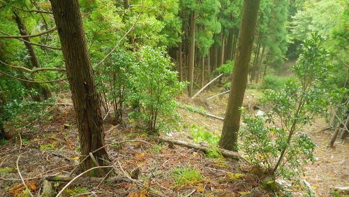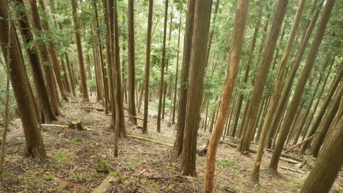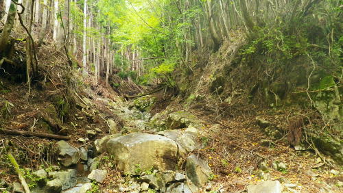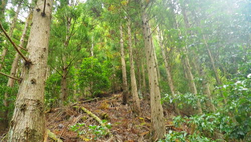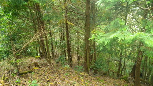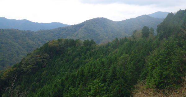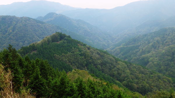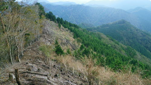 | 夢のよう憧れていた西丸.東丸を擁する尾根を抜けて.直接.大棚沢林道の起点に下る カヤトの伐採地跡から860m圏コブ南尾根を経て東海自然歩道へ―大棚沢林道.新大棚沢林道から切通沢橋・新道終点にでる 山伏峠から大棚沢ノ頭.要所小屋ノ頭.西丸.東丸と甲相尾根越え カヤトの伐採地跡から大棚沢林道と新道終点の二又・・まだ通行止の東海自然歩道 新道の起点から丸尾山をピストン.切通峠の点線県道を越える 東丸の下り.11:19植林帯に入ると闇とは云えぬものの更に薄暗くなり.南面に下る尾根は2つの大きな支尾根を派生させている。 左に巻き気味みに水ノ木方面への主尾根に乗る。右手の南尾根は境小屋沢左岸尾根に当たり大棚沢林道沿いに没している。 南方に向かい急な樹林帯を下ると尾根状になり.小コブを越えると傾斜は緩み.尾根筋がやや左に変って.突然右手に視界が開かれた。 カヤトの原から見る大展望 右上は860m圏コブ.11:24前方は南東に掛けてカヤトの尾根からの大展望が広がりを見せている。踏み跡は左の自然林.右はカヤトの原,カヤトとの境を縫うよう下りている。 又この伐採地跡には前回の小さなカヤトの原と同様に何本もの鋼ロープが放置され.薄い刃型のような金属の部品が幾つも残されていた。 ここで大展望を楽しんだ後.940m圏付近より左の植林帯に入り.910m圏からは南の尾根に移り.先の撮影された風景を横切り.860m圏コブを越えている。 西丹沢世附の山々 ![]() 中央を横切る尾根は織戸峠上部の980m圏から南西に延びる尾根(水ノ木沢左岸尾根)で水ノ木に没している この2年歩んできた山並の山座同定を楽しむ。正面のこんもりした頂が椿丸の稜線. 左手が織戸峠になり.椿丸 重なる右奥が世附権現山. 更に右は丹沢湖の奥.伊勢沢ノ頭や高松山方面を指している。 世附川本谷流域 ![]() 三国山からの駿相国境尾根・・三国山から続く明神山.湯船山〜不老山.日影山.六郎小屋山へ続く。 末端は丹沢湖三保ダムにでる。 中央に霞む遠方は足柄方面の山々.更に朧に明神ケ岳や箱根の山々が重なる。 本谷左岸尾根は椿丸南西尾根. 右岸上流側(手前)の尾根は丸尾山.橡ケ丸を擁する尾根の末端で大棚沢右岸尾根にあたり出合に没していた。 下流側は橡ケ丸から南東に派生する尾根.尾根末端700m点コブから土沢出合へと急激に高度を落としていた。 860m圏コブ南尾根 上左景アップ860m圏コブの南尾根は右斜面に長く落ちる尾根で.大棚沢の大棚橋付近に没している。860m圏コブの頭に重なるのが 椿丸南西尾根から延びる鞍部にあたるのが今年4月に訪れた山ノ神峠。今年の春に山神沢から遡り峠越をし水ノ木へ下りている。 前半は変化に富むが後半は丹沢湖まで長い林道歩きが待っていた。更に翌5月には熊沢からの中間尾根.椿丸南尾根を詰めている。 南西尾根の奥に広く覆う山容は不老山. この林道は番ケ平から先は今だ通行止で.正月に芦沢から登り不老ノ活路から駿河小山駅に直接下りている。 何処もがまだこの1.2年に訪れだした山域で調べれば調べるほど奥深く面白い山域だが.東京上野からは如何しても遠いいアプローチになっている。 大棚沢右岸上流流域 左景・・手前を横切る尾根は東丸南尾根切通峠の南方.1110m圏コブ(赤頭石杭,赤帽白柱659がある)から東方に派生する橡ケ丸や丸尾山を擁する尾根。 欲をかき足元の尾根と合わせ.大棚沢を囲む2つの尾根を少し齧ることにした。 三国山からの甲相尾根 右景・・中央が鉄砲木ノ頭(明神山)左手前が丸尾山.右奥が駿相尾根と甲相尾根を結ぶ三国山。北上すれば甲相尾根の鉄砲木ノ頭.切通峠.高指山。 更に進めば入山した大棚ノ頭に至る。右肩の鉄塔は高指山の北肩に建つ天竜南線の鉄塔で.山梨県白根変電所から 静岡県の新富士変電所を結ぶ送電線鉄塔群。 940m圏から植林帯に入る.11:38この一週間天候の不順が続いている。降雨のあった日が10日も続き.14日から曇天の予報も崩れている。 今朝も昨日の濡れた大地を歩んでいた。今降り出しても可笑しくない嫌らしい雨雲に覆われている。夕方4時には再び 降雨になる予報がだされていた。 それ故ルートを少しカットすることを朝方から考えていた。今までの濡れてもよいという考えは歳と共に夏場を過ぎると消え伏せている。 それでなくとも持続力が目に見えて衰え.気力だけで登れなくなってきた。それでいて古希を越えても登りたい贅沢さは今だ持ち続けている。 一番のポイントだが東丸から水ノ木に下らず.大棚沢林道に方向転換する。又右岸尾根は丸尾山までとし橡ノ丸は諦めた。 カヤトの展望を終え左手の林間に入ると陽光は出ていぬものの一瞬にして明るい台地と離れ.薄暗くなる。 それでも植林帯としては今までより明るく穏やかな尾根が続き.踏み跡もマーキングもはっきりしていた。 940m付近.11:46940m付近から東南東に延びる尾根に乗り.910m付近で南尾根に乗り換えている。本来は南東尾根に入り.水ノ木山の神に降りる予定でいた。 860m圏コブを越え.そのまま尾根を南下する。そして最後は上流(西)側の小沢に入り.