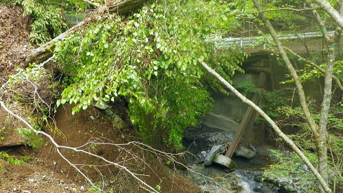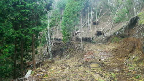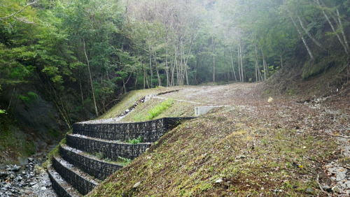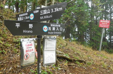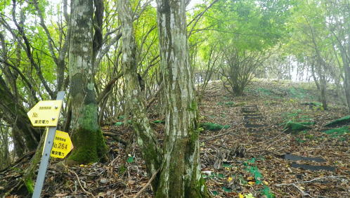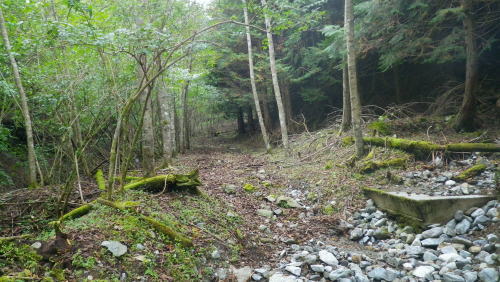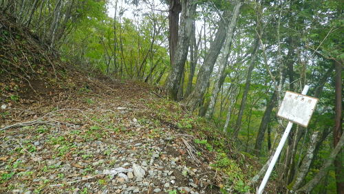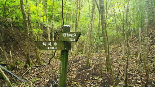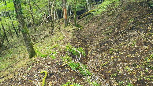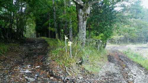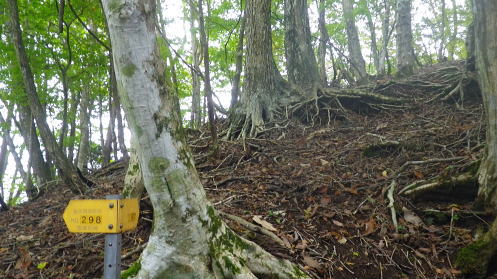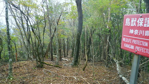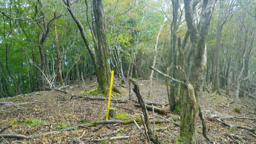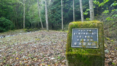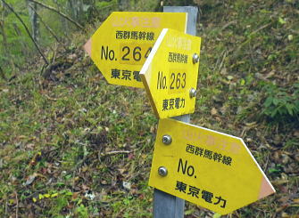 | 西丹沢西端・・丸尾山を擁する尾根と切通峠.下山は平野 大棚沢右岸尾根・・甲相尾根1110m圏コブの東尾根(丸尾山を擁する雑木の小尾根) 新線林道起点から鉄塔管理道.北枝尾根を詰め.東尾根の1025m圏峰・丸尾山をピストン・・三国林道から切通峠を経て湖畔平野 山伏峠から大棚沢ノ頭.要所小屋ノ頭.西丸.東丸と甲相尾根を越え カヤトの伐採地跡から大棚沢林道と新道終点二又 新道の起点から丸尾山をピストンし.切通峠・・2つの点線県道を越え平野へ・今回は黄昏に 丸尾山は三国山稜の切通峠の南側のコブから派生して.大棚沢の世附川との合流点に没する雑木に覆われた支尾根。 東丸を擁する大棚沢左岸尾根を下ってきた。右岸尾根は大棚沢林道から遡り.上部から尾根沿いに下り.丸尾山をピスする。又.切通峠からは山中湖々畔の平野へ 午前中に登ってきた念願だった東丸.西丸を擁する山々を再び間近に眺めながら.登り詰めた尾根にもなっていた。 新大棚沢林道 日蔭沢橋.13:36日蔭沢橋を渡った所で,根こそぎ大地から抜け落ちた大木が林道を塞ぎ.その中を潜っている。 日蔭沢橋を振り返ると旧橋のものらしい橋桁が現在の橋脚下に横倒しで残されていた。 平成22年9月の台風9号等による大災害で数知れぬほどの土砂崩れを起こした地域で.8年間を費やし1つずつ改修され. 偶然にも今月漸く東海自然歩道は開通した。その残骸はまだ多く残されている。そこから知ることも私には多い。 その上更なる被害は途切れることなく目の前で起きていた。 その先南側に尾根が突き出した林道には林班界標「110/111」が立ち.裏側の山側に高指山東尾根への踏み跡が延びている。 尾根上部には鉄塔管理道を横切り.佐久間東幹線300号鉄塔が建ち.バラジマ林道から入る管理道と結ばれている。 新たに改修された護岸.13:55 「新設工事起点」には東京営林署と刻まれていた.13:56林道新道 新大棚沢林道の終点広場の片隅へ.沢沿いを進むと「平成元年度.新大棚沢林道(1)(自2).新設工事起点.東京営林署」と林道新設起点 の銘板がある。林道銘板から読み取ると大棚沢林道は昭和55年に建設され.奥に繋がる新道は平成元年に延長工事が行われた林道。 林道の屈曲点からは右上に同じ幅でカーブして登るが.直ぐ先で行き止まる。大棚沢林道支線(1)か? 又入口角に 電源開発の管理道標柱「298→」が立つ。この鉄塔管理道は298号鉄塔から高指山の東尾根に建つ300号鉄塔へと進み. 先ほど通った切通沢橋からのバラジマ林道の標柱分岐と結ばれていた。・・後に新大棚沢林道と知る。 更にバラジマ沢沿いに林道を遡れば301号鉄塔分岐を分け林道終点から小尾根を詰めて甲相尾根のバラジマ峠に乗っていた。 今回は直進して大棚沢林道の終点まで歩み.大棚沢の細くなった沢を横切り大棚沢尾根へ。 西群馬幹線と天竜南線の鉄塔共用の297号鉄塔の建つ尾根に向う。その先に聳えるのが丸尾山. 見るからに路面が荒れる新道林道.13:56直進し進む支線林道の起点は新道(自2)か? 名称は逆かも知れない。広場を横切ると植林帯との境の左岸の河原沿いを進んでいる。 路面は大分凸凹に崩れ.200mほど進むと林道の終点にでた。距離は短いが新道は荒れ.再び改修せねば車両の通行は無理のようだ。 新道終点.沢を渡り山道へ.14:01切通峠までは神奈川県道729号線の点線県道に変わる 新道終点の河原で最後の道標を見る。切通峠まで0.8km.1時間の距離にある。 神奈川県側の点線県道に変わり.右岸に楽に渡渉して山道をジグザグに登ると山腹は緩やかな山腹斜面に変わっている。 トラバースの水平道が切通峠へと導く山道. 点々と赤テープが付けられ.植林帯を縫う確りした登山道が付けられていた。 巡視路標柱を見て北枝尾根を詰める.14:13途中で再び電源開発の巡視路標柱「←298,297↑」を左脇に見て.登山道を右に分け.南側へ延びる小さな自然豊かな枝尾根を詰める。 この尾根は西群馬幹線と並行し.2つの送電線の中間の北尾根を詰めていた。更なる上にも標柱があり. 横切る管理道は登山道と兼ね峠にでている模様。丸尾山から戻って切通峠へ下る登山道はここを通っていた。 プラ階段が道案内になり.一歩一歩登れば「みどりの協定区域」の看板裏から三国林道のヒモシ峠にでられた。 正面に建つのが279号鉄塔.その基部からは南北に甲相と駿相との2つの県界尾根が連なる大展望が描かれていた。 再び標柱を見てプラ階段の管理道を登る.14:21三国林道・・火燃峠(ヒモシ峠) 正面は佐久間東幹線297号鉄塔.背に東電の鉄塔が建つ.14:23ここは甲相尾根1110m圏コブ(赤頭石杭.赤帽白柱659がある)からは東方に派生する尾根上になり. 妙に広いスペースの三国林道の広場。手前に「みどりの協定区域」の看板があった。 ・・東電.送変電建設所々長と神奈川県知事の協定.s62年10月13日とある。 三国林道は三国峠を起点とし甲相尾根の相州側の山腹を綴り.土沢源流々域を回り込むダートのピストン林道。 終点は橡ノ丸の西肩になる。大型のゲートがあるが通年閉鎖され.道中は荒れ果てた廃道状態で林道ら