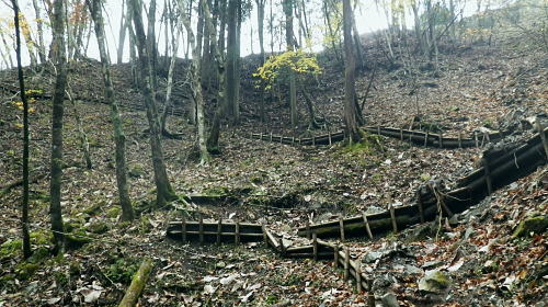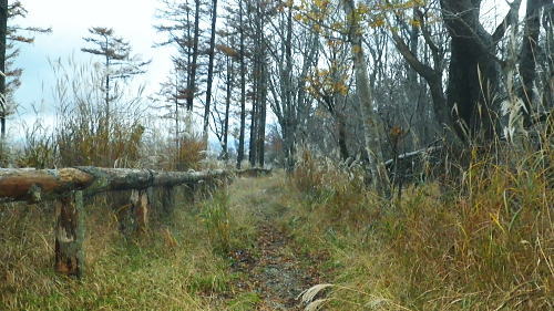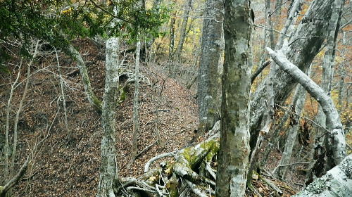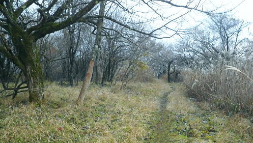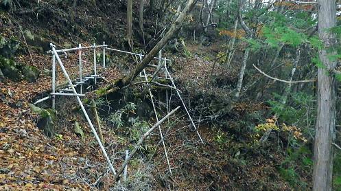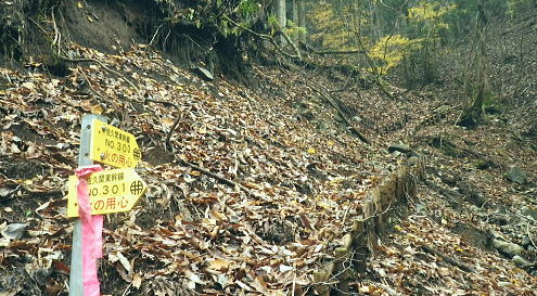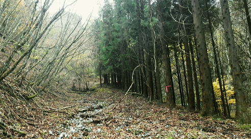 | 西丹沢の西・甲相尾根を往復し高指山を越える 大棚沢林道を左に分け.バラジマ林道から鉄塔管理道を経て高指山東尾根―下山の西尾根は薄原に回り込み別荘地から平野へ 高指山東尾根・・佐久間東幹線300号鉄塔.西群馬幹線261号鉄塔.天竜南線148号鉄塔 明神峠から水ノ木林道丸尾峠へ 丸尾橋からバラジマ林道に入る 管理道分岐から高指山東.西尾根から湖畔.平野 ・・再び里の鹿 高指山東尾根(鉄塔尾根) 佐久間東幹線298号鉄塔基部より.10.16/14:24先月訪れた丸尾山を擁する大棚沢右岸尾根の佐久間東幹線298号鉄塔基部から北方を望む風景・・丸尾山を擁する尾根より 背は大棚ノ頭と要所小屋ノ頭から延びる西丸・東丸を擁する尾根. バラジマ歩道 廃林道・左.管理道分岐から直進する沢沿いを望む.14:11巡視路の分岐から西側に更にバラジマ沢右岸道が綴られているバラジマ歩道は甲相尾根の富士見峠平に至る。 バラジマ林 鉄塔分岐から林道を更に直進しバラジマ沢沿いに詰め.右に西群馬幹線の標柱を見送ると「平成元年度.バラジマ林道(自2).新設工事起点. 東京営林署」の銘板があり.林道の終点にでて.突然切れる林道の5分ほど先で.左手に入ると登り易い小尾根が延びている。 急登を這い上がると踏み跡を見付けている。バラジマ歩道か? バラジマ峠に至る。 又林道の途中にある西群馬幹線260号鉄塔への分岐から管理道に入れば山腹をトラバースし.南西尾根を詰めて甲相尾根にでられる。 出た処に巡視路標柱があり.大棚ノ頭よりに西群馬幹線259号鉄塔が建てられていた。確りした道で下るには適しているようだった。 300号鉄塔の管理道分岐14:11鉄塔分岐―15:40高指山16:10―17:09山中湖平野bs.・・日没16:40. バラジマ沢沿いに遡り.この鉄塔分岐から高指山東尾根(バラジマ沢右岸尾根)に乗り.云わゆる3つの送電線の幹線鉄塔基部に立つ。 電源開発の黄色いL字鋼の標柱の分岐から腕プラに従い林道を分け.河原と離れている。鉄塔巡視路を綴り.左に折れ小沢の右岸に入いる。 沢沿いに左に回り込むと直ぐ高指山の東尾根末端の伐採された坊主原が広がる小尾根に乗り.先に建つ佐久間東幹線300号鉄塔基部にでる。 黄昏の迫る高指山に立ち.帳を迎える東海自然歩道から平野に下りる積もりでいた。 整然と造られた鉄塔管理道.14:18分岐から手間を掛け整備された管理道に入る。木杭棚が崩れぬよう沢沿い全体に防砂用に網が敷かれ.土砂を包み込んでいた。 以外と長いジグザクを登る。末端尾根に乗ると赤頭黒杭の境界杭と赤いコンクリート杭があり.「貸」と赤く刻まれた杭と苔だらけのコンキリート杭が続く。 ツメにで出るとる間を開けず佐久間東幹線300号鉄塔にでた。分岐から10分も掛からずして禿尾根に立ち.くすすんだ基部からの展望が開かれる。 バラジマ沢に没する高指山の東尾根末端 崖の樹林帯を抜ければ禿尾根に乗る.14:33大棚ノ頭と要所小屋ノ頭南東尾根 300号鉄塔基部より前回の取付き尾根を仰ぐ.14:31先月歩んだ西丸.東丸を擁する尾根南面のツメ部分. 左側の異なる送電線は西群馬幹線260号鉄塔。右奥に並行する佐久間東幹線303号と301号鉄塔になり.右脇の谷間が要所小屋沢。 南東尾根を越えた佐久間東幹線は道志川沿いに道志側を北上し.宮ケ瀬湖の西岸へと抜けている。 東丸と椿丸 北面を望む遥か先は屏風岩山方面左手が金山歩道が乗る尾根. 東丸の西鞍部に突き上げるのが境小屋沢。隔てる先の中央のコブ. 860m圏から右に延びるは前回下った南尾根。南尾根の末端に入り.大棚沢林道の起点.少し上部に下りている。 丸尾山を擁する尾根 南面の谷間を望む手前の谷間は日蔭沢,奥は切通沢。鉄塔尾根を越した左奥は駿相国境尾根。 前回の山行後半のルートは大棚沢右岸尾根・・1089m点コブ.佐久間東幹線297号鉄塔と西群馬幹線264号鉄塔.甲相尾根に乗る1110n圏コブ。 上写真のアップ・・鉄塔の間は火燃峠(ひもし)中央が鉄塔間の切通沢に没する小さな北尾根を詰めている。途中で鉄塔管理道が綴られていた。前回丸尾山への登りで利用した。 甲相尾根1110m圏コブと左手に建つ264号鉄塔 新大棚沢林道新道の起点に下る管理道と標柱.14:37東尾根に乗り分岐から高指山に登る東尾根を右に分け.電源開発の巡視路標柱「299↑」に従い鉄塔管理道で山腹を巻くと日陰沢を下り返し. 切通沢沿いの林道分岐にでる。分岐には東電,西群馬幹線の標柱「←297.298↑」が立てられていた。前回の山行の大棚沢林道の終点に当たる。 そこから切通沢を遡り丸尾山を擁する尾根に乗れば写真対岸に建つ297号鉄塔の基部にでる。前回はこの小尾根を直登し高指山を目指していた。 尾根伝いにそのまま進めば東海自然歩道にでている。その手前には西群馬幹線の標柱「←261号.262号鉄塔→」があった。 はっきりした鉄塔巡視路を左に分けていた。又東海自然歩道にでた高指山の頂手前でも煩いほどの同じ標柱を見ている。 この一角の支尾根は何処も同じような標柱が幾つも立てられている。それ故.この地区は送電線の銀座とも呼ばれていた。 痩せ東尾根が続く.14:49 