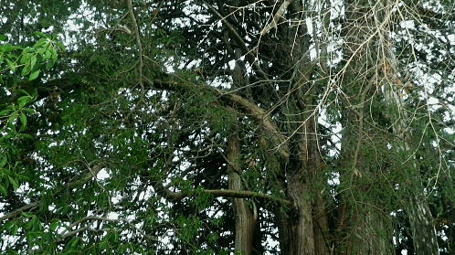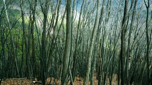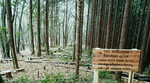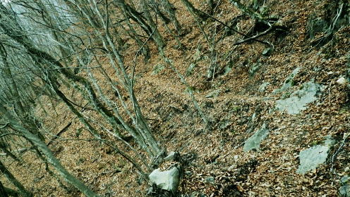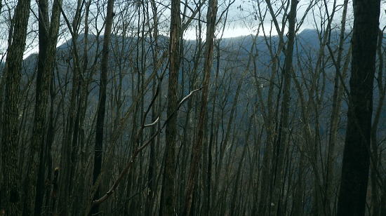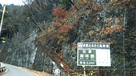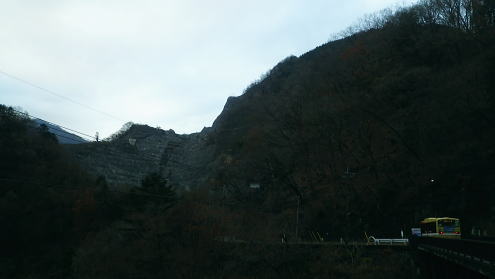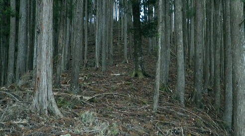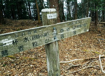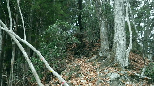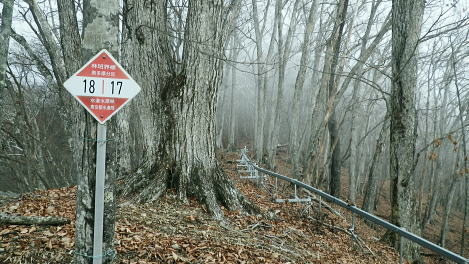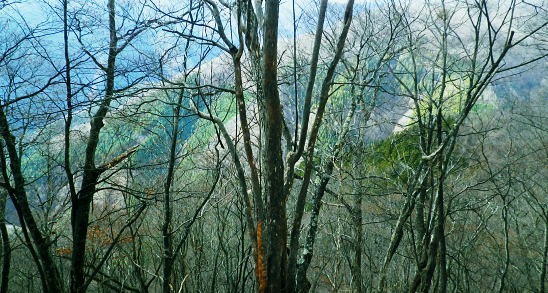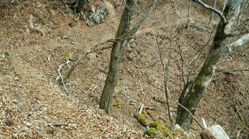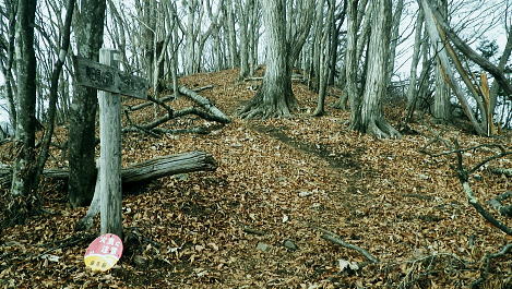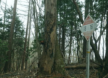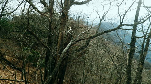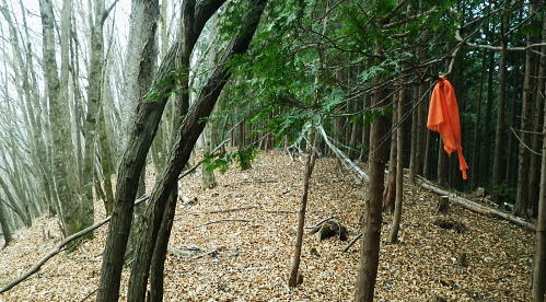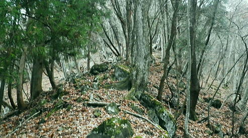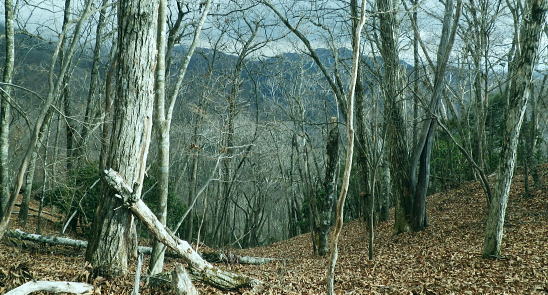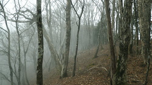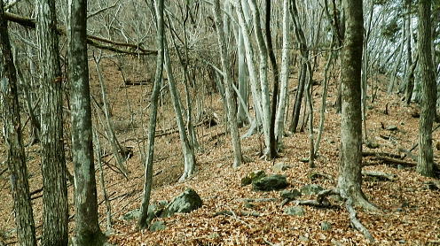 | 横篶尾根を南下し.見通尾根に抜ける ・・日原川倉沢谷Top 軌道沿いに板形尾根を詰め三ケドッケ南山腹道から一杯水避難小屋へ。横篶尾根からは見通尾根へ抜け.倉沢地区 小川谷滝上谷手前の谷から板形尾根 板形尾根から横篶尾根.更に見通尾根を下る・・闇のバス停に街路灯が点く 大栗尾根上部 板形尾根から乗れなかった尾根を振り返る.11:451368m点コブと1450m圏の大岩壁 滝上谷を隔てる大栗尾根 大栗尾根末端付近に刻まれた小川谷林道の側壁の石垣を登り植林に変わると右手から滝上橋からの明瞭な踏み跡が合わさり. 中段歩道を横切っている。1049m峰を過ぎて間伐で歩きずらくなり.植林が切れたころで.写真の1368m峰の緩斜面にでていた。 ミズナラとブナが見事で右上部の大岩を左側を巻き気味に越せば長沢脊稜に飛び出す。 本来はこのルートを取る筈だった。滝上谷?(クラミ窪)の左岸尾根に入り込み.中段歩道から板形尾根上部にでてしまった。 その板形尾根からの大栗尾根の展望. 板形尾根のツメ近くで.11:47小川谷林道の滝上谷橋に同じ林班界標「18/17」が立つ 12:18板形尾根のツメ近くで同じ区分の標柱.林班界「奥多摩区分18/17」を見て長沢脊稜にでている。12:16 道標の背の右上の高みが板形ノ頭. 脇には「18/16」の標柱が立つ。18区分のT字路地点に居るようだった。 数字からの理屈はそうでも.実際は面でT字に描かれた林班界区分線だろう。ここから脊稜を更に数十m下る短い範囲で「16/15」の標柱がある。 ガスが湧き始めた長沢脊稜 三ケドッケの鞍部へ.12:21長沢脊稜を綴るのは三ケドッケの鞍部までと短い距離で中腹道を下りている。 今回はガスが湧き始め展望は望めず.三ケドッケを諦め.鞍部から山腹道に回り込み避難小屋に逃れ昼食を摂ることにした。 秩父の展望は見定められなかった。実は昨日,鶴ケ島に住む滝島先輩から奥武蔵へ2週間後の誘いを受けている。昨年は共に武甲山に出向き. 大持山から大栗山のこの脊稜を眺めていた。今日は逆方向から改めて望められる筈と期待していた。だがガスは更に濃くなっている。 三ケドッケの南山腹道 既に冬木の世界.12:28冬木の山道 以前は瑞々しい若葉溢れる春先の新緑に被われた山腹道を縫い.小川谷上段歩道に抜けている。 又数年前の早秋だったが早くも艶やかな紅葉の華麗な色彩に満ちたカロー谷に入り.山腹道を落葉を蹴りながら賀郎大滝を見てもいる。 今回の山腹道は既に枯葉を落とし.曇天の淡い錆び色一色の地味な色彩に変わっていた。天候が崩れれば雪粒が舞ろだろう。 カロー谷滝前窪源流の大らかな斜面.12:34 対岸は板形尾根.13:36 一杯水避難小屋.12:44〜13:20一杯水避難小屋に訪れたのは今回で3回目になる。一度目は秩父の大平山を抜け.一昨年は旧倉沢集落から 幕岩尾根南東支尾根に入り.横篶尾根を周回する形で小川谷左岸道を下っている。今回は滝入ノ峰から見通尾根を綴り倉沢に下りる。 脊稜はガスが巻き上げていた。昼食は避難小屋で摂る積もりでいたが.外は薄日が時折差している。 日溜まりが恋しく小屋前の野外卓へ。ただ風はないがやはり肌寒い。熱い紅茶にウイスキーを少し垂らしサンドイッチをほう張る。 又.ミカンにアミノバイ5000を摂っている。もう1つのテーブルには中年4人組が食事と酒宴を兼ね賑やだった。 横篶尾根 野外卓より.13:20既に裸林に変わるも明るい横篶尾根の道筋は樹林の色合いは.枯葉が落ちるもまだ秋の兆しの方が強い。 昼下がりの陽射しを受けているためだろうか。 右奥が滝入ノ峰.その左裏が見通尾根の取付き.13:27鳥屋戸尾根から町界尾根の大岳山方面 左手の日原川倉沢谷を隔て.13:28板形尾根東面 右手はカロー谷が落ちている.13:39 登山道が山腹に回り込む手前の1304m点付近.13:46「←東日原バス停,一杯水避難小屋→」の道標に「火気に注意」の東京都の古い道標。 道標の裏には塩地谷茅尻沢へ下る仕事道がある。又横篶山幕岩尾根の鞍部からも.戻る形で仕事道が合わさる。 共に茅尻沢へ.登山道はここから横篶山の右山腹を巻き.更に滝入ノ峰は左山復を巻いている。 滝入ノ峰は左山腹を巻く水平の登山道.14:00横篶尾根の左手.倉沢谷側の1290m台に延びる長い水平登山道に入る。道幅は狭く左の路肩は抉られた小道に変わっている。 滝入ノ峰の山腹を回り込み終えると見通尾根の取付きにでた。ここは再び登山道が尾根筋に戻る地点. 本尾根を下る場合は横篶尾根末端で2つに分かれ.西側の中日原の日原森林館と東日原bs附近とに登山道を分けている。 以前はバス停から少し戻るコースで尾根を乗っている。日原森林館側の先は小川谷左岸水平歩道と繋がれカロー谷中腹に下りている。 見通尾根の取付き.14:073等三角点標のある滝入ノ峰から南東に派生する尾根は自粛要請標識のある尾根で作業道が綴られ道標類はない。 尾根の取付きは登山道が右に尾根筋に曲り戻る1240m点. アンテナが立ち植林帯に接する境をなしている。 開けた左手の遠望は鳥屋戸尾根末端越しの平石尾根. 頭がチョコンと乗るのは川苔山のようだ。登山道