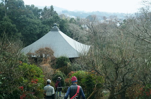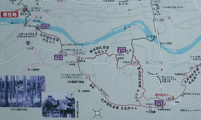 | 秩父音霊場34ケ所 秩父市の荒川左岸の札所. 22番.23番.21番.20番.19番と小鹿野の札所31番を綴る 。 2018年12月23日.m滝島.鈴木.松村 秩父札所 秩父札所三十四ケ所観音霊場は文暦元年(1234年)甲牛三月十八日開創と伝えられ.長享二年(1488年)の秩父札所番付。 (長享番付 札所三十二番蔵)が実在していたことから室町時代の後期には秩父札所が定着していたと考えられている。 江戸時代に入ってからは多くの江戸庶民の観音巡礼の聖地として賑わいを見せていた。 又西国三十三ケ所.板東三十三ケ所と共に日本百番観音に数えられている。 秩父市.横瀬町.皆野町.小鹿野町に点在するお寺で秩父札所34ヵ所は観音霊場と呼ばれ. 今回は滝島先輩の提案で同期鈴木と共に荒川左岸と小鹿野の札所を訪れた。アクセスにはマイカーを使用している。 公共機関を使えば西武秩父駅からは西武観光の路線バスを利用し.「小鹿野車庫・栗尾」行の終点までの沿線を綴れ,巡札し廻ったことになる。 「 仁王門」の童子堂の山門.9:45久し振りの東上線若葉駅に8時.滝島さんと待ち合わせて.県道でなく高麗川沿いの細道を綴り.高麗武蔵台へ。 鈴木と合流.巡札の旅にでる。正丸トンネルから横瀬を抜け.秩父に入ると秩父公園橋で荒川左岸に渡っている。 左前方に秩父ミューズパークを見上げられた。右折し長閑に朝陽が差し出す県道72号線を北上すれば点々と札所が鎮守し .左岸道からはおぼろに霞む武甲山が望まれた。 河川丘陵の田舎道的な田畑の雰囲気を持つ住宅地に入ると初めての札所.童子堂の境内に入る。 童子堂の山門は仁王門の童子仁王といい.又山門の左脇には童顔の六地蔵尊が祀られていた。 華台山・童子堂 札所22番.9:39聖観世音菩薩・真言宗豊山派・・秩父市内 このお寺は正式には「永福寺」と名指すが子供にまつわる伝説が次々に生じ.今の「童子堂」という呼び名が目立ち呼ばれるようなった。 府坂地内より現在の地.永田城跡に移したと伝えられ.近くに城の堀跡が今でも現存されている。朝日を浴び.巡札者に会うのも疎らが又よい。 境内から山門背は秩父ミューズパークに至る尾根 この尾根を右に下り終えた所に音楽寺から下る江戸巡礼古道(長尾根道)の尾根道が綴られ.直坂を下ると府坂地内にでる。 そこに江戸元禄から明治末期まで旧22番が童子堂あり跡地が残されている。更に下った街道沿いに薬師堂がある。 その先が札所21番.観音寺になり.これからそれぞれを巡礼する。 里を向く木祠 音楽寺への旧道口.9:45次は音楽寺への落葉道.明治巡礼古道(中山みち)を歩む 武甲山・・長者屋敷尾根が横切る 十三地蔵のある小鹿坂峠より.10:09昨年4月に3人で訪れた武甲山。小雨に見舞われ一時みぞれにもなり寒かった。頂は冬木に覆われるも.裾は若葉が燃え始めていた。 長者屋敷尾根表参道から浦山口駅に至る。秩父市街地と右奥が城山. 長閑な尾根沿いにでる松風山・音楽寺 札所23番.10:17聖観世音菩薩・臨済宗南禅寺派・・秩父市内。秩父ミューズパークの最北端の小鹿坂峠には十三地蔵が祀られている。 その下に位置するのが江戸中期の大きな堂.音楽寺。近代的な名前であるが松の梢を吹く風の音から生まれた寺名。 近年音楽に関せる願い事をかなえてくれる寺として歌手らの祈願が多いことで知られている。願い板にはビヨが用意されていた。 滝さんグループも祈願に訪れたとのこと。目指す先はまだまだ先のようだ。 音楽寺内陣 正堂の右脇に構える天神様木祠の上を被うのが天然記念物の「御影松」.1本の枝が横に長く延びている。 この「御影松」の梢を吹く風の音から寺名が付けらたのだろうか? 天神様は学問の神様として祀られている。 二子山東尾根 荒川に直接下りる公園より.10:24秩父市街地と左下が公園橋の斜張塔。市街地の中央を横切るのが昨年武甲山から見下ろした秩父駅前の公園・緑地. 北側は「見晴しの丘」.南側は「芝桜の丘」と呼ばれ.「芝桜の丘」には9種類.40万株の芝が咲き誇る。 「中山みち」に戻り.10:34要光山・観音寺 札所21番.10:52聖観世音菩薩・真言宗豊山派・・秩父市内 車を停めた童子堂に戻り.更に県道72号線を北上すれば直ぐ道沿い左に観音寺を見る。ここから再び巡礼古道を歩む。 観音寺の本堂左側には六地蔵尊が並び.右には「宝篋印塔(ほうきょういんとう)と地蔵尊」がある。 境内には六地蔵尊の他に11体の地蔵尊とその後宝暦14年建立の宝篋印塔が立てられ.歴史的には貴重なものらしい。 その奥の墓地との間には「八幡宮」が祀られていた。 昔この観音寺は八幡宮の社地で観音様を安置するとき.この一帯の悪鬼共が反抗して火の雨を降らせた。 このとき土地の守り神の八幡宮が鏑矢(かぶらや)を放って火を追い払ったとされている。 法王山・岩之上堂 札所20番.11:05聖観世音菩薩・臨済宗南禅寺派・・秩父市内 観音寺の先.学校前から道路の対岸に渡ると古道の分岐に合わさる。右に折れれば明治巡礼古道(寺尾みち)に入り.童子堂に戻っている。 左に折れれば江戸時代の道しるべ石があり.江戸巡礼古道(
