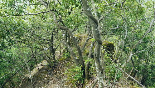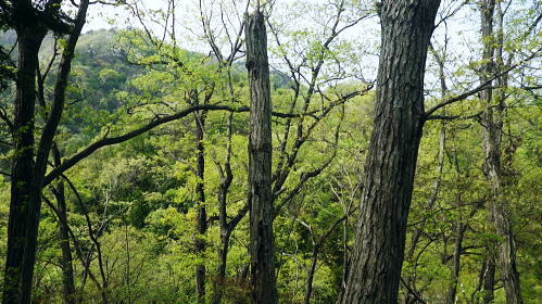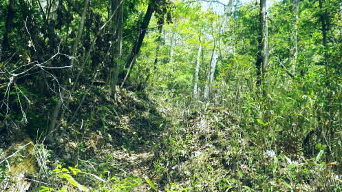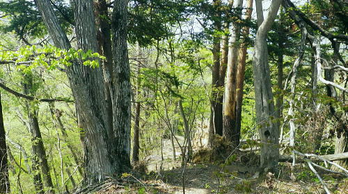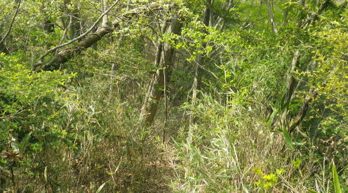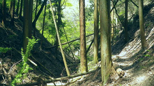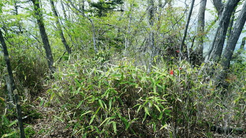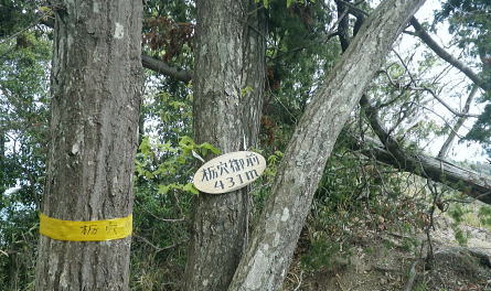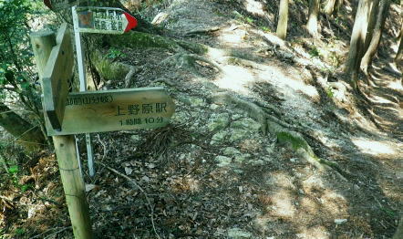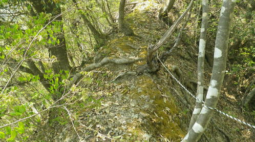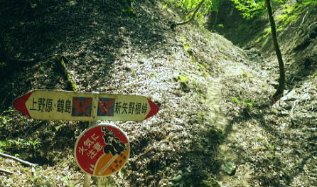 | 新矢ノ根峠から下り2つの御前山・・武田氏陣営の御前山Top 久し振りに山との触れ合いは新矢ノ根峠からのんびり鶴島・栃穴御前山を越え.甲州街道からjr四方津駅へ ・・牧野で途中下山し.四方津.御前山は諦めている。 犬島神社から新矢ノ根峠東尾根 鶴島御前山と栃穴御前山・・法性寺と妻の実家.下谷灯明寺 高柄山中尾根・・ホウジ丸と高柄山 新矢ノ根峠東屋前より.11:572年前の2月.落合から中尾根を詰め.高柄山から北尾根を下り久保に下りている。この山行が切っ掛けになり. 旧秋山村の沢沿いの低山を1本づつ北上し.県境手前の綱子川右岸尾根まで周回することになった。 ・・608m点鞍部 同注・・608m点から田野入林道へ 高柄山からは20分で市の道標のある鞍部に降り立つと直ぐ傍に赤い「銃猟禁止区域」のプレートがあり.その裏に1本の踏み跡が延びている。 ここを起点に南側に下る踏み跡は途中で失うが広い植林を真っ直ぐ下り.周りに目を凝らすと沢筋が1本現れる。 沢沿いを下降.旧矢ノ根峠からの岩場と合わせ過ぎれば確りした作業道から田野入林道終点にでる。 次回の入山ルート・・ただ上りの場合踏み跡は薄く消えている。林道終点からは482m点峰が見上げられた。 起点まで30分はhelnyan氏のブログから記載させて頂きました。 鶴鉱泉分岐の尾根の下降点.11:58メオプルポイントGCの開説で新たに造られ.既に確り踏み固められていた登山道。 尾根から沢底へ.12:21よく踏み込まれた登山道に入る。歩き易いが足元のクッションが踏み固められ硬過ぎ.何時もは感じない微妙な擦れを肩に感じていた。 やや今までより早足になったためかも知れない。それでも普段より大分遅い。慌てることもないが宥め歩くしかなかった。 桜散る 新峠から北東に延びる尾根を下り鹿柵沿いを綴ると尾根筋が一時途切れ.ロープで塞がれていた。 そこまでの雑木林は尾根筋にゴルフ場の柵が造られ.少し外れた山腹道を下っている。 谷間を隔てる西側の明るみは若葉に燃える新緑の瑞々しさがみなぎる山肌を現していた。 谷間から巻き上がってきた春風が新緑に覆われた一面の山腹とは対照的に.桜吹雪とまでは言えぬがピンクの花びらが舞い運ばれてきた。 細かいひと房の花びらが重なるよう舞い.大地に散る姿に情緒をそそらされいる。風を受けるのも気持ちよければ仰ぐ風情も心地よい。 それが以外と長く舞散り.途切れては又桜の葉は舞っている。 何処から舞ってきたか頭上を探すも風に乗り分からなかった。ただ緑に覆われた山肌の疎ら中に,点々と山桜が数えられる。 時折風を感じると又舞ってきた。まだ葉桜には早いが贅沢な桜吹雪とこの沢沿いで出会い.よい風情を漂わしていた。 そこから登山道は塞がれたロープに導かれ.東側の山腹を下り薄暗い植林帯に入る。切れた所で向かいに見えたのが350m圏コブだろう。 沢底に降りていた。古い道標があり.ムジナ沢に下る分岐まで再び登り返す。それにつれシノザサが次第に茂みを増し背丈も高くなる。 杖突沢上流の枝沢を横切る.12:25 枝突沢の源流.12:28向かいの枝突沢の源流の枝尾根から沢底に降りてきる二俣にでる。高柄山からの背稜に続く新矢ノ根峠越えての北側の尾根で. メーブルポイントGCの北西部で再び鶴島鉱泉分岐を越え.鶴島御前山へ突き上げていた。 地形的には一度枝突沢の源流に降り.再び尾根筋に戻る形で鶴島鉱泉分岐にでている。 シノザサの山腹道.12:33シノザサの茂みに合わせ再び左の山腹を登りながら回り込むと鶴島鉱泉分岐にでる。 左(西側)の谷間が枝突沢で.枝突地区に流れ込んでいる。その西対岸が高柄山北東尾根.分岐の右側がムジナ沢。 又枝突沢右岸尾根はこの先2つの御前山を越え桂川の吊橋を渡った折.枝突沢出合の岩盤口が真横に振り返り見下ろされている。 鶴島鉱泉分岐を分け直登.12:51注・・法性寺と金毘羅山 分岐道標「上野原駅1時間10分」に従い.右に折れムジナ沢左岸を巻きながら下ると右下に堰堤を見て.渡ると林道にでる。 送電線道志川線を潜れば琴平神社があり山梨県指定天然記念物「鶴島のムクノキ」がある。 別名ムクエノキとも呼ばれ.樹齢約700年で高さ23.4mの巨樹。対岸には法性寺があり.その下流に鶴鉱泉「つるや旅館」が建つ。 法性寺は石段を上って山門を潜れば本堂が建立されていた。このお寺は「富士山」と号するが富士吉田上吉田にあった法性寺で. 富士浅間神社の神宮寺であり.この廃寺によって賜ったことによる。宗派は天台宗.本尊は東京都台東区の灯明寺から譲り受けた寄木造の 木像阿弥陀如来座像で.慈恵大師作と伝えられ藤原時代の特徴を備えてをり.山梨県指定文化財になっている。 過っては毎年4月初申(はつざる)に護摩修業が行われていた。灯明寺は又妻方の実家の檀家に当たり.境内には藤棚が囲まれ入谷にある。 後記.そこことを住職に伝えると住職は私の言葉を参考に.単独で調査に出向いたとここと。 琴平神社の赤い鳥居を潜り踏み跡から道志川線13号鉄塔を過ぎると露岩が現れ.奥社にでる。更に岩尾根をたど