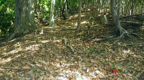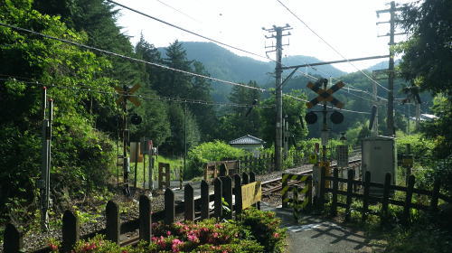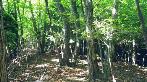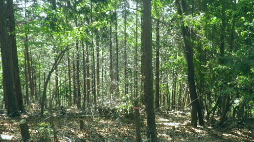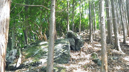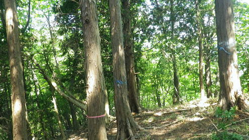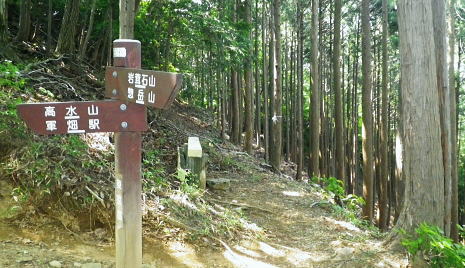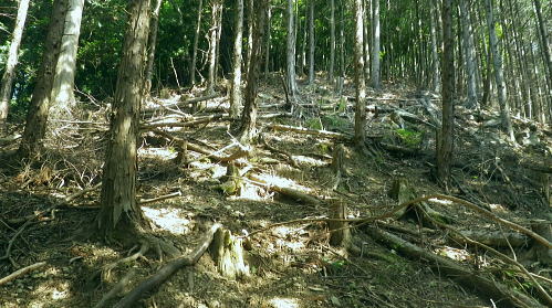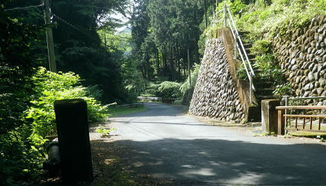 | 高水山から旧伏木峠.松ノ木峠.伏木峠と繋ぎ.旧径路を繋ぎ榎峠からjr軍畑駅に戻る。・・高水山と上成木周辺Top 平溝川流域の伐採地を平溝林道で抜け.バラクボ沢左岸尾根を登り高水山を南北に横断する。高水山北東のカヤノ沢左岸尾根を下り成木七の里へ. 旧伏木林道の起点から峠路に入り.旧伏木峠から大指山を越え.松ノ木峠から伏木峠に回り込み.旧径路から榎峠にでてjr軍畑駅に戻る。 2019年06月06日.松村 平溝道.林道から大沢川に入り.バラクボ沢右岸尾根・・二俣尾(五)分岐と高水山の西肩 高水山北面のカヤノ沢左岸尾根から上成木(七).旧伏木林道起点 峠路を綴る。旧伏木峠.松ノ木峠.伏木峠から榎峠へ・・県道からjr軍畑 2週間前に「大左名無し尾根」から馬仏山の稜を越え平溝川側の小沢川に下りている。今回は直接.平溝川・小沢川から平溝林道に入り. 高水山南面から源流側の支尾根.バラクボ沢左岸尾根に取付くことにした。前回は対岸の玉指沢左岸尾根を詰め平溝尾根にでている。 後半は北面の高水山北東のカヤノ沢左岸尾根を下り.上成木(七)からは南方に位置し標高500mに満たぬが山懐深い旧伏木峠周辺の峠路を探索する。 旧峠から逆Z字に松ノ木峠から戻る形で松ノ木沢の造林小屋に寄り.伏木峠から白岩を経て榎峠.jr軍畑駅に下りている。 梅雨と猛暑の兼ね合いで入山した。 雷電山と辛垣山 jr軍畑駅東方の踏切.7:096月6日.晴時々曇 jr御徒町.¥1080. 5:01=5:07東京:10=6:07立川:10=7:07jr軍畑. jr軍畑―7:17二又尾入口―7:35二俣尾分岐―8:11平溝林道ゲート―8:19バラクボ沢―9:10取付分岐. 今年は5月下旬から夏日が続き.6月に入ると更なる猛暑に。今日も青梅では32℃を超す夏日が続くと予報がでている。 朝方の東京は曇天に覆われるも福生(ふっせ)を過ぎると陽射しが車内に直接射し込んでいる。やはり暑くなりそうだ。 平日に係わらず好天に恵まれたせいか.車内はハイカーが多く乗車. それでいで軍畑駅に下車したのは私独り.驚きの入山になる。 前回は山を下りた時は土曜だったせいか.軍畑駅からは都会並のラッシュで驚かされていた。今日は又ホームに誰も下りぬ姿に当惑さえさせられてもいた。 都道193号線・成木街道・・二又尾の高みへ.7:17今まで高水三山のアプローチとしては常に平溝橋から入山している。今朝は初めて平溝橋手前の長坂から二俣戸の高台へと回り込む。 二俣戸の地名は広い範囲に渡っている。JRの前駅は「二俣戸」.3丁目に当たり.ここは前回下山したコースと同じ5丁目あたる。 県道の右手に「国立奥多摩美術館」? 長い平屋の増築を重ねた不思議な館があり.ここから二俣尾の高台に登り,高水ハイキングコースの分岐手前の 平溝通りに降りている。まずは展望よく県道の煩わしさもない。畑の中の長閑な石敷道から入山した。 平溝尾根末端の433m点コブ東南東尾根 高みにでて振り返る.7:21左遠方は青梅丘陵・・辛垣山と三方山 前回は平溝尾根末端からこの尾根を繋ぎ下る予定でいたが南側のjr古里線の巡視路に下っている。新所沢線の31号鉄塔に寄り道して. 南側の山域にに下りている。この尾根は433m点コブから南西に延びる32号鉄塔尾根だろう。前方に見える急階段は1つ手前に枝分かれしている尾根。 平溝尾根の下端裏側の尾根になる。jr古里線が尾根上を綴っている。 畑の石敷道左上の二俣尾5丁目第2運動場(地震等の避難場所)と畑との間には石畳があり.抜けた正面には廃屋がある。茅葺屋根は崩れ落ち,かなり古い。 突き当りのT字路を右に折れると新所沢線の黄色いL字プラ「33号鉄塔に至る」の標柱を見ている。巡視路を詰めれば小尾根から33号鉄塔を経て. 前回歩んだ433m点コブに乗っている。今回はそこを迂回してる。 里山を繋ぐよう巨大な鉄塔が連なる.7:25歩んでいるのが平溝川右岸の高台を綴る里道. 北正面には新所沢線34号〜36号の鉄塔群が並び.里山らしい風景が見上げられている。 今日は午後.この送電線の老番.39号鉄塔の基部に立ち.松ノ木峠にでる積りでいる。又真向いの34号鉄塔手前の裾には慶徳寺がある。 そして里道伝いに左へ仄かに下ると通い慣れた高水三山ハイキングコースの「平溝通り」に合わさった。 平溝みち 平溝川橋(ひえあみぞかわはし)平溝川右岸道に降りて「平溝みち」に入り.更に平溝通り(ひらみぞ)の道路名を見て.平溝川橋を渡り右に折れれば.今までの高水山メーンコースにでる。 その上を仰げば雲1つない晴天に恵まれている。歩む人も居ずただ独り.朝陽を浴び静かな里道を綴っていた。 何基もの石碑がある分岐295m.7:35二俣戸二俣にでて右に回り込めば高源寺から高い砂防ダムから高水山に登るハイキングコースへ。 以前子供達とどんぐりを摂りに来た山。又先輩ガイドの下見に.最近と云っても9年ほど前にRHCOB親睦ハイクで通ったコースにもなっている。 ここから左手先は初めての平溝みち。高源寺橋を渡り.大沢集落へと平溝みちを最後まで進むと前回の馬仏山越え下った林道や茄子戸橋にでる。 今朝はそこまで入り茄子戸橋を渡って左岸の取付きからバラクボ沢