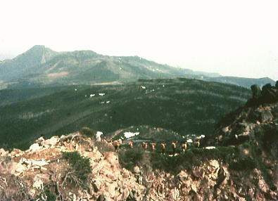 5月17日,快晴 5:45茅野:55=上槻ノ木6:25一7:05朝食:30一8:23小:35一9:25小:40一10:43昼食11:15 一12:30小:45一14:05オーレン小屋テ1. 陽炎の径 入山日.今日の登りはデレデレ長い。 暑い陽射しは陰を我々に与えず.陽炎が音を立てるよう濛々と立ち上がる。 古ススキに乗った風が.むかむかする風を呼び.馬鹿陽気に腹が立ち眩みそうに強い。 背後の霧ヶ峰の起伏が印象的に強く瞼を揺さぶらす。 快い眺めがあるがこの馬鹿陽気。動かずも汗の滴る陽射しになった。 樹林帯に径が綴られ.陽を隠すようなると流れる風は気持がよかった。 漸く現れた残雪に心は踊り.靴底に触れる雪の感触が足より体全体に伝わてくる。 5月18日.晴後雨. 男子4パーティ,以後同一行動. オーレン小屋Ts5:40一6:50小7:00一7:50天狗岳8:18一9:16中山峠:30一10:44高見石11:30 一12:13麦草峠:35一15:20双子池テ2. 根石岳への山稜.白砂と残雪![]() 天狗岳より南八.本峰を望む.赤岳と阿弥陀岳 南本峰を背に夏沢峠より蓼科,鳴岩川沿いに少し下るとオーレン小屋にでる。 春の暖かい大地に体を寄せ2年.3年の指導する設営を見守る。 ![]() 5月19日.小雨後曇 双子池Ts7:30一8:50大河原ヒュッテ9:20一10:30将軍平11:30 一14:10親湯.プール平16:03=16:32茅野17:05=20:35新宿. 下山 |