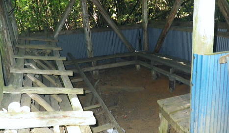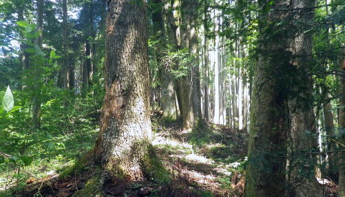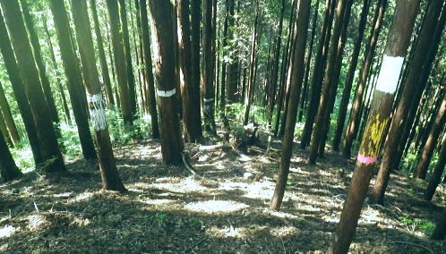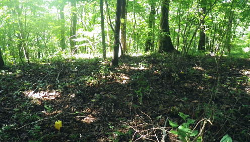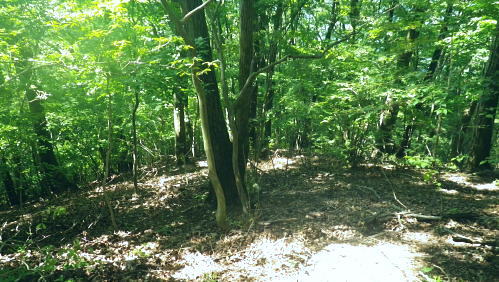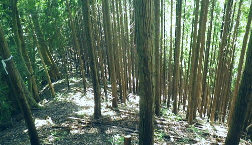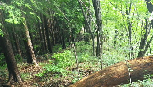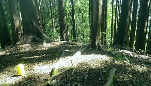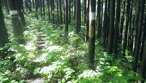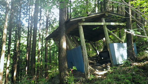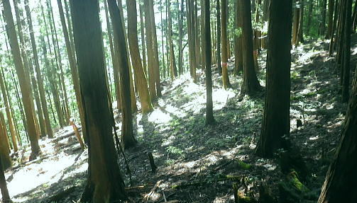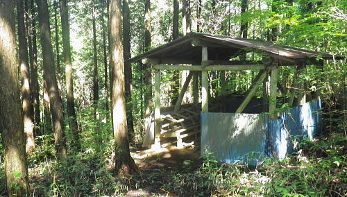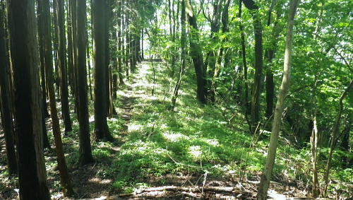 | 浅間尾根を横断・・北秋川本宿から南秋川へと北東尾根を詰め.出野沢左岸尾根を下り檜原街道へ。柏木野バス停では夏バテで疲労困憊の大休止。. 路線バスで1つ笹平停留所間を利用し.後は回復を待ち.再び嫁取り坂から旧醍醐峠越で醍醐道へ下る。 瀬戸川から払沢ノ滝にでて.払沢ノ峰北東尾根を詰める 淺間尾根.出野沢左岸尾根から檜原街道にでて柏木野バス停・・地形図の赤点2つと待合小屋 小坂志林道から市道山嫁取坂を詰め旧醍醐峠越え.のニニク沢 ニニク沢・醍醐林道.醍醐道から陣馬街道.関場 松生山南東尾根 払沢ノ頭からの下り.9:48出野沢左岸尾根下降 9:46払沢ノ峰―10:05バケモン山分岐―10:09出野沢左岸尾根分岐―10:25第一小屋―11:14檜原街道―11:32柏木野bs12:12. 小坂志沢出合付近の笹平に至る雑木の松生山南東尾根を下り.途中から出野沢左岸尾根に入る。道中.生い茂る樹林に下草も多く眺望はない。 以前は冬木に覆われ,払沢ノ峰から肩にでるまでに払沢ノ峰東尾根南面とバケモン山に至る尾根が望めたが.今回は樹葉に覆われ全く眺められず。 それに変わり森を思わす柔らかい感触の台地に登山道が綴られていた。 バケモン山を擁する780m圏東尾根分岐を振り返る.10:05払沢ノ峰の南側肩の小さな840m圏コブの分岐にでる。昨年訪れた時は尾根筋の中央に黄色いプラ抗と脇に「財団法人. 南郷共益会所有地」の看板あり.外れた立木の幹には白いテープに「←バケモン山」と書かれた小さな目印あった。 それに導かれて.緩やかに北側に湾曲する東尾根に入っている。それが黄色プラ杭だけが残され.他は全て取り除かれていた。 恐らく下部の私有地が広がり.採石場としての稼働が始まるためだろう。既に昨年は伐採跡の根株も取り除かれ.丸坊主にされていた。 又バケモン山」の手前の山懐にも広い坑道が延び.伐採された広場のような形を造っていた。そこはまだ根株は残されていた。 尾根とは思えぬ大らかな台地を通過.10:08バケモン山の分岐を通過し林相の境を下る。 綴る植林は東面から延びる植林の突き上げる林相の境をに変わると出野沢の源流分岐にでた。 420m圏・・出野沢左岸尾根の取付分岐.10:09左岸尾根の取付きの小平地にはL字に曲がる尾根の右肩でに.ニサイズのL字道標柱が立つ。 この裏側が出野沢左岸尾根の突き上げている。.この1つ先に下った所のコブが内蔵ノ助山783m.になるのだろう。 ブログ「奥多摩山歩き」氏の16年8月の記録には頂からはっきりした踏み跡があると書かれていた。 取付きの西尾根を下っていた模様. 幾つもの確りしたマーキングがあったが途中で激崖に合い.下れず戻っている。ここも作業道だろう。 なるほど分かり易い踏み跡が西尾根に付いている。気をつけねば私も間違えたかも。 感謝し磁石に合わせ.ここから見える道標の裏側を右に寄り気味に南西へ進路を取り.一時平坦な斜面を下る。 小平地の分岐点尾根から綴られる黄色いプラ杭がここにも南寄りにあった。このプラ杭を確認し南西の斜面を下る。取付きには踏み跡はない。 方向を南西に見極めて.丁寧に探れば再びプラ杭を見付ける。ただ夏場は下草が伸び放題だ。慌てなけてば見付られる。 この地点さえ丁寧に進めば.先は間違える尾根ではなかった。作業道が確り踏み固められ付けられている。 又左岸尾根最初の黄色いプラは.この後左岸の尾根筋に点々と付けられていた。 一線を引く斜面を下降.10:14コブから第一歩.同じような急斜面の傾斜が暫く続く我慢のしどころ。ストックでバランスを取りながら下っている。 最初は注意を怠らず下り.尾根の起き上がりが現れれば占めたもの。ポイントが随所に現れ.踏み跡は作業道から山道へと変わり. 末端の街道まで続く。松生山南東尾根の登山道より.踏み跡は優しく楽な作業道かも知れない。 営林署のマーキングが集まる一点を通過.10:17間伐された間の広い場所にでる。ここには色とりどりのマーキングが幹に付けられている。 全部営林署関係のペンキ類だと考えられ.個人的なテープ類のマーキングは落とされていた。後半では多くなるが。 この先で右後方から作業道を合わせている。更に合わせ.振り返り覗き込むと崩壊しかけの造林小屋を見付けている。 820m圏の第一造林小屋跡.10:26地図と赤点 赤プラ杭がある所から右後方に入ると直ぐ造林小屋跡にでる。地形図「五日市」には小屋跡は記されていない。 ただ電子国土Webの地形図をアップするとはっきりした小屋が2ケ所に記され.確りした「赤い点」が記されていた。 これを見付け今回は訪れてみようと出向く機会を得ていた。今年6月には伏木峠東側の台地に.この印を見付け. 旧伏木峠・松ノ木峠と綴り.伏木峠の造林小屋を訪れているた。 ただ逆の場合もある。昨年3月にドバノ岩山クドレ沢右岸尾根を訪れた折はその前に鋸山林道神戸線を遡っている。 電子国土Webには鳥居記号が記され,探すも分からなかった。あれは何だったのだろうか? 赤井沢神社にしては離れ過ぎていた。 諦めトバノ岩山クレド沢右岸尾根の取付き