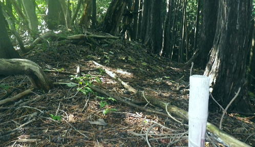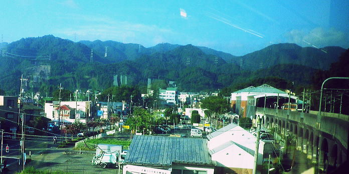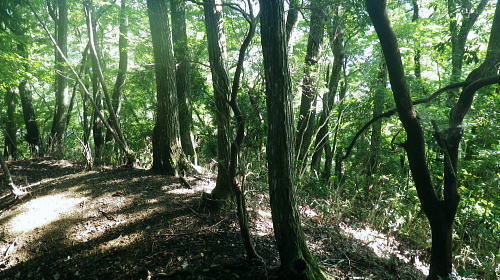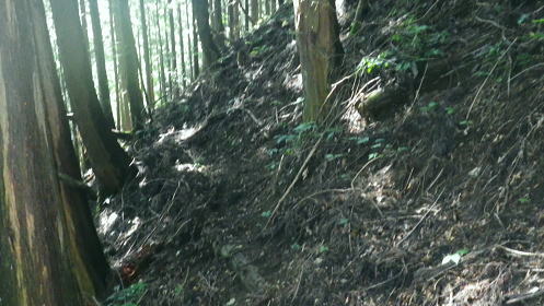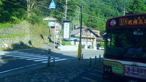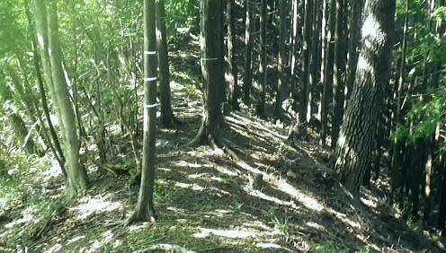 | 檜原村.八王子市の境界に挟まれた北秋川流域から浅間尾根を横断し.南秋川から更に醍醐川流域へ・・浅間尾根Top 本宿.払沢ノ峰北東尾根を詰め松生山南東尾根に乗り.出野沢左岸尾根を下り.北秋川の舗装街道に下り.猛暑の照り返しを受けダウン寸前に。 柏木野バス停の待合室で.昼食を摂り大休止。バスで笹平まで繋ぎ.水分の補給を頂き.再び市道山嫁取り坂から旧醍醐峠へと登り返し.醍醐から関場へ。 2019年09月06日.松村 瀬戸川から払沢ノ滝にでて.払沢ノ峰北東尾根を詰める・・小屋跡の残骸 淺間尾根.出野沢左岸尾根から檜原街道にでて柏木野バス停. 小坂志林道から市道山嫁取坂から旧醍醐峠越え.のニニク沢 ニニク沢・醍醐林道.醍醐道から陣馬街道.関場 過って醍醐から峰見通りの2つの南支尾根を周回してから2年3ケ月振りに.浅間尾根の払沢ノ峰から猛暑の檜原街道を抜けて醍醐へ。 嫁入坂から旧醍醐峠を越えている。一昨年は春先の残雪を踏みながら藤倉から浅間尾根を縦走し.初めて浅間尾根からの展望を楽しみつつ. 松生山の東方.北面の支尾根を幾つか偵察していた。そしてバケモン山に回り込んでいる。 バケモン山は採石のため.見るも無残な裸の姿に削り取られていた。それは山名の如く「バケモン」の異名を持つ山になる。 その主尾根たる松生山南東尾根を今回は横切り.払沢ノ峰北東尾根からは出野沢左岸尾根の作業道を綴り.造林小屋跡を2ケ所訪れている。 第一の目的は旧醍醐峠越えの旧道。檜原街道に降りてから猛暑の戸倉山域に移り.古道を綴りながら旧峠にでて醍醐の里に下ることにした。 入山尾根と今熊山 終点手前の左前方の車窓から遠望.美山町の芳村砕石所今熊山の裏側が入山峠になり.右肩奥がが刈寄山. 車窓からの1枚の写真 jr五日市線の車窓から終点.武蔵五日市駅手前で左前方を望むと中央に入山尾根645m点コブが望められる。 その背下に山腹を削り取る巨大な採石場が眺められた。3年前の晩秋に盆堀林道から石津窪山大萱尾根をピストンし入山尾根を綴り. 背の芳村砕石所と刻まれた採石場に入り.美山町に下りている。 入山尾根の中央の尖がった頂から砕石場に直接下り.超大型のトラックを停め.採石場の入口を聞いてもいた。 驚いたのは私より運転手.車体が大き過ぎ人は殆ど見えないとのこと。小尾根の踏み跡には「通行止」の看板もない。恐らく古くなくなったのだろう。 採石場にでて,直ぐ迎い車に拾われ.美山バス停まで送って頂いた。 写真の城山と今熊山の間に採石場が見え.その真下の紅白鉄塔の裏側の谷間に新多摩変電所がある。右手の鉄塔群が建つ背が今熊山505m。 山越の鉄塔群は東電の新多摩変電所からは新所沢線・新秩父線が奥多摩地区を抜け.新飯能変電所と新秩父開閉所と結ばれている。 旧戸倉村の山並・・今熊山・市道山・臼杵山 右景・・jr武蔵五日市駅手前にて.6:46駅前まで来ると芳村砕石所は山と重なり見えず 左方の見えぬ尾根に城山330.7mの小コブがあり.右に今熊山505mが聳える。その間の奥に入山尾根が横たわり. 端角のコブに>芳村砕石所がある。今熊山右肩には刈寄山. 奥の頂稜が市道山・臼杵山. 手前の三角峰はグミ尾根のグミ御前. 手前の尾根末端には小コブがもう一つの城山434.1mが構えている。 鉄塔群が山を下りた辺りが檜原街道の十里木付近になる。右奥に馬頭刈尾根末端の長尾尾根に泉沢尾根が重なり望まれた。 右端に金比羅尾根末端.十里木から秋川沿いに更に上流へ.右俣の北秋川に入れば目指す払沢ノ滝に至る。 払沢ノ滝入口バス停で.高度計を280mに合わせる.7:149月6日(金).快晴の猛暑・・日ノ出6:05,上弦月 jr御徒町.¥618. 4:34=4:50東京:58=5:55立川6:02=6:47武蔵五日市,:49=7:11払沢ノ滝入口bs 払沢ノ峰北東尾根・・払沢ノ滝入口bs280m―7:34払沢ノ滝―8:31(514m圏コブ)―9:46払沢ノ峰. 払沢ノ滝入口バス停に降りたハイカーは私独り.天高く秋空に恵まれる。 バス停前の広場を挟んだ通りの向い側に「檜原とうふ・ちとせ屋」があり.その左脇奥から瀬戸沢の橋手前で左手に折れれば払沢ノ滝散策路に入る。 直進すれば林道浅間線の起点にでて.時坂沢沿いに至る。橋を渡るとPがあり.時坂古道へと続く道だった。 時坂峠から瀬戸沢の馬宿・浅間嶺・数馬を経て丹波へ抜ける道筋は甲斐と武蔵を結ぶ戦国時代の主要道の1つであり.その「押さえ」として 時坂に檜原城が築かれていた。この城の裏口を意味する「背戸」が転じて「瀬戸」になり.その沢を瀬戸沢と呼ばれるようなった。 林道を分け瀬戸沢沿いとの間の山道を繋げば旧キャンプ地にでる。ワクギ沢と瀬戸沢の出合に没するのがワクギ沢右岸尾根。 昨年2月にバケモン山を登っている。払沢ノ峰の北側に聳える840m圏の小コブから北に延びる支尾根で.この尾根の上部を偵察していた。 今回はその東隣りの北東に延びる払沢ノ峰北東尾根を詰めることにした。決めた理由は尾根末端の取付きに払沢ノ滝があり.見分してから直接詰めている。 左岸の遊歩道から瀬戸川を渡る水道坑.7:27瀬戸川右岸の散策路は細かなチップで