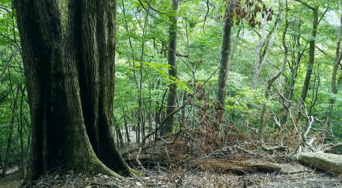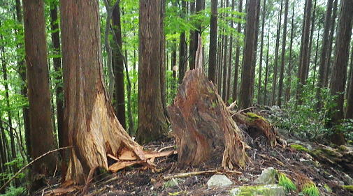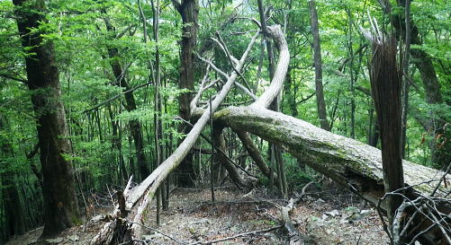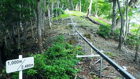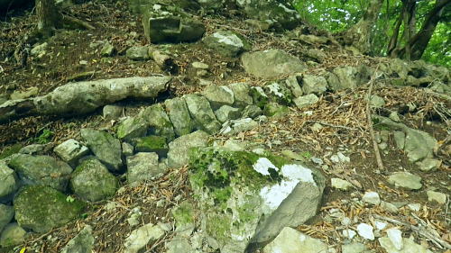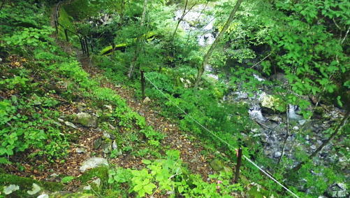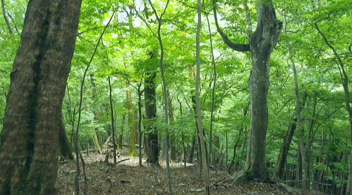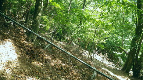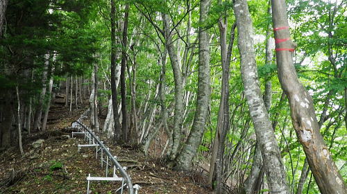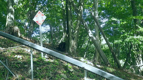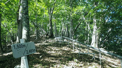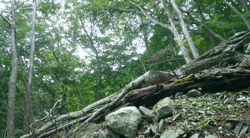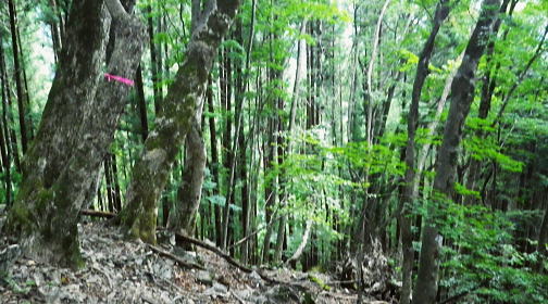 | 長沢背稜の大栗ノ頭ででて.板形ノ頭板形尾根を下り尾根二又へ. 板形ノ頭からモノレール軌道に入り.板形尾根1160m圏の南支尾根から小川谷林道の賀郎橋・・日原鍾乳洞に戻る 小川谷林道の滝上谷から大栗尾根 尾根半ばの大岩壁から大栗ノ頭と展望のナド岩 板形尾根から1160m圏南尾根を経て林道の賀郎橋にでる 板形ノ頭1553m.13:52登山道に2つの異なる林班界標柱が並ぶ 林班界標「18/16」の標柱に「板形ノ頭1553m」(はんぎょう)と書かれ.脊稜の直ぐ先の裏を見る林班界標は「16/15」がある。 林班界図のT字の境. 高度計は1554mを指していた。修正せず.天候と高度のバランスが取れていることを示している。 豆に訂正すればよいのだが中々難しく.何時も節目のポイントにでると訂正している。今回はほれぼれするほど高度計はよい数字を示していた。 板形尾根は大栗尾根から東側に滝上谷を隔て.板形ノ頭から南西に延びる尾根.下端は2つの支尾根を分け. 共に小川谷林道が横断し小川谷に没している。板形尾根.南南西方の支尾根は賀郎谷出合に下りている。 又板形尾根.西南西方の支尾根は軌道が小川谷林道まで続き.小川谷に没している。 前回は滝上谷を間違えクラミ窪中間尾根から板形尾根の「18/17」標柱から登る形を取っていた。今回は又もや板形尾根を下ることになった。 以前2度板形尾根を下り横篶尾根を周遊した折はカロー谷の中腹道に入り.十字路からカロー谷を横切り小川谷水平歩道から東日原へ降りていた。 板形尾根 軌道の終点.13:55小川谷林道へ・・13:52板形ノ頭―14:35板形尾根分岐―15:18賀郎橋―15:50日原鍾乳洞bs. 今回は倉沢谷への下山を変更したことで.急に時間的余裕が現れ.気持ち何処かのんびりとしていた。 今回は経路まで戻らず.板形ノ頭から南側を覗き.直ぐモノレール軌道の終点にでる。 そこへ直進し.できるだけ軌道沿い下ることにした。朝方歩んでいた小川谷林道に軌道の起点がある。 「1500m/2460m」のポイントを過ぎ.14:13 林班界標「17/16」はカロー滝への作業道の分岐.14:143年前に仙元谷.グミの滝を経て三ッドッケ.シャクナン尾根から板形尾根に入り.この経路からカロー大滝を経て東日原へと. 小川谷左岸水平道を下っている。荒れた山腹を綴る作業道だが素敵なルートで.2度ほど訪れている。ただ崩壊地は今だ改修されず。 板形尾根の分岐 作業道のモノレールの下部.横断地点1110m圏.14:29モノレール軌道が狭い急斜面を走る所で作業道の巻き道に入り.モノレール軌道と離れて小尾根の分岐地点を見逃している。 この間の軌道は西側に大きく曲がりだす辺りが支尾根に分かれる分岐だった。 少しポイントの標柱下でこの作業道は軌道を横切っている。軌道の軸に黄色いテープがあり.そのまま綴って支尾根に乗っている。 ただ正確な場所を目での確認のため.1160m圏まで軌道沿いに戻っている。 「1000/2460」のポイント1150mの登り返し.14:33確認のため本来の取付きまで軌道沿いに登り返している。まず薄い踏み跡が横切っていた。 ここからでも下れる模様。軌軸に黄色いテープあり.更に「1000/2460」の標柱を見て.10mほど登れば本来の取付きに出る。 右の幹に3本の赤いのテープが巻かれていた。 下から見上げ賀郎.橋への分岐1160mに戻り.14:35賀郎橋への最短分岐 「1000/2460」のポイントを確認.更に少し登ると1160m圏の経路分岐にでる。左に折れる写真で見える先の軌道の軸に. 2ケ所.黄色いテープ3本の印がある。右の立木には3本の赤いテープ.これが分岐のポイント。 直進する板形尾根(西南西方)の軌道支尾根を分け.立木の右脇から板形尾根(南南西方)の支尾根に取付く。 板形尾根の支尾根 尾根二俣・・南南西方への分岐の取付き.14:35この尾根は小川谷下流側に向かう板形尾根の末端と云うこともある。最短で日原に下りられる。 分岐からもう一つ板形尾根(西南西方)は小川谷林道までモノレール軌道が綴られ.終点には立派な基地があった。 又960m圏で軌道を跨る作業道は下段歩道で.私が下る支尾根の下端で合わさり,直ぐ賀郎橋に降りている。 作業道はほぼ幅広い尾根を綴っている.14:15一本の南南西方の支尾根 ほぼ自然林に覆われた支尾根の取付きで.左前方の小木にもマーキングあり.踏み跡は薄くなくなる所もあるが尾根筋を下ればよい。 一度植林帯に入ると確りした作業道に変わっている。よく判らなかったがカロー谷中腹道の十字路から繋がる径路とも合わさっているようだ。 下部は路肩に石積みがある所もあった。最後はカロー谷の右岸から小川谷の左岸にでると真下に賀郎橋が見下ろされた。道標はないが赤テープがあり. 林床は以外と荒れているが何処でも歩ける.14:49 以外と人の手が加わっている尾根.14:52 多くの森を持つ.14:53 植林帯に突き当たり.右の主尾根へ.15:57植林帯に入ると確りした経路に変わり.迷うことはなくなった。ただ左肩下に見下ろされる筈の小屋跡の土台を気にしていたが見過ごしている。 林相の境から再び植林帯へ.14:58 誰の仕業だろう?大きさから熊?15:00 林道真近な作業道で.15:11あってもよ