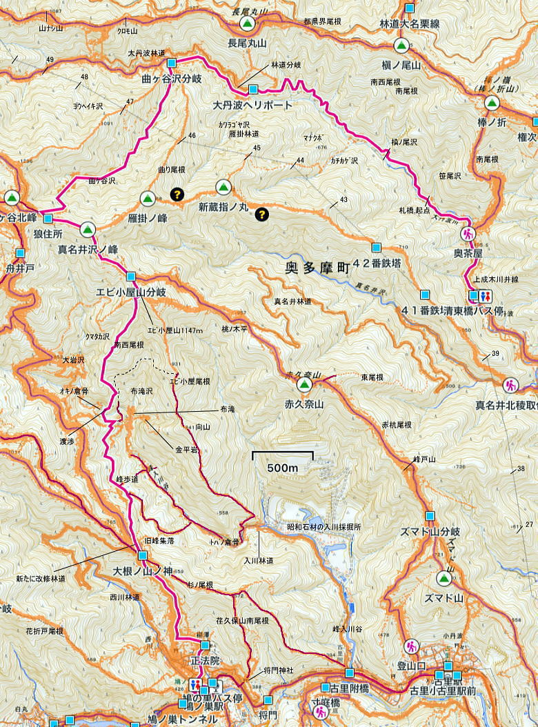 四度目の入川谷・・最終章の山・エビ小屋山 jr鳩ノ巣から峰歩道, 入川谷を横切り.エビ小屋山南南西尾根―赤杭尾根から曲ケ谷沢を経て上成木川井線へ・・林道・都道 2019.10.10地図の黒破線は 2018年07月. 杉ノ尾根末端から旧峰集落を経て入川谷―布滝沢径路からエビ小屋山南尾根,そして向ウ山を経て末端に至る・・林道起点から周回 奥多摩西北部Top 小川谷の源流・・「三又」を囲む山々 小川谷林道終点から三又―上滝尾根を詰め長沢脊稜に乗り,水松山中尾根を下降,孫惣谷林道綴る, 2019年10月06日,松村 今回も小川谷林道から小川谷の源流部を選び好奇心に満ちた待望の秘境「三又」に入る。「三又」を訪とは如何なる所だろうか? 西丹沢の西,「馬印」とは地形も異なるが初めて訪れた時と待望も憧れが同様に「三又」に入り.一歩踏み込まれた憧れの地が現実のものになる。 丹沢では関東大震災で山域全体が大きな被害を受け,昨年林道が開通したばかり.日原谷源流流域でもは東北大震災の影響をもろ受け,被害は増大し 共に長い歳月を費やし.今でも改修工事が行われている。 小川谷林道に入るのは前回の山行では2度目. クラミ窪の無名橋から更に大栗尾根取付まで延び.今回は新たに林道終点から自己責任で「三又」まで歩む。 林道のゲートには「林道から三又経由,酉谷山避難小屋の登山道は崩壊のため通行できません」と注意文が張られていた。 林道からザレ落ちた崩壊地を巻き終えると深山幽谷に分け入り.幾つもの沢が纏わり付く渓谷美に富み,煌く川面を覗き込むようなる。梢を抜ける風もよい。 その後は上滝尾根を詰め長沢脊稜に乗り.水松山中尾根(南東尾根)を下りって日原採石所から孫惣谷林道に入る。 今回は久し振り,山中に入ると同じほど林道歩きに時間を費やすことになた。少々長くなるがまずは焦らず出向くことにした。 |