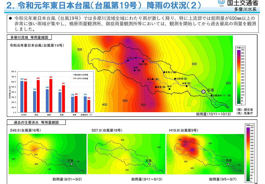 | 同期会山行.旅行Top 43年度同期会旅行・・箱根湯本と三島スカイウォーク 台風19号の影響で芦ノ湖への道路は全滅で断念.急遽三島のスカイウォークへ. 2019年10月15〜16日 入川谷山行の2日後.南鳥島付近で発生した台風19号は猛烈な勢いで.12日9時には伊豆諸島に上陸.その後関東甲信地方から福島を横断している。 13都県に特別警報レベル5が発令され.河川の決壊は59.堤防は90ケ所に上り.77人が死亡.10人が不明と悲惨な大災害を起こしている。 後に「令和元年東日本台風」と命名された。 神奈川県箱根町では降り始めからの降水量が72時間で1.001.5oを超え.10月12日の日降水量も全国歴代1位になる942.5oを観測。 和田の決断で決行することになり.新宿駅に集合したものの当日は小田急線は復旧が間に合わず.JRに乗り換え湯本にでている。 出向いた湯本の宿「南風荘」前を流れる早川は轟音を巻き散らし濁流化していた。 箱根登山鉄道は湯本駅〜強羅駅間・宮ノ下〜小涌谷駅間で土砂流入.蛇骨橋梁流出し.今年の復旧は無理のようだ。 バスにケーブル.芦ノ湖の海賊船も不通.その中出向く。 「南風荘」にて.2019.19:0010月15日.曇後雨 jr新宿駅南口集合=小田原=湯本「南風荘」 16日.霧雨 湯本=小田原=熱海=三島⇔路線バス=三島スカイウォーク.=熱海.東京ライン=上野. 22:25和田の提案で三島へ大きく迂回.三島スカイウォークへ 南ゲートにて.17.12:25日本一の400m歩行者専用吊橋. 高さ70m.・・2018,07オープン 三島駅から北東へ国道1号線に入り.山中城跡への手前に三島スカイウォークがある。先は箱根越え. 吊橋中央より南面を望む西伊豆の山並と駿河湾. 右前方が三島.更に右肩遠方にガスで隠された富嶽が聳える 北ゲートの展望デッキで.12:00箱根は火山レベルが1に戻されるも悲惨な観光地になる。三島で昼食を摂り.藤沢駅で解散した。 jr東日本は中央東線の高尾〜大月間の不通. 全面運転再開の見込みは10月末になると発表。 高尾〜相模湖間と四方津〜梁川間では土砂流入や線路脇のコンクリート壁の崩落が発生し.高尾〜大月間で列車の運転件は18日に仮復旧する見通し。 下り線のみを使った単線運転に.山梨県と東京は他にも中央自動車道や国道20号の通行止めで寸断されている。 この周辺の大規模災害は「平成25年豪雪」以来。 18日現在.堤防の崩壊は71河川.土砂災害は482件.84人が死亡.行方不明9人に増えている。・・小河内645o・御岳633o, 今月訪れた奥多摩日原街道は台風の影響で崩落,通行止めで日原地区では断水・停電で孤立状態が続いている。 歩行者用の仮橋が設けられ,復旧は数ケ月に。先週訪れた大丹波林道は各支線が通行止め。 他に都道.陣馬街道・あきる野市養沢・吉野街道.御岳橋〜軍畑大橋間と御岳小橋は流失・成木常福院〜常盤橋間,箱根町も影響は続く。 2020年5月7日・・令和元年東日本台風(台風19号)の甚大な被害を受け日原では44所帯73人が孤立したが日原街道(平石橋・白妙橋間)の 仮設道路が完成。片側互通行,乗合バスは小型で通行止解除。完全復旧まで約3年の月日を予定している。 2020年7月23日・・箱根登山鉄道(箱根湯本・強羅間)の運休が続いていたが23日始発より通常ダイヤで運転が再開される。 静岡県伊豆半島に台風19号が上陸した。955hpa.最大風速40m/s. その後福島県.関東.甲信越.新潟.東北地方に広野的に大雨となり. 莫大な被害をもたらした。昭和54年台風20号以来.40年振り.死者100人を超える。 東京近郊の日帰り山行の山域でも大雨による河川の崩落が激しく.無残な姿を各地に残している。 ![]() ![]() |