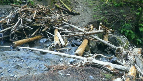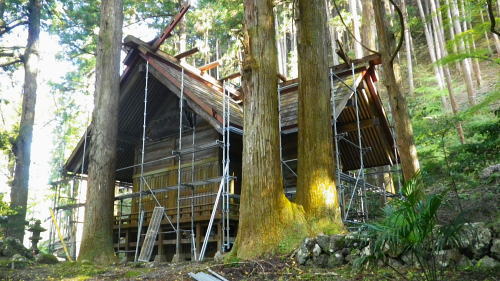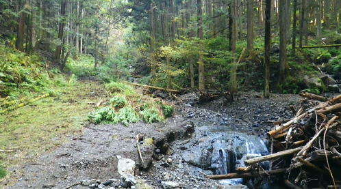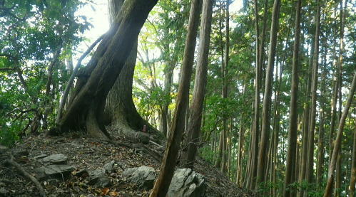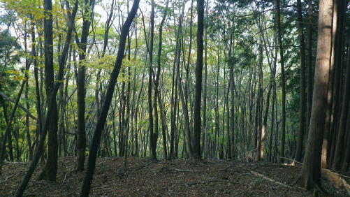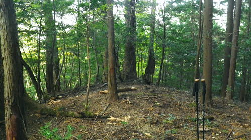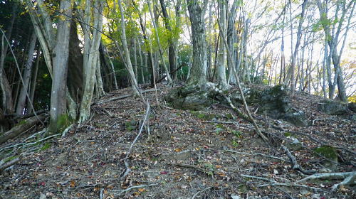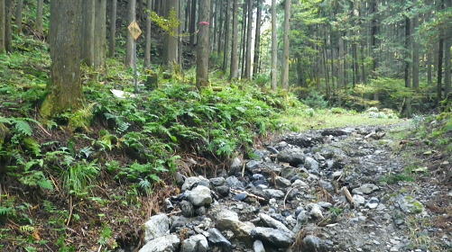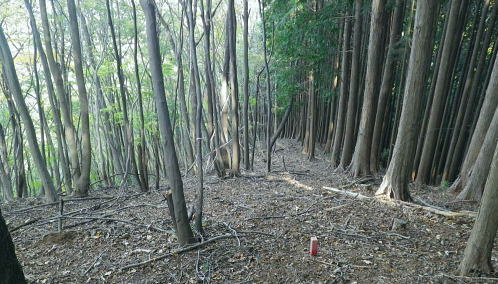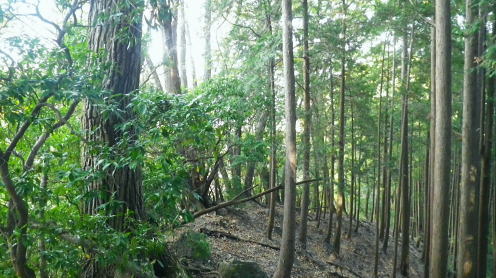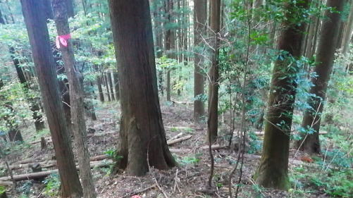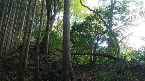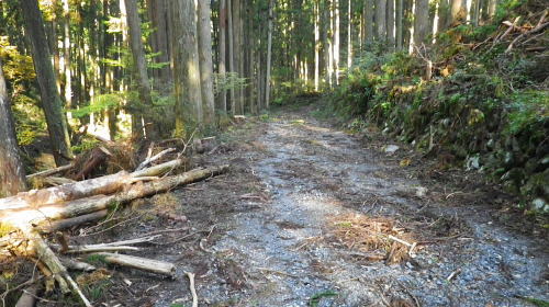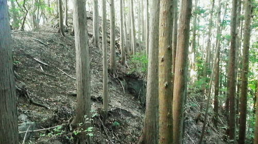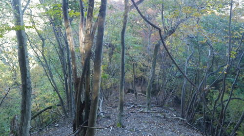 | ・・奥武蔵山地南部Top 長久保山の境界線に立ち.長久保山北東尾根(長久保山北東尾根)を下り.和泉入中間尾根の末端から名栗川.上名栗諏訪神社 2019年の19号台風の被害をもろに受けた和泉入右俣中流は崩壊し林道の道形を失っている。「峰」バス停から東武飯能駅へ 上日向bsから逆川ノ丸南西尾根を詰め常磐尾根の伐採地 逆川ノ丸東尾根から磐林道を綴り都県界尾根.柳川丸から大クラ尾根ノ頭 境界尾根の660m圏コブ 和泉入中間尾根に乗り境界尾根の突端を見上げる.13:32「尾根名」の勘違い 長久保山690mから西側に少し戻り.立木の山名標と青梅の「二等基準点.1がある裏側の689mのコブらしき所が 和泉入の取付きになる。又山腹を右に少しトラバースすると尾根荷突き当たる。これが長久保山北東尾根。 尾根から見上げる頂は660m圏コブの肩.大らかな円びを帯びた小さなコブが見上げられた。勘違いから和泉入中間尾根と思い続けていた。 肩から下った方が何も考えず楽に下れると思われたが長久保山に係る何かが.昔からの山道として繋がりがあるのだろうか? 旧道を辿ったため理解に苦しむが.鞍部の直ぐ北側脇下に古い「←諏訪神社」が道標あり.見て不思議に思えた。 トラバースを終えた支尾根にでて.長久保山北東尾根を見下ろす。撮り方が悪いのか.下る尾根はどれらい斜面だが穏やかに見えるのも不思議. 604m圏.12:37右手から植林帯が尾根筋まで押し上げられ.林相の境がそのまま痩せ尾根を形づくっている。 細かい起伏を起こす急斜面の尾根筋は大樹・露岩が塞ぎ.その都度右手を巻いている。 又右手の一段低い所を綴る長い巻き道は時に歩み難く.何方ともいえぬ厄介な尾根の踏み跡になっていた。 痩せた尾根上は巨樹・露岩と歩けぬ障害物が続く.12:40幾つのの小さなコブを越えて 尾根筋の左手は和泉入へと急角度で抉り落ちている.12:42 細かな巻道と樹林帯.12:44 上部の痩せ尾根と林相の境を見上げる.12:51 下部の小コブ.12:51539m小コブ 猛列なアケビの群生からは尾根幅は広がり傾斜は緩む.12:58509m点コブ 尾根の分岐.13:04509m点コブの直ぐ先496m圏肩で.尾根筋は大きく左右に2つに分かれている。 左手は自然林の中へ.右の尾根筋は植林帯との林相の境を創る。 右尾根へ.13:05右手の下り口には赤いプラ境界杭があり.その尾根を選び下っている。 448m圏 再び尾根が2つに分かれる.13:09今度は左前方の尾根へ。右尾根は直角に曲がる尾根. 今度は左前方の尾根へ.13:10右尾根はここでも直角に折れていた。 408m圏.更に尾根を分け右方へ.13:12倒木あり左尾根は直角に折れ.右前方の林相の境から雑木林へ。立木の根元が苔むしる所を通過。 灌木で先の見えぬ斜面に入る.13:20 13:24道形が分からず傾斜も一辺倒の斜面に突進した。不安が募りだすも直進すればよかった。 前方に赤テープを見付けている。この尾根で初めてのテープ.不安を抱いたのはここだけだった。それも一瞬の不安。 幹に結ばれ頼れる赤テープ.13:27 尾根末端に林道和泉入線が見下ろされた.13:31346m圏.尾根の下端にでると赤テープと赤ペグ7があり.更になだらかになり306m圏にペグ3が立つ。 先が側壁になった所では林道の見える左前方に降りている。 林道和泉入線 和泉入右俣の林道.13:39尾根下端から左手へ降りた林道は涸沢のような荒れた沢底の状況の所にでている。最初は荒れすぎる林道に意味が分からず. 上流側へ少し登ってみる。すると黄色い標識があり.その先で林道の支線分岐を合わせている。 林道の分岐点から上流を覗く.13:43和泉入右俣の上流側には地形図「原市場」に記された破線路が延びている。支線が分かれ.右手の和泉入に橋が架かっていた模様。 ただ橋は見当たらなかった。倒木が山積みされた残骸が脇に山積された形で無残な光景を見せている。 和泉入の左岸に渡る支線.13:43濁流跡 林道和泉入線の支線の合流点. 左岸に渡る分岐地点には唖然とする荒れ果てた残骸が築いていた。 下山してから地元の人の話では台風19号の豪雨は凄かったらしい。その時の豪雨の勢いがこの谷間に洪水をもたらしていた。 今は流心だけは改修されていた。 和泉入は濁流となり.橋に溢れ絡んだ倒木類が堰になり.積み重なれ倒木類は川の流心を一段高い右岸の林道に変えている。 それ故路面は根こそぎ抉られ.人の高さほど穴が掘られた所があれば.林道幅一杯に大きく抉られた所も創られていた。 山を下りて涸沢のよう思えた林道はそのせいだろう。下流側の石造りの永久橋だけが残され.そこで流心が元の沢に戻されていた。 無残に崩壊した林道穴の深さは人の背丈ほど.入ると台地は見えぬほど深い。 ここは林道幅一杯に抉られ.沢でなく林道.和泉入中間尾根の末端 二俣末端に残された石橋は無事.13:58この荒れた状況は右岸に渡る石橋まで続いている。林道を崩落させた豪雨の水流はここで右手の和泉入に戻っている。 当時は石橋をも越えただろうが林道の道形はここから残されていた。下流の枝沢を右後方から合わさている。 無名の左俣は境界尾根の760m圏コブと641m点コブとの鞍