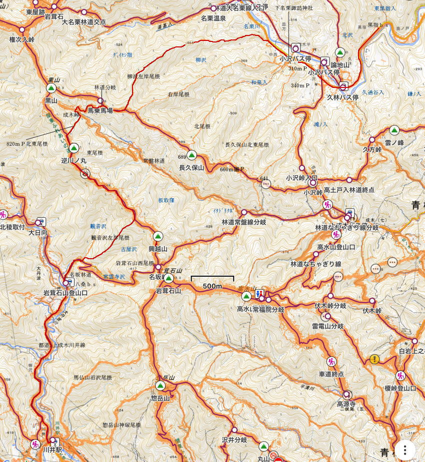 境界尾根長久保山に立ち.長久保山北東尾根から和泉入に下る。 尾根の末端は和泉入林道は19年の19号台風の被害をもろに受け.和泉入右俣付近は崩壊,道形を失う・・下名栗諏訪神社 大丹波川の上日向から都県界尾根を横断・逆川ノ丸・長久保山 2019.11.16―2019年11月. 逆川ノ丸南西尾根から逆川ノ丸東尾根―常磐林道で境界尾根に乗り.長久保山北東尾根から和泉入へ下降 ―2024年03月. jr川井から名坂林道.観音沢左岸尾根を経て逆川ノ丸―常陸林道で境界尾根を越え.柳沢左岸尾根.名栗川の町道と県道に黒指bs ―2024年04月. jr川井駅―岩茸石西尾根―名坂峠―成木川二俣―常盤林道―長久保山南尾根―北尾根―和泉入―諏訪神社―名栗川右岸道.黒指bs 大丹波川から関東ふれあいの道・林道常磐線へと繋ぎ.都県界尾根を越え柳沢左岸尾根を下り.奥武蔵名栗川へ ![]() 2024年03月. jr川井から名坂林道.観音沢左岸尾根を経て逆川ノ丸―常陸林道で境界尾根を越え.柳沢左岸尾根.名栗川の町道と県道に黒指bs |