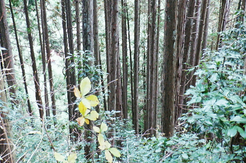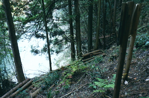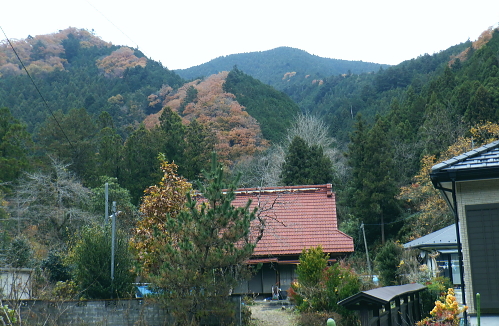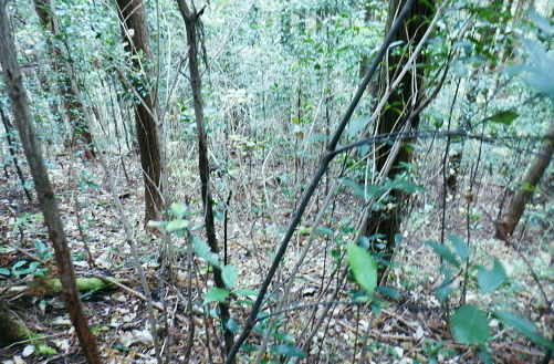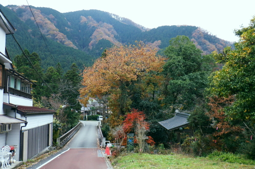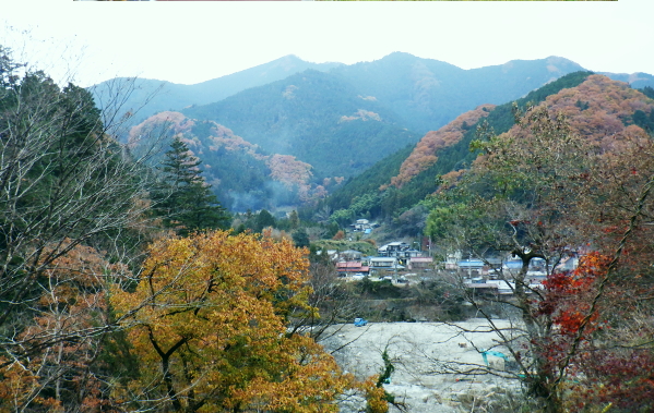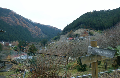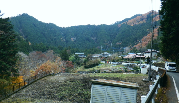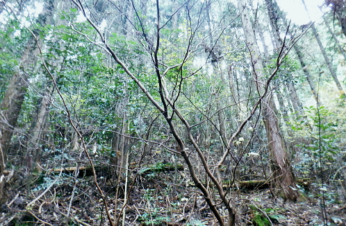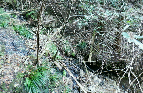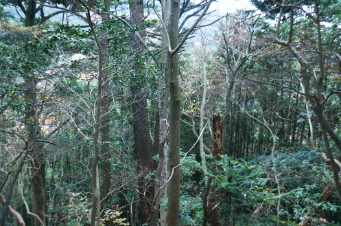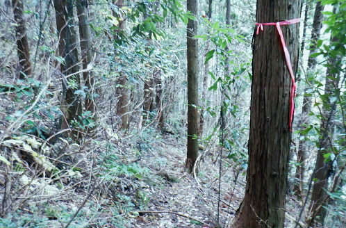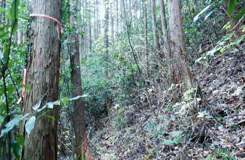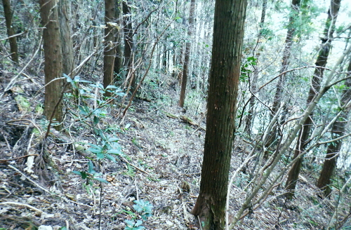 | 馬頭刈山泉沢尾根を下降 末端峰390m・アタゴ山から東方の踏み跡のない劇藪を漕ぎ.U字口に降り.外枠の左岸歩道から青木平にでる。 ・・裾の里道は「花の里」乙津橋を渡り上野原あきる野線.乙津.荷田子.追分から十里木へ 西沢入林道から916m点の鶴脚山北東尾根を詰め馬頭刈山 馬頭刈山泉沢尾根を下り.和田向の分岐を分け愛宕山 末端峰から激藪の植林帯を下り.U字峡を右に回り込み青木平・・十里木へ アタゴ山の北東方の短い緩斜面 植林から灌木林を縫い下降.13:17馬頭刈尾根を越え.馬頭刈山泉沢尾根の末端峰のアタゴ山を目指し登山道・作業道を綴り末端に至る。 不思議な計画と小さな小さな頂へ。煙草も吸えぬ深い枯葉に埋まる頂に立ち.乙津青木平へ降りる。 アタゴ山13:15―13:42左岸歩道―14:02青木平・・14:52十里木バス停. 巻道 390m圏末端峰・アタゴ山からのピストンして下る右脇に確りした巻道を見付けている。アタゴ山の東面の山腹を回り込む踏み跡らしきものがあった。 あるようなないようなズタズタのトラバースの道に少し入り戻っている。地質調査用のモノレールの痕跡だったのかも知れない。 又尾根筋の地図の破線路へ続く巻道は山腹道が深い落葉に埋り.踏み込むのに悠著させられていた。 往路を戻り.鞍部手前の高みで.右手に巻き道を見付け下りている。 巻道の切れた樹間から東面を見る.13:43藪壁に突入 北鞍部から巻道の山腹道にでた所で樹間の隙間から谷間・秋川の逆U字形の中に.大きな建物か? 赤い屋根が覗き見下ろされた。 川畔のようだ。先程通過した破線路の分岐点まで戻って下るより.巻道を横切り直接藪に覆われた山腹に落ちる劇勾配を 下った方が楽に思われた。突入するが如く藪壁の落ち行く先を見詰めている。 劇坂の藪斜面に突入.13:38高木の植林帯に掛かる急斜面の林床は枝打ちが乏しく.却って下枝の藪絡みの方が整然としていた。 とはいうものの藪は藪で想像以上に蜜つる。又ここは一面識の斜面でなく細かな起伏に窪みがあり.密で潜る藪を避けて. 下り易い処をストックと立木の枝を支えに這い下ればよかった。ここは歩みだす第一歩から踏み跡はない。見た目の斜面と地図を睨み下降した。 傾斜は増すばかりで.前方は見定められず.ただ土壌の程よい硬さに安心感が備えられていた。 後は末端底に作業道があるが如何かだろう? あっても側壁はなさそうだが鹿柵なり,落下柵があるか。ないとは限らない。 広い扇状の一線を引く劇斜面の尾根。万一の鹿柵のことを考え.縦溝縁に沿うよう確認しながら下っている。 上流側の方が厳しいようだ.13:42煩い藪が続くも倒木に.枝落ち,ガレ場がないだけ助かっている。後は強引に下るにみ。周りは何処も藪絡みの満る植林帯だった。 以外と手の支えとストックを使うバランスがよく.薄い藪絡みを渡り潜り抜けている。劇斜面に膝を深く曲げては方向を変え潜り抜けていた。 高度差200mほど.藪漕ぎが始まればアッと云う間に下り終えている。 歩道から下ってきた斜面を振り返るここからもし登るとしたら分かりづらいルートになろう。出るまでは藪又藪の絡む中にいた。そして出てから分かる稜線になろう。 荒れたU字峡の左岸歩道にぶつかり.下流方面を見る 薄い左岸の作業道.13:42運よく川畔まで至らずして.古い左岸歩道に出くわした。立木に赤テープの垂れるのを見て.浅い踏み跡を見付けている。 探れは作業道らしき道が綴られていた。左に折れ足元の踏み跡を探りながら綴る。 川畔と小沢.13:44小沢を越えている。抉れた土壁.その間々の窪溝を渡る, ロープのある荒廃した小沢.13:47更に深く抉り落ち,探ると上部は大岩が塞ぎ.ロープが張られ.右に大きく回り込む。 左岸歩道らしくなる.13:49 地形図の破線路下部の取付き地点.13:54踏み跡らしくなると一部分だけが伐採された小広い空地斜面にでる。地図の破線路か.415m圏から下る作業道の下降地点にでた。 作業道は林班界標板の裏から下りている。最初に予定していた破線路からの最終下山地点にでる。 左岸歩道を振り返ると樹林の切れ目から,狭い空間にU字状の秋川々畔が見下ろされていた。 秋川の川畔を覗き込む.13:53 初めて鉄橋を渡る.13:52 集落の西端に入る.14:00川畔を北側に回り込み.畑跡のような広場を過ぎると木橋で小沢を渡っている。 渡ると2軒の廃屋跡を抜けている。先は石積みが続き.陽谷院・熊野神社の参道らしき道を歩む。 初めての民家・集落に入る.14:02民家が現れると山道とも分かれ.里道に変わり乙津地区・青木平に到着 右景・・青木平の集落から.14:02左手の林相の境の尾根は泉沢尾根450m圏コブの南東尾根,支尾根の分岐点からは確りした作業道が綴られていた。 青木沢に没している。中央奥は鶴脚山の南尾根・茅ー尾根だろう。 末端峰のアタゴ山390mと450m圏コブ 左景・・振り返る泉沢尾根.14:10尾根東面の裾に秋川がU字状に流れ.将来はこの尾根下を隧道が横切ることになる。 U字の秋川左岸歩道を綴り.少し高みにあるのが青木平の集落を抜け.泉沢尾根下端の東面山腹を振り返
