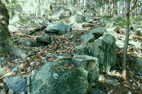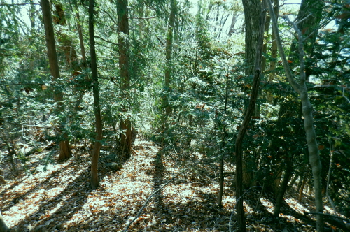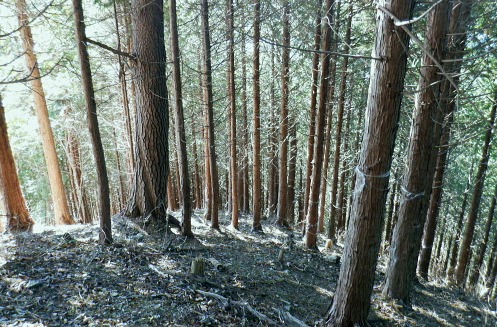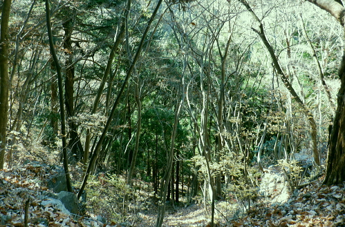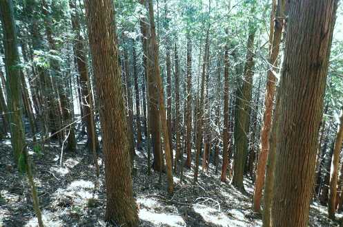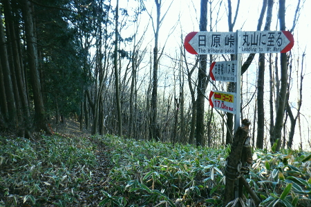| 笹尾根の大らかに延びる丸山を横断 丸山東肩にでて.丸山南尾根のほぼ植林に覆われた作業道を下り.穏やかな尾根に変わった下端の葦原の中尾から西原古道を横切る 森沢橋から森沢700m圏出合から右岸尾根を詰め丸山 植林に覆われた丸山南尾根を下り西原古道.中尾・・植林から灌木滞 西原古道を西進し.県道18号線の六藤 アッチ沢右岸尾根から笹尾根を越え.南沢中間尾根から南沢林道 丸山南西尾根 丸山東肩の分岐.10:10南西尾根を下れば十二天を経て笠松峠にでる。.尾根末端は寺久保山(ふんどし山)に至り鶴川に没している。 この峠から西原古道を東側に繋げば蝶塚原から小棡集落にでて.丸山南尾根の末端.中尾を経て十文字峠にでる。 丸山南尾根を下降・・丸山10:17―11:15り西原古道・中尾. 丸山南尾根を下降 南尾根は笹尾根の頂稜.丸山の東肩の分岐.少し東側から南方へ延びる尾根. 猿投沢と長野川を隔て.末端は鶴川に没している。 短い劇斜面を下ると植林に殆どが覆われる大らかな尾根に変わり.中半から尾根筋だけが植林された雰囲気を持つ尾根になる。 確りした作業道が付けられていた。尾根下端の極端な平坦地でに変わり.水平に横切る西原古道にでている。立木には「中尾」とあった。 笹尾根を分ける丸山東肩より南尾根の取付きを振り返る.10:13頂稜から東肩にある大木の赤テープが分岐の印 左前方に南尾根が起き上がっている.10:21丸山南尾根 「境界見出し標10」地点.10:24直ぐ手前にも同じ「境界見出し標12」があり通過した。 1000m付近の分岐は左へ急下降.10:27この付近は尾根が左に回り込む所で立木の幹には透明テープが巻かれ.鹿害を防いでいる。左の尾根筋に入り直ぐ.靴紐が緩み小休止。 ここ檜との林相の境からは笹尾根からの北風が塞がれ.思いのほか暖かい。霞む展望が左手に切り開かれている。 小棡南尾根 右奥は土俵山南尾根.10:41左手に猿投沢を隔て連なるのは小棡南尾根。尾根を綴り850m点から西側の枝尾根に入れば西原古道の十文字峠にでられた。 峠から更に真っすぐ尾根を下れば下端に里山の日武連山575mが聳える登山口がある。 南南西方の枝尾根に乗れば棡原(ゆずり)・大垣外(がいと)へ。丸山南尾根はここからは急下降している。 931m圏.尾根筋のみ細く植林が続く.10:51尾根筋の中央は植林線の帯が暫く続き.直立する檜林の連なる尾根に入る。両側は自然林の林相.その境になった尾根筋が以外と続いていた。 落葉が深く埋まると.その下は小さな石混じりに.10:59 雑木帯へ.11:03 746m圏.真新しい2本の赤テープが垂れさがりる灌木帯へ.11:05 11:07696m点を通過し670m圏辺りで再び植林帯に入り.尾根は2分する。尾根筋を右に回り込み小棡へ。 南尾根で一番まとまった露岩帯.11:15落葉は吹き飛ばされている.1 南尾根の下部に野原を見る.11:23急下降の尾根筋は下端で突然.平坦な台地が現れた。植林帯は一線を引き.抜けると想像できぬ広々した原っぱにでる。 立木に「ここは中尾(なごう)」とあり.夏にはワラビの葉で埋め尽くされるらしい。又「ウォークラリーコース・しぜんの里」の道標が立ち. 横切るのは西原古道で早速西方へ.六藤へと山腹道に入る。 権現尾根.東 524m圏の南尾根の下端に降りた原っぱ.11:25左端手前は日武連山575m.茂る植林の初戸川を隔てる対岸は室所649m越しの二本杉908.8m。 はぼ水平の稜線は二本杉から右へは.ニックラ山.寺ノ入山.雨降山へと更に玄房乗越(和見分岐)へ. 二本杉の左奥はコヤシロ山.実成山(みなしやま).尾続山(おずくやま)へと続く。 原っぱの正面に開かれた眺望は権現尾根.雨降山(黒茂山)1177mで手前に玄房尾根が落ちる。 雨降山にある電波塔は霞み望められなかった。右枠外に権現山が聳える。 下り終えた丸山南尾根末端の原っぱ 右奥は小棡峠南尾根急に山麓の切り開かれた長閑な台地を踏む。原っぱ.中尾には西原古道が横切り.奥先に綴れば猿投沢右俣の木橋を渡り. 小棡峠南尾根の十文字峠にでる。十文字峠は南西尾根と反対側は.南尾根伝いに登り返せば里山の日武連山575mに立つ。 南東へと峠越えは威王院から沢度(さわたり)地区へ。西原古道の起点でもある。 私は中西から反対側の背側へ続く古道を選び小棡集落に入る。 丸山南西尾根の919m点南東支尾根 右の立木端が丸山南尾根・・ここから西原古道を西へ綴る丸山南西尾根のツメは先程通過した丸山東肩の葦原の分岐にでる。この後は西原古道を綴り.猿投沢左俣に渡って. 南東支尾根の小鞍部を乗り越えている。そこで.この尾根の下端を越えている。 森沢橋から森沢700m圏出合から右岸尾根を詰め丸山 植林に覆われた丸山南尾根を下り西原古道.中尾・・植林から灌木滞 西原古道の集落をを西進し.県道18号線の六藤 アッチ沢右岸尾根から笹尾根を越え.南沢中間尾根から南沢林道 |