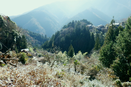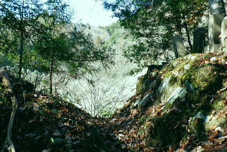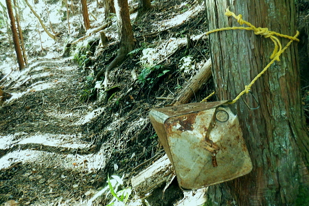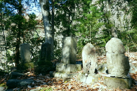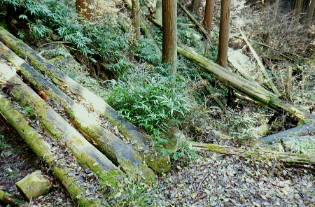 | 西原古道・・初戸川左岸の里道.中尾〜六藤の集落を結ぶ古道 西原古道を西進し.中尾から山道・里道を綴り.小棡.藤尾.六藤へと集落を縫い.県道18号線.六藤から再び笹尾根に戻る 森沢橋から森沢700m圏出合から右岸尾根を詰め丸山 丸山南の植林尾根から末端へ下り西原古道.中尾 西原古道を西進・・中尾・小棡(こゆずり)・藤尾・六藤(むそうじ) ・・県道18号線 アッチ沢右岸尾根から笹尾根を越え.南沢中間尾根から南沢林道 西原古道 甲武国境尾根の北東山稜.上平峠.笛吹峠.小棡峠と初戸川.鶴川との間には小中群.寺久保山.日武連と 集落を絡めた里山低山が並び.里山は棡原地区では「連」を用い.西原地区では「群」を用いている。 いずれも山を意味する古代百済語で.その間を縫うよう綴るのが西原古道。北側の国境尾根には苦することなく頂を踏める野道 (地形図の破線路)が綴られている。この野道を含め西原古道と呼ばれているようだ。松浦本. 猿投沢右俣の丸太橋.11:29西原古道・・中尾11:15―13:07六藤(県道.アッチ沢出合) 西原古道 左俣の木橋を渡って直ぐ目に付いたのが一斗缶.11:31熊除けの道具だろう。ストックで一発叩く 大岩を抱く曲り根.11:33小尾根を乗越す ![]() 丸山の919m点尾根から派生する南東枝尾根にある小さな鞍部.11:35 鞍部の山側の高みには幾つもの石碑や石仏が並び.古道の名残を伝える道祖神に祀られている。越えれば小棡の集落へ. 小棡の集落 小尾根越えをして下れば小棡の集落.11:36小鞍部を越し集落に入る手前に尾根を綴る登山道との分岐がある。右前方に登れば919m点から派生する南東の枝尾根に乗る。 古道は左下を選んでいた。小棡地区の東端の高みにある民家. 右手の人家の玄関前を通らして頂いた。 人家が軒を並べる玄関前分岐から左下の古道へ進み.軒下が並ぶ民家の玄関前を通らして頂いた。抜けた所で丁度.軽トラが庭先の道路を塞いだ。 家屋の修理がこれから始まるらしい。通行に邪魔したと思ったのか.十分通れるのに謝る主人。こちらこそ済みませんと謝っている。 小棡の570m圏肩 左景.玄関前から谷間を見下ろす小棡の山上集落.11:38猿投沢下流々域. 出合を横切るのが初戸手前の鶴川.日寄橋付近になる。背は権現尾根. 崖縁の左前方から小棡の集落全容が見下ろされた。 右上は「十二点」・「帳塚原」のある尾根から下りてきた570m圏肩と最南に位置する小棡の集落。 丸山南西尾根 少しズレた右景下・・小棡の里道へ.11:41背は919m点尾根の南東支尾根から直ぐ回り込む南枝尾根で.上部は登山道が延びている。尾根下部は坂本に下る山道。 庭先の簡易道から車道に降りて.右上にカーブするU字の右.里道を歩む。中央の赤い屋根は慈昌庵というお寺で. 鶴川.日寄橋へ降りる左下の車道脇に参道があり.ここから見下ろされた。 左の里道を下ると上の写真の谷間の猿投沢沿いに下り.日寄神社を経て初戸川(はとかわ)沿いの県道.日寄橋バス停にでる。 私は簡易舗装から車道にでて.右上に幾らか登っている。左へカーブする車道の先は行き止まりで。直ぐ左上の山道と繋がり古道に入る。 尾根上の馬頭観音.11:52細い山道にらしくなり.2つの小さな墓地を過ぎ.919m点南東支尾根のツメにでる南枝尾根を巻きながら尾根に乗る。 南方へ降りる踏み跡の分岐にでた。道標の「↑藤尾,↓日寄バス停・丸山→」とあり.日寄橋バス停(坂本)へ。 尾根伝いに下る方面は「通行止」と示されていた。 右に極端に折れ尾根伝いに乗り.更に右に折り返すすと大きな馬頭観音と「天保12年」と彫られた石板があった。 ここから左前方に入る小道は間違う作業道で.右に大きく回り込ねば確りした古道にでて歩む。 丸山南西尾根 明るく開けた帳塚原641m←高度計643m.12:02登り切ると思いもよらぬ壮大なスケールのススキの原にでた。風もなく明るい日溜まりにの平坦地.帳塚原にでる。 明治時代に入る以前は古い書類や帳面をここで燃やしたという。地名はこの由来か? 「帳塚原」看板の右脇の立木の下に 壊れた石祠が祀られていた。真向いに見上げられるのが丸山南西尾根で.左下へ尾根沿いに下れば目指す笹松峠にでた。 小棡峠南尾根と丸山南尾根 帳塚原の右手の展望右手に望まれる手前の谷間は猿投沢左俣. 中央に延びるのが私が下って来た丸山南尾根。下端の谷間に西原古道が横切っている。 笹尾根の丸山への分岐を振り返る.12:11緩やかに北西へ尾根を越え山腹をトラバースする所で登山道の分岐にでる。道標と「大日」と刻まれた丸石がある。 「大日」とは山岳信仰と深い関りがあり.笛吹峠にも「大日」の石仏がある。 左に折れる登山道は十二天・大日石碑を経て南西尾根を詰めれば丸山へ。私は背側の藤尾に向かい. 行きよいよく南面の斜面を巻きながら高度を上げ.笠松峠にでている。ここは手積みの石が残されてをり喘ぎ登っている。 笠松峠 昔は大きな笠のような松の木があったらしい.12:21丸山南西尾根にある笠松峠. 振り返り見上げるが笠松峠. 尾根を更に右下へ下れば木段から下端にある寺久保山 (ふんどし山)に立つ
