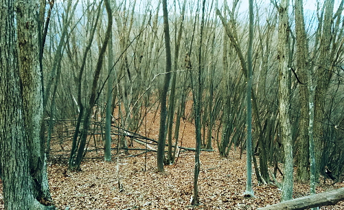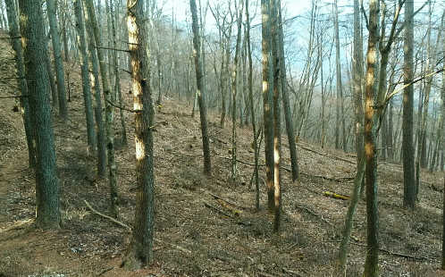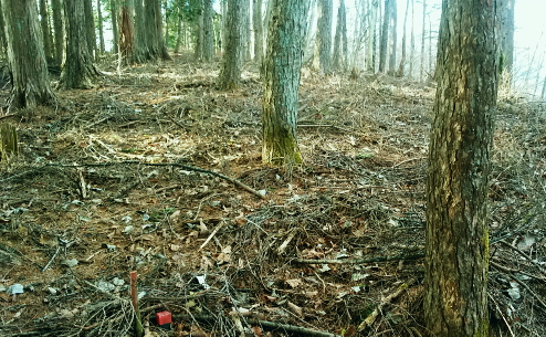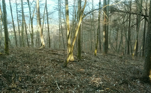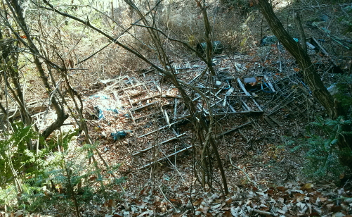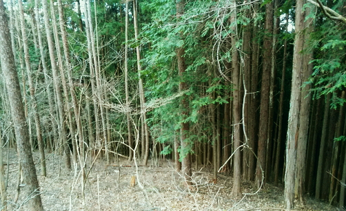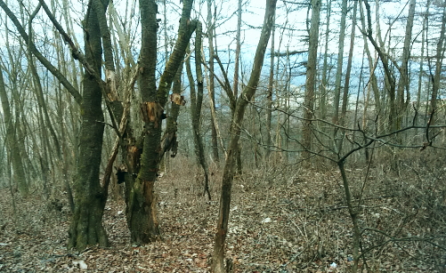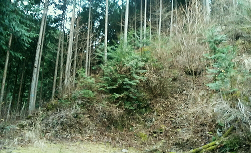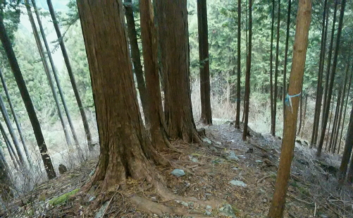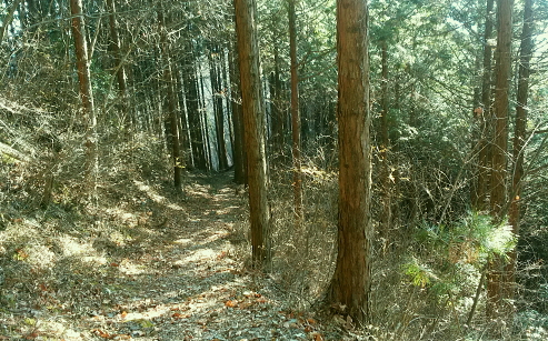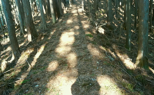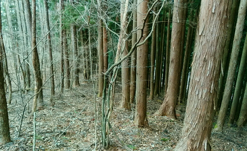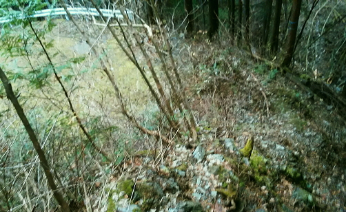 | 西原古道から再び笹尾根の1150m圏コブを越え.南沢中間尾根から再び檜原街道の南沢に戻る 六藤からアッチ沢右岸尾根末端に残る旧部落跡を抜け.笹尾根1150m圏コブ―南沢中間尾根は日没との競争し.「数馬の湯」山道から檜原街道.にでる。 森沢橋から森沢700m圏出合から右岸尾根を詰め丸山 丸山南の植林尾根を末端に下り.西原古道の葦原.中尾にでる 西原古道の集落を西進し.県道18号線の六藤 アッチ沢右岸尾根から笹尾根を越え.南沢中間尾根から数馬の湯・・廃部落と農道南沢線 アッチ沢右岸尾根 藤尾・・アッチ沢橋手前の里道より見上げる.13:05初戸川流域 アッチ沢橋で右岸に渡り.アッチ沢右岸尾根の末端へと初戸川沿いの里道を県号線.上野原丹波山線に出ることにした。 県道を右折する初戸川の上流側は数馬峠に繋がる上平.和田へと峠上の.標高点618mまで集落が続く。下って偏盃を過ぎると 西原峠への西原の東端.阿寺沢入口バス停にでる。そして再び鶴川沿いの県道を遡る。下城.郷原.原.一宮神社から八田へと。 左折する下りは藤尾から寺久保山(ふんどし山)に西側縁を回り込み初戸(はど)にでる。初戸川と鶴川の出合でもあり. 腰掛林道の起点。中群丘陵を挟んだ南側にを流れるのは鶴川の本流で腰掛林道が綴られ.北側の初戸川には県道が綴られている。 更に玄房尾根から雨降山へ登る登山道.北尾根がある。 右岸沿いに残る旧集落 集落からアッチ沢右岸尾根を見上げる.13:07軽食:15車道沿いにアッチ橋を渡ったアッチ沢右岸道側は県道にでる前の旧集落で.背の右岸尾根に重なる左奥に廃集落が残されていた。 笹尾根への支尾根取付き 初戸川沿いの県道18号線を見下ろしてから道路を登り返す。中央の赤い屋根の民家の手前の細道が右岸(上平)尾根の取付。 そこを見定めてから軽い昼食を摂った。カツサンドにオレンジ・ドライマンゴ.紅茶のポットは初めて開けている。 日没が4時23分と早く.それまでに笹尾根を乗り越し檜原村側の南地区に下りらなければ.ここで入山を諦めるしかなかった。 遅くとも日没前に南沢林道へ降りなければならなかった。2度目の登り返しは規則正しく休みを取り.老齢にムチを打ち進むしかない。 右岸尾根に乗ると下端に廃部落の痕跡が幾つも残されていた。又この尾根筋の中程には登山道が綴られている。 それをフルに利用することにした。下山は山陰になり.風当りも強いだろう。初めてのルート.時間に余裕がなければ暗くなり. 見定めるものが分かららなくなる。そして下るのが困難に。まずは南沢中間尾根の取付きを目指した。 アッチ沢右岸尾根 搾りかけの椿を見て一枚写真を撮る.13:21アッチ沢右岸尾根と南沢中間尾根・・六藤13:15―15:19笹尾根1150m圏コブ―16:30「数馬ノ湯」. 山上の廃部落 取付きの石階段からコンクリートの小径を綴る。舗装されていると言葉はよいが.藪に覆われている。小道は濡れた苔が付き.滑ること滑こと。 溜まった疲労が更に足を重くしていた。細長い尾根の開かれた所に乗ると旧部落の跡と思われる数軒の廃屋跡が突然点々と姿を現した。 原形を留めることなく.崩れ落ちている廃屋。廃材があり.又あっちこっちに生活用品の痕跡が残され.様々たる日常品が散乱していた。 ここでは当時の生活していた人たちの姿が伺えられた。この細い尾根筋にある廃部落の痕跡を見て.更に土手下直ぐ. アッチ沢右岸沿いの山側一片に.現在新たに形成されている集落の軒を並べている姿を見ると何か不思議な深みのある感情が湧いていた。 この異質とも云うべき短い距離に段違いに並行してある状況は.尾根伝いの住民たち先祖が移住したかのようにも思われる。 廃屋後から山道に変わる.13:22これらの潰された敷地跡をたどり.更に高みへと笹尾根を目指す。そこそこ大きな建物があった家屋の残骸を通過. こ の先から山道に変わっている。4.5分歩むと615m付近に水道施設らしきタンク跡がある。 ここには左手から登ってきた山道と合わさり.更に先に進むと小平地に出くわし.横断しているかも? 道と交わってもいた。藪絡みだが先の山道は確り踏み固められていた。 807m圏.平坦な尾根に.13:57先の660m圏に石祠あるのは気が付かなかった。黙々と足元を見詰め,着実に高度を稼いで行く。 そして藪からも逃れ.この尾根伝いは傾斜も平均的に緩く.登るには気持ち助かっている。 力が落ちれば自分にハッパを掛けた。まだ体は動いている。傾斜が一度落ち.気持ちも落ち着くと. とんでもない奇麗な直線の山道が現れた。上平橋からの登山道と合流したようだ。道幅はも広がりがしていた。 764mで登山道の分岐にでる。「行き止り」は谷間へ?14:06尾根は下部とこの先で少し雑木になるが尾根筋は植林が全体的に覆っている。そこを高度計と睨めっこしながら一歩一歩着実に高みへ。 思う気持ちより歩調は遅いが着実に高度を稼いでいる。800m台を過ぎると900m台へと高度計のデジタルは増し続けた。 921m圏.尾根を左に巻き一本取り振り返る.14:25風を読んだコース 風を避け.尾根の風下に入り木洩