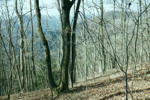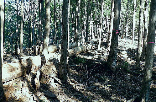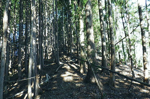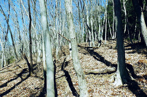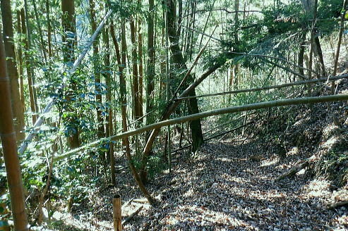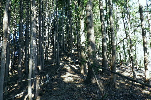| 甲武国境稜線の土俵岳を南北に横断・・奥多摩.奥秩父東部概念図.山行表 鶴川.久野本から猪丸を通り城山から土俵岳南尾根を経て笹尾根を越え.新たな林道から土俵岳北尾根を下り南秋川の事貫(ことずら)へ。 広く大伐採地を持つ北尾根の破線路を繋ぎ.北尾根の林道は下部がまだ造成中で.末端にある南秋川は橋が崩落し渡渉する。 檜原街道の人里(へんぼり).事貫に至る。 2020年01月06日.松村 城山から土俵岳南尾根・・久野本bsから猪丸地区 伐採地と破線・林道の土俵岳北尾根 再び東京近郊の山々を登り始めた頃.三頭山から笹尾根を縦走し土俵岳を通過.末端の高尾山と結んでいる。 昭和30年以前は「オサエ尾根」と呼ばれることもあり.戦国時代には武田氏と北条氏の領地境界線の場でもあり.「抑え」として地勢的に重要な尾根だった。 土俵岳の「土俵」とは「境目に立てられた道標」が転じたものと云われている。・・「バリエーションルートを楽しむ」松浦本. 甲武国境尾根の横断は「平成26年の豪雪」の折.城山から枝分かれする南高尾山稜に入り.草戸山東尾根から境界尾根の末端.大戸まで下りている。 この2つの山行以降は縦走と云うよりは尾根越しが多く.各支尾根を登り下りしていた。今回はその時以来で土俵岳を横断することになる。 今回は城山からの入山を選び.土俵岳の南北の支尾根を使い横断する形を取っている。又このところ成木周辺の大伐採地帯を歩むことが多く. 前回は西原古道に繋がれる南秋川沿いの伐採地を歩んでもいた。当時の南沢流域の伐採化から10年経ち.驚くばかりに大変貌をもたらす風景になった。 丸裸にされた山の斜面を見て驚かされ続けている。連鎖とは云わぬものの土俵岳北尾根に掛かわる大伐採地を見定めたく. 又遠方から前回の南沢周辺の伐採地をも見定められていた。又違った方向からも眺められた土俵岳も.感無量の展望風景になっていた。 昨年開設された上野原駅南口ターミナル jr上野原駅南口から北側の高台口にあった旧ターミナルを望む.8:17北口ターミナルは細道から駅前通りの県道51号線にでて.陸橋を渡り更に県道51号線に入ると上野原インター口にでている。 1月06日(月).快晴 jr御徒町6:22=6:26東京.中央特快.¥1160. 6:33=7:31高尾:43=8:00上野原バス.¥520. 8:32 =8:57久野本bs・・日の出6:52・中野付近. 以前のの山行では檜原街道から丸山を横断し.西原古道を歩み檜原街道に戻っている。 その南秋川下流の土俵岳を今回は南北に横断することにした。そして12年前に笹尾根を縦走した時の日記を改めて読み回想していた。 土俵岳北尾根の末端.及び林道からの南秋川に架かる橋は崩壊し通行不能とある。秋川は今でも橋が崩落し. 渡渉を強いられているようだった。その為だろう登山明細図「山梨東部の山」の破線路は「廃道」と付け加えられていた。 土俵岳南尾根 大ツイジ.栗坂峠より・・2023.03.02/11:313年後に熊倉林道から千ケ尾沢右岸尾根の815m点東北東尾根を詰め.笹尾根から栗坂ノ尾根を下り下伏集落に出た時の展望。 その折は熊倉山北尾根を目指したが藪絡みが強すぎ.河原からのルートを失い尾根を変更していた。 城山 久野本バス停.猪丸沢に架かる猪丸橋に下車.8:57猪丸橋8:57〜11:52土俵岳 土俵岳に登るのは前回の丸山山行と同様に笹尾根を縦走して以来.初めて訪れる。 鶴川の出合付近では近年ヤマベ釣り大会に何度か参加し訪れているものの.登山として初戸の手前からの入山は初めてだった。 上野原駅発飯尾止りの路線バスは一日2便. jr大月駅からは鶴峠を越える路線バスが運行されるようなった。だが上野原駅発の タイミングよいバスは季節バスだけのようだ。ハイカーらしき5名が乗車. 外は肌寒いものの冬空に恵まれ.車内は明るい陽射しが差し込んでいた。 路線バスが権現尾根の末端,尾続の集落を抜け用竹を過ぎた。運転手は「正面に生藤山が見える」とマイクで伝えている。 すると左方の鞍部が浅間峠だろう。又高みを走りだすと「バスの背に富嶽が望める」とマイクで説明した。 尾続山から続くコヤシロ山辺りで.雪白く煌き富士が頭を出している。 2人の単独行者が新大王橋バス停で降りている。東側の支尾根から土俵岳に登るようだ。 私は城山に繋がる左の支尾根末端に踏み跡を求め.鶴川を左岸に渡った次のバス停.久野本(くのもと)に降りている。 駅から25分ほどの距離.バスの去った目の前にはこん盛りした城山(じょうやま)が紺碧の空に浮き上がるよう見上げられた。 左前方は682m峰を擁する二本杉の北尾根・・雨降山と初戸に登山口がある玄房尾根 県道上野原丹波線より.9:00バス停から県道18号線が右の山陰に回り込むと大垣外(がいと)を過ぎ.西原古道の入口から沢渡にでている。破線路は三本杉へ延びているが 登山道との繋がりがギリギリ切れて分らず。三本木から二本杉.芦瀬コースの登山道を取るのが無難。手前の尾根は雑木のようで登山道はなかった。 この北尾根の1つ先の尾根が初戸で.県道は鶴川と分かれ.左岸支流の初戸川沿いへと作業道を延ばしてい