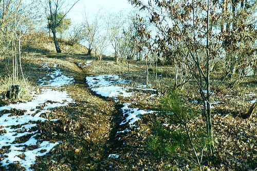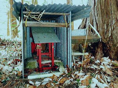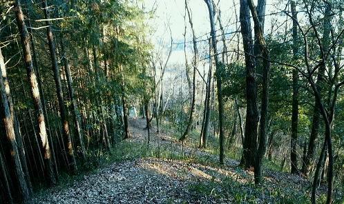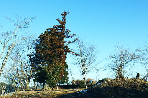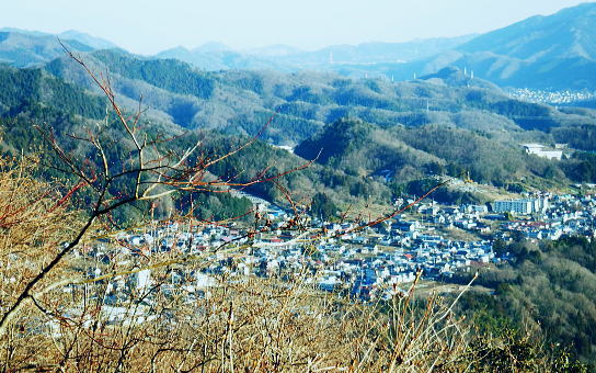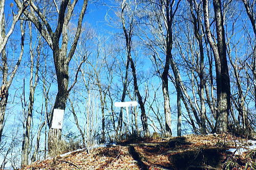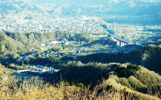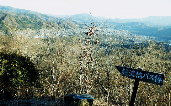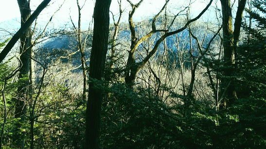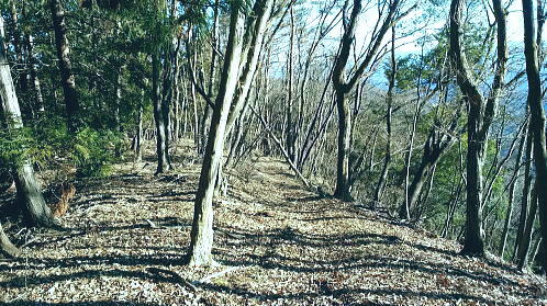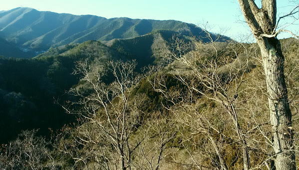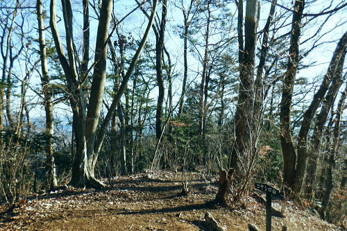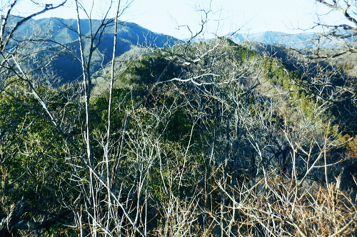 | 浅川峠から権現山稜.東方の山稜を綴り要害から鏡渡橋. 破線の交差する十文字峠から二本杉を南下し.鶴川左岸の小さなながら目立つ峰・要害山へ 二本杉から十文字峠(御林峠)を経て大倉大沢左岸尾根―コヤシロ山・風の神様・要害山を経て小倉から鶴川.鏡渡橋. 浅川峠から雪白き権現山稜.東方 十文字峠から要害山を越え鏡渡・・再びゴボウの実 大倉山芦垣尾根口 杉林の十文字峠(御林峠).14:25芦垣の集落に向い南下するのが芦垣尾根.その左手(大沢右岸)の小道に入る。 右正面は稲荷神社から芦垣を抜け.県道30号線にぶつかった所に芦垣下バス停がある。「芦垣入口」とも。 大倉大沢左岸尾根 雑木に変わった左岸の山腹道1610m圏.4:37十文字峠から道標に従い大倉大沢左岸尾根に移る。 左手の北側にU字に急カーブを描く狭い小道に入り.短いが荒れ気味の小道.大倉山から南東に延びる尾根に乗り移るための巻き道。 大沢源流の2つ枝沢を渡り南東尾根の山腹に入ると急に日当たりのよい広く確りした山道に変わっている。 自然林に変わり.見えるかどうかの先に墓村から今野を経て用竹に至る分岐道標が立つ。尾根に乗っている。 古いリスの火気注意の丸い標識があった。「八重山トレイルコース」が下る確りした山道だが.大枝の横木で通行止めを示していた。 恐らく尾続山・要害山への登山道ではないことを示すためだろう。右に折れコヤシロ山の山道を選ぶ。 小コブの登り.14:50分岐から右下に下ると歩き易い登山道に変わり.深い落葉を踏むと檜の中木林帯に入る。古い色褪せた赤プラに壊れた杭が現れた。 尾根筋は南東へ。赤テープは登山者用か? 小木林帯に変わり.ここにも「八重山トレイルコース」と古い木片に赤帽黒杭を見る。 ピンクのテープが点々と続き登り返すと造形の変わった老木が目に入る。直ぐ地図にない小コブを越えている。 尾根筋は南東から東へ。尾根伝いに610m圏コブに続き.小広い平頂が現れるとコヤシロ山にでる。右手の雑木側に展望が開かれた。 コヤシロ山 コヤシロ山602mの尾根の分岐.15:03コヤシロ山からはトッケ沢を取り囲む尾根で標高500~600m前後の幾つもの頂がまたがる尾根が続いている。 左(東)に分かれる尾根筋は実成山(みなし)・尾続山(おづく)と延び.鶴川の尾続に没し.て右に折れ南下すれば 「風の神様」から要害山に至る。 頂から瀬渕山と仲間川流域南東に大倉大沢を隔てる展望が開かれた。大沢越えの芦垣尾根の先に甲東三山のゴウド山・高指山から繋がる瀬渕山が それぞれの頭を現わしていた。その背に聳えるのが不老山。中央左寄りの白い線はオリンピックCC越えの談合坂SA。 その先の高みは中央本線沿いの網の上御前山になる。そこを大きく囲むのが倉岳山・高畑山・大桑山の道志の山並。 霞み富嶽は望めぬが談合坂サービルエリアが手前に見下ろされている。・・談合坂SAから逆の展望 コヤシロ山の小平地からはこれから2つの尾根を分けている。東尾根は実成山(みなしやま).尾続山へと綴り.尾続の集落へ降りている。 山頂の道標には「尾続バス停」とあった。私が下るのは要害山へと南尾根を選んでいた。 藪絡みから要害山 15:13コヤシロ山からは少し荒い山道.痩せ尾根の鞍部を越えている。広くなった尾根筋には太いモミの木などの雑木帯に。 2つの小祠 15:17小コブを越え鞍部手前にトタン板で囲まれ石祠があり.更に20mほど間隔を開け.もう1つの石祠がある。 2つの小祠は共に山道とは背で合わせ.登下の集落方向に向いていた。左の祠脇には更に古い石祠が立木に挟まれ残されていた。 風の神様 木祠は通称「風の神」.15:26展望台540mの頂は樹林の切り通しよく360度の展望あり.30cmほどの小さな木祠がる。 この先は頂を左へ直角に折れ.痩せ尾根続きの起伏を持ち.抉り落ちる谷間を尾根の両側に覗き見て.1つ大きな石を越えている。 ロープ等があり.危険はないが登山道としては一番のポイントとなる所だろう。 雨降山 左景・・15:27権現尾根から繋がる中央の尾根は大倉山からの芦垣尾根。十文字峠を経て榛名山601mを越え.下端の510m圏コブ. 丸山手前で芦垣に分ける山道が降りている。私は大倉山の直下.十文字峠から右手の大沢左岸尾根に移り.尾根伝いに下ってきた。 「風の神様」と右肩がコヤシロ山 左景・・490m圏コブ寄り.15:27間の谷間の上流に登下(とっけ)集落があり.トッケ沢左岸沿いに地形図では黒線で綴られ. 県道18号線の向風(むかぜ)下りている。左側は大倉大沢が南下し.芦垣地区にでる。 コヤシロ山南面 右景・・右奥が笹尾根の土俵山.15:35振り返るとコヤシロ山の左肩には権現尾根のニックラ山・二本杉が見上げられ.権現尾根沿いに下れば鶴川.用竹に至る。 二本杉の下が大倉大沢の源頭になる大倉山.その直ぐ下に十文字峠があった。 権現尾根に乗ってからは北側に笹尾根の土俵山を常に見つつ歩んできた。前回は土俵山南尾根を登りつつ. 背に雨降山を見詰めていた反対の風景。枝藪絡みからの眺めが殆どだったが常に望めた山であり.前回の回想を含め忍ぶべき山。 遠く