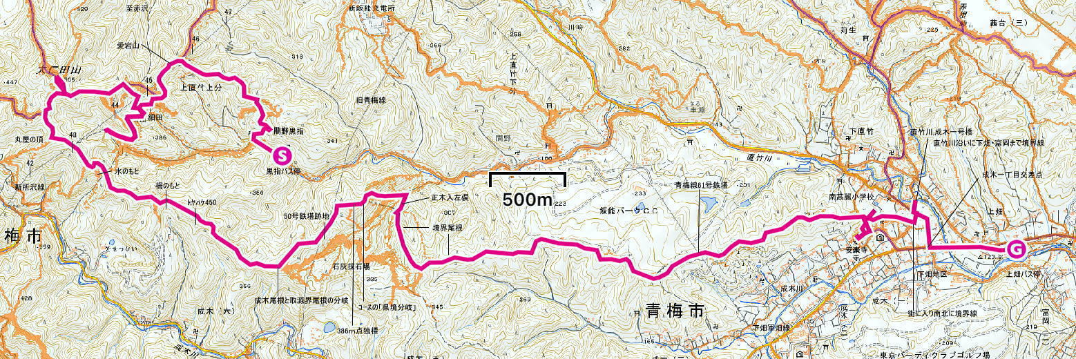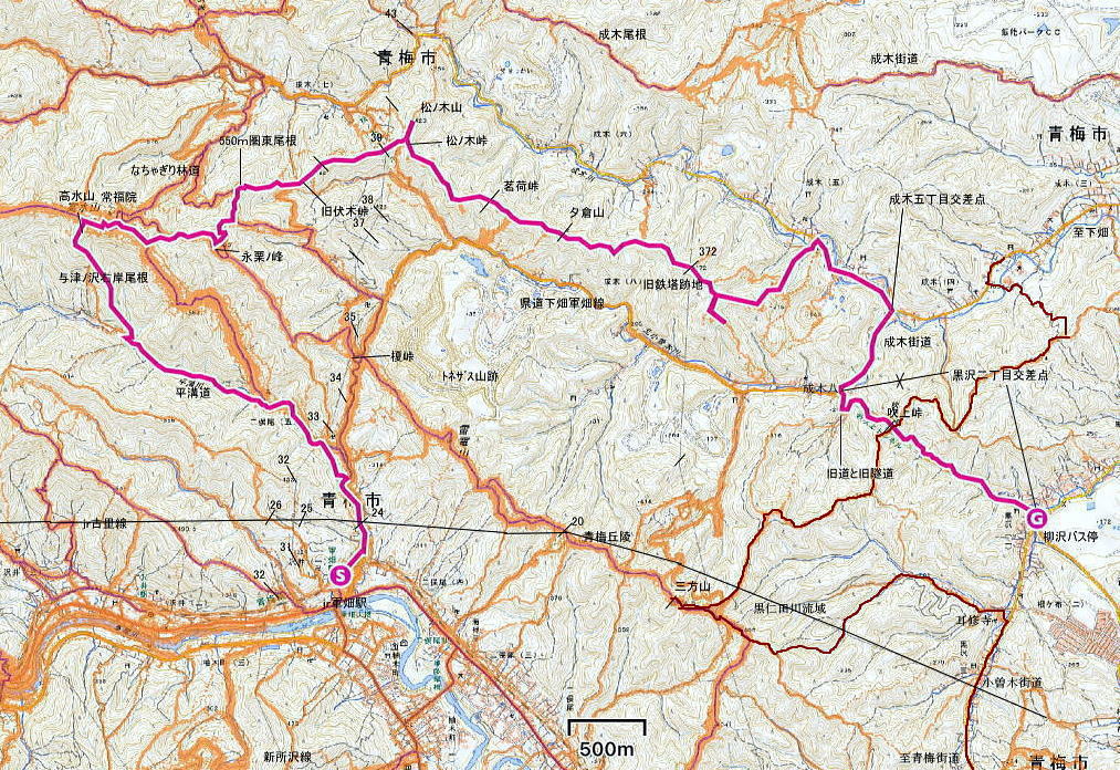 北面・・成木尾根・都県界尾根 南面・・高水山南・東尾根からノボリオイゾネと吹上峠 間野大仁田山から成木・都県界尾根の末端へ 細田の集落を探索し後.愛宕山・大仁田山から成木・都県界尾根・・切れる境界尾根は正木入側の境界脇を抜け安楽寺から下畑 北面 ![]() 青梅市北の尾根と峠・・高水山東尾根 平溝川流域の伐採地V・・高水山南・東尾根からノボリオイゾネへ 平溝通りから高水山与津ノ沢右岸尾根を詰め.東尾根を延々と綴る。旧伏木峠.松ノ木峠.ノボリオイゾネ.夕倉山.稲詰峠から成木街道にでて吹上峠 南面 2020,02,04,右上は成木・境界尾根の末端.下畑まで概念図 右端図の赤線は2024年9月に成木四から歩んだ青梅中央アルプスと裏青梅丘陵の黒仁田川流域。 2024年09月には成木(四)から指倉峠・旧吹上峠と越え.青梅丘陵を少し齧り三方山をピストン。難路の裏丘陵コースから青梅・裏コースの青梅の杜.こぶしの森)を南下した。 ・・吹上峠Top 成木林道と小曽木山稜 HP「多摩ジョッキングの道」氏より記載させて頂きました.成木街道 青梅街道の東青梅から分岐した成木街道は小曽木山稜を横切る吹上峠を越えて.成木に入り.成木川を遡上し秩父と境の都県界尾根の小沢峠. その手前で街道は終えている。成木は古くから良質の石灰岩を産し.又豊かな山林からは西川材と呼ばれる銘木を産出していた。 こうして出来た道筋は成木往還と呼ばれたが.後にこ れが青梅街道と呼ばれる様になった。 石灰の白い粉の通り道であったことから「 石灰の道」(イシバイノミチ).あるいは白粉道(オシロイミチ)などとも呼ばれていた。 ・・HP「多摩ジョッキングの道」氏より 慶長11年(1606).江戸城の大規模な増改築の漆喰の材料として.上成木村.北小曽木(おそき)村に石灰の供出が命じられ. その石灰を運んだ道が成木街道。北小曽木村で産出された石灰は険しい小曽木山稜を避けて.北方の主に笹仁田峠経由で運ばれていた。 文政11年(1828)吹上峠が開削されている。以降は吹上峠を越えてで黒沢.根ヶ布(ねかぶ).師岡(俵を詰め替える会所がありました) 経由で青梅街道に接する経路が使われるようになった。 jr東青梅駅のホーム西方の最初の踏切の北側T字路に「成木街道入口」の道標がある。起点から西方へ。先に立ちはだかる様に小曽木山稜が横たわると 「黒沢2丁目」交差点にでる。南西角地には石仏石塔5基が佇んでいる。内3基が庚申塔とあるが.分からず通り過ぎている。 小曽木山稜の吹上峠越えた西側の北小曽木川の枝沢出合には4体の石仏が祀られていた。 成木八丁目で北小曽木川沿いに入り.成木五丁目で成木川沿いに入る。北側は都県界尾根が延び.南側は今日下ってきた 夕倉山を擁する尾根(高水山東尾根)に挟まれた成木川渓谷を綴り.梅ケ平・大指(おおざす)を過ぎると成木集落に入り.新大指橋の袂でT字路にでる。 左手は松ノ木トンネルを抜けての道は旧鎌倉街道。又ここから成木街道の終点までは鎌倉街道と重複していた。 伏木橋を左に見て.ほどなくY字の分岐点に至る。左の分岐道は小沢峠へ向う鎌 倉古道.黒山や棒ノ嶺にも通じている。右は小沢トンネルを抜ける現代の道筋だ。 また分岐点には東青梅からのバス路線の終点「上成木」がある。又成木街道の終点は小沢トンネルの入口になる。その手前には白い上成木橋があり. 橋の下には先ほどの鎌倉古道が走っている。 また橋の袂の分岐道の直ぐ先で橋の下をくぐってきた鎌倉古道は小沢峠を越えている。 過っての鎌倉古道は小沢峠を越えて秩父へ向ったのであろう。分岐道の入口に「小沢峠.昭和49年6月開通記念」と刻んだ大きな石碑が立つ。 又先の新大指橋から松ノ木トンネルを抜けるか.成木橋から旧成木峠越えはていわゆる鎌倉古道を辿って.榎峠から平ら溝川沿いにJR青梅線軍畑駅にでられた。 |
