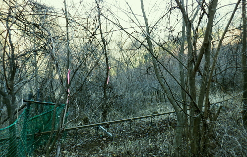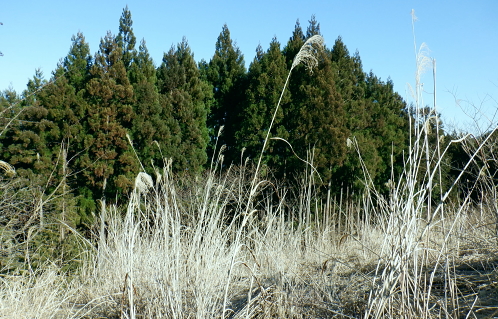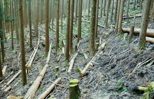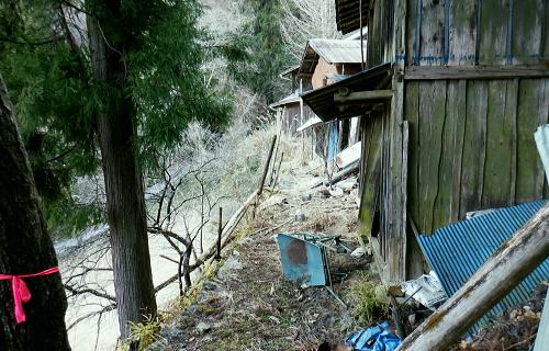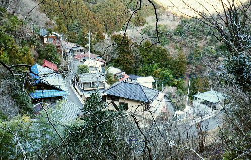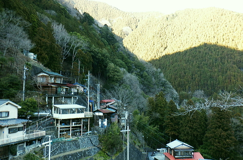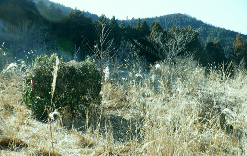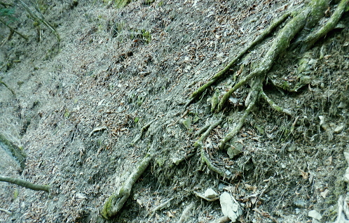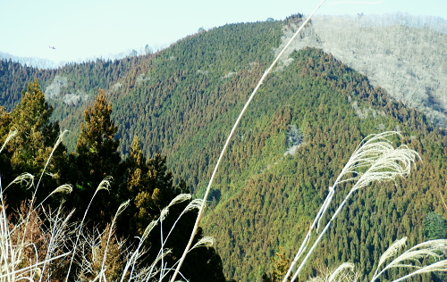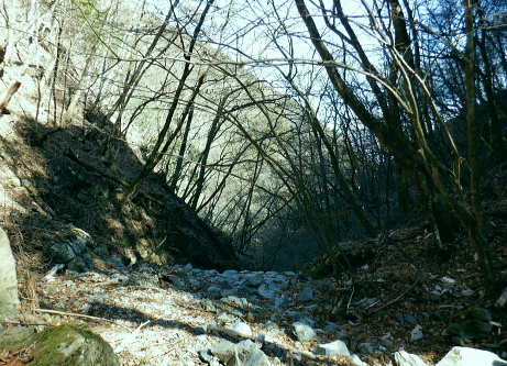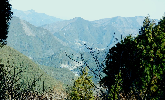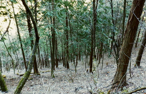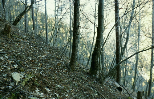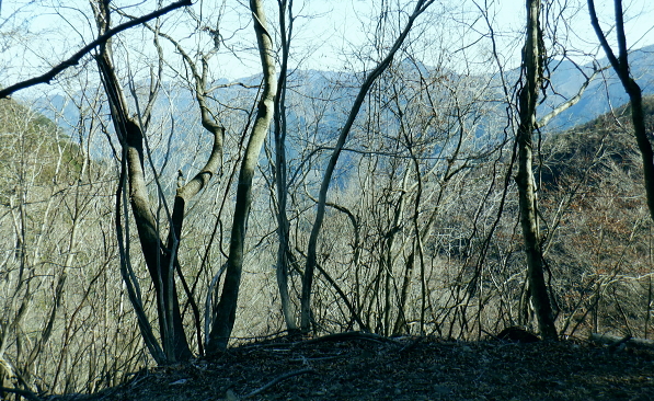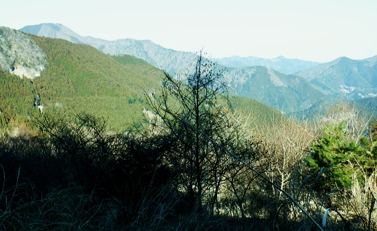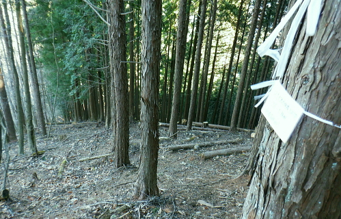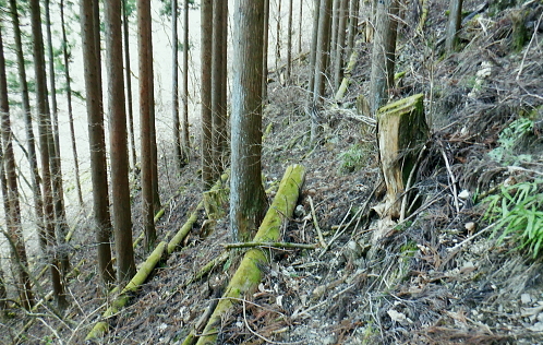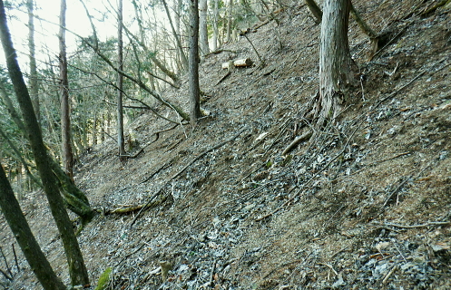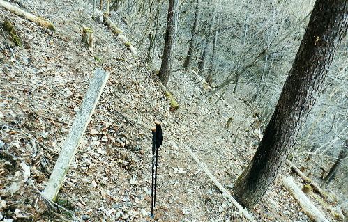 | 中段.下段径路と榛ノ木尾根の支尾根に乗る中腹道へ 下段で金山沢で難路の小沢を横切りる―中段径路から倒木帯の榛ノ木尾根の北支尾根を越え.大きく中段の山腹を回り込み. 倒木帯を綴り.最終目的地. カヤトの杉の森を訪れ.峰集落へ降りる。 榛ノ木尾山南西尾根(アシダキ沢右岸尾根) 榛ノ木尾山東尾根を下降(小中沢中間尾根) 金山沢から下段・中段径路と榛ノ木中腹道・・境の集落 小中沢左俣の金山沢・・下段経路 金山沢側の下段経路へ下る.13:30榛ノ木尾山の東尾根筋まで戻る。突き当たった下段経路の右手を進み段違いのガラ場から金山沢の沢底へ下りる。 少々落葉が多く嫌らしい急坂を降りている。先は長閑な場所もあれば昨年の19号台風の影響をもろに受けた崩落した谷間もある。 小沢ながら改修されぬまま残されたている。橋の崩落した所もあり.ガラ場もポイントになった。 それを嫌ってか.ハイカーの入山は更に少なくなっているようだった。 金山沢の沢底 沢底に降り堰堤上金山沢に降りた河原の下流側の石積みの堰堤に立っている。左岸沿いに古い林班界標柱「氷川区分59/と小班」があった。 左写真は古い氷川区分の林班界標柱. 年度を見て小中沢側の取付きで同じ頃の古い標柱を見ている。 ほぼ涸れた流れの堰上から見詰めていた。下流奥は小中沢にでている。堰を前に右岸から右前方に延びる小尾根を巻いている。 確りした巻道になり.高みにでれば一時の展望にも恵まれていた。 町界尾根と右手前の2つ目が三ノ木戸山 小尾根からの展望台.13:51右手は榛ノ木尾根の下端に当り.尾根の裏側がカヤトの原になる. 金山沢の対岸.右岸の巻道に入ると急に古い木杭で土留めされた確りした山道に変わっている。それなりの登り坂だが足が笑い始めていた。 下り一方の尾根を終え.河原で1本取った後の第一歩. 吊りそうな気配だ。足に負担を掛けたようだ。休んだ後の第一歩.気を使っている。 ゆっくり宥めながらペースを戻している。新コロナウイルスで閉鎖された筋トレは運動不足気味. 歳のせいと云ってはいられない不安を抱かされている。小尾根に乗れば枝木絡みの展望が開かれた。 小中沢沿いにいっ時下る.13:59小尾根を回り込むと確りした作業道になった。暫くは南側に向く中腹道の植林を含む作業道を歩み.左下に折れて. 小中沢沿いにジクゾクに降りていた。確りした山道で誘われるまま.途中まで下り立ち止まる。 下段経路の取付き810m圏まで下るのがもったいなくなり.細道の曲り角の分岐まで再び戻っている。 そして直進する古い山腹道に入る。ここは急斜面を横切る余りにも薄い踏み跡に変わっていた。少し悠著させられている。 小尾根を回り込む.14:04硬く滑り易く.あるかないかの踏み跡を辿ると以前は沢に橋が架かっていたと思われる崩壊地にでた。 豪雨で一辺に沢筋沿いが抉り崩壊したような渓相を持つ小沢にでている。 小沢に降りるトラバースの斜面今回は用心のためチョッと小さ過ぎるが園芸用のツルハシを持参した。昔丹沢の鍋嵐に出向いた折.何度か持参した代物。 土壁の急斜面をトラバースする時に活用している。仕掛かりが短過ぎるのが弱点で.体重で支えると固定されるが動くのに苦労していた。 それでもないよりは益しだった。今回は2ケ所ほどで使用すると考えていたが必要とする所はなかった。それに越したことはない。 抉られた窪溝の小沢筋.14:12もろい土壌から少し固まっる上部の沢沿いを横切る. 小沢を横切る 枝沢を下流側から望む.14:16高さのある木橋が架かっていたとあるが崩落し.残骸どころか何処を渡っているのかも分からなかった。 下流を渡る下段経路の橋は失われているようだ。左手前の踏み跡を辿ると直ぐ間伐材の放置された尾根状の角上にでている。 倒木が転がる広い植林帯にでた。 伐採帯の起点.14:23出た所の左端からは大らから尾根が下りている。最初はこの山腹を直進しトラバースしてみた。薄い踏み跡があるようでない。 榛ノ木尾根に直接登っているようにも思える。ただ可笑しいと戻ること2度, ルートは尾根通しが正しいと思え,諦めて枝打ちされた藪絡みの最初の大らかな尾根を選んでいる。 そして下る尾根の右寄りにルートがある筈と探しつつ下ると40mほどで作業道を見出した。 ここは中段径路.中段径路は東尾根の1050m付近で山腹を巻き.北側の小中沢と長尾沢との合流点にでる確りした作業道。 左下に尾根をそのまま下るのが小中沢へ作業道。後に小中沢に架かる橋が見下ろされると知らされたが分からなかった。 確認できればよいポイントになった筈。 1000m圏.古IL字鋼の反射板鉄塔.14:34鉄塔ではなく反射板巡視路の褪せやけたL字鋼の標柱分岐にでる。この100mほど手前の1010m圏で上段歩道を分けていたようだ。 目印になるものはなく気が付かずに通過している。上段経路は緩やかな斜面で山腹を横切り.金山沢の2本の枝沢を木橋で渡ると 尾根の1210mを越える。先ほど東尾根を下った折.林班界標柱が立ち.横切る立派な作業道を見ている。 標柱分