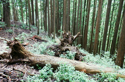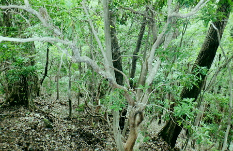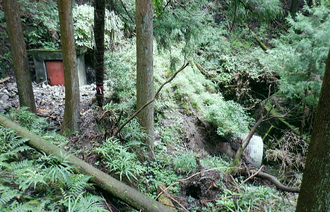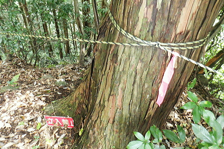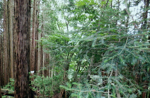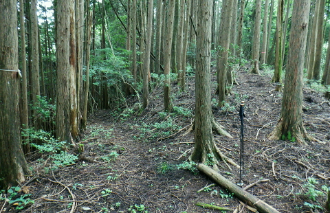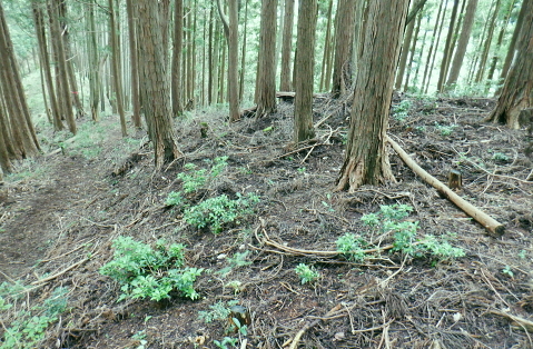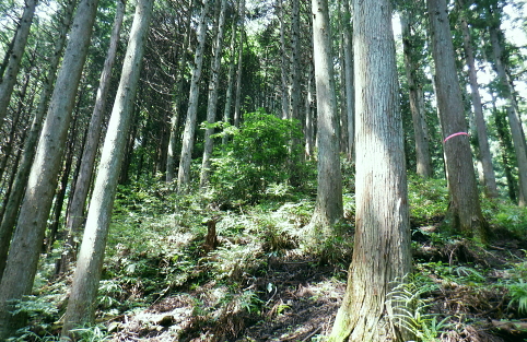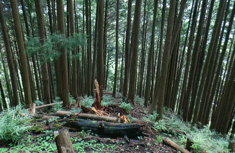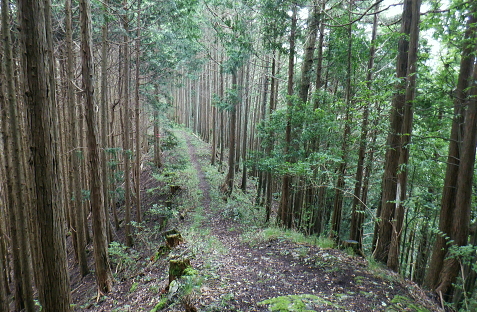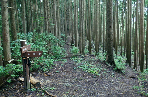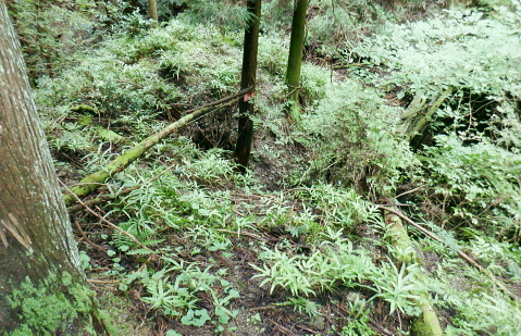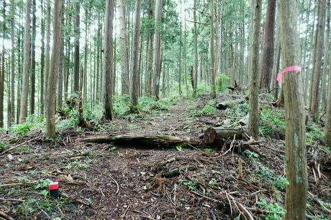 三戸山でて合わさる峰戸山弁当尾根を下り双耳峰の頭窓山をピストン。 570m圏の南尾根から大崩壊地にでて.左岸沿いの釜底から御伊勢山へ登り返し.丸っきり違った地形を持つ尾根を綴る。 蝉沢から赤杭尾根二又.三ノ戸山蝉沢左岸尾根 二又.南側の弁当尾根を下り双耳峰の頭窓山をピストンし大崩壊地へ 御伊勢山と419m点コブ脇の奥多摩線鉄塔尾根から八雲神社 弁当尾根 林相の境から南方へ踏み跡を下り登山道にでる.11:26 登山道と合流し.南東の主尾根伝いに下る.11:30 「古里駅」分岐を分けて直進.11:24右に折れればサス尾根から下端の青梅街道にある愛宕神社に降りられる。何時か下ねばと思うも気持ちのみ。 分岐から直進しjr川井駅へ最後まで登山道沿いに下れば配水所を過ぎ.山腹道を横切り.蟠竜院を経てjr川井駅にでられる。 私はその西側に並行する558m点南尾根を選び.里山の御伊勢山を訪れてから古里鉄塔群を綴り.下るする積もりでいる それが悩み迷いの末.1本手前の迷路の間違ったルートに入り込み.最後は目的の御伊勢山に立ち.如何にか納めとして山を下りることができた。 頭窓山への分岐 川井への登山道を左に分け頭窓山へ・・12:05に戻る北峰まではゆるやかな林相の境を登っている 頂稜を下る.11:41頭窓山北峰 頭窓山北峰? 11:44頭窓山は北峰と南峰の双耳峰で.この山は「妻戸山」.「頭窓山」とも表示され.「まず」とは「樹皮を結び合わせ. その上の茅などを乗せて.山から曳きおろすソリのようなもの」とある。三ノ戸山から頭窓山の一帯はかっては茅刈りの共有地で. 頭窓で茅を曳おろしていたことが山名の由来になったと云われている。 急斜面を下り返す灌木帯.11:48頭窓山 (670m)・・ここ南峰690mの取付きで戻っている.11:55南方向に向かい正しいのだが磁石だけの考えて.南峰を目の前にして勘違いし又もや戻っている。後に間違いなく。 頭窓山への分岐を振り返る.12:20分岐に戻り巻道を進み.右後方から頭窓山の稜と合わさった分岐 今日一番の長閑な尾根道.12:20踏み跡と合わさってからは歩き易い登山道に変わり.小コブを避け道筋が右に曲がる手前からは微かな踏み跡が右前方に延びている。 地形図のほぼ破線路通り間伐された枝が放置され.500m付近まで降りると右に窪地が現れ.その左側を下ってゆく。 左に墓地が現れシダ桜の西光院にでる。 570m圏?・・後に570m圏と知る ここで558m点(578m)とも思い.南尾根の下りに悩む。気圧の変化に高度計が狂い.微妙な高度差が更に558m点が何処だか悩まされている。 上から下りてくると570m圏と558m点は似たような地形が描かれ悩むことになる。又金山平とは何処だろう? 一本取り先を考える。ここは結果的には570m圏だった。 下る南尾根を間違えれば大崩壊地の中央にでて尾根は没することになる。558m点ならば大崩壊地の東縁を綴り. 御伊勢山を擁する尾根を下る筈だったった。主尾根と南尾根との角度が広すぎ.疑念を持ち続けている。丁寧に地形と尾根筋を観察し 2つの南尾根を頭に浮かべるも.高度差としては短く.まだ戻れる時間帯で余裕はあるのの.歯切れが悪く定かではなかった。 南尾根へ.570m圏の脇にある倒木 手の入る570m圏の赤帽黒杭を下る,13:00570m圏肩の南尾根を下降 下って直ぐ現れた倒木.13:00 細かい露岩が現れ急下降.13:06 尾根幅広く長閑な尾根にでて.13:17一時尾根筋は穏やかになり.この先は直ぐ急激に再び抉り落ちていた。ヤバイと戻ることを決意するも. 裾の鉄橋を渡る奥多摩線に.街道を走る車の騒音がはっきりと真近に響き.再び谷間に顔を向けている。 それもちょっと高度を下げただけで.谷間に入り込むと裾野の騒音は全く聞こえなくなった。不可思議に思う。 風はそれほど気に掛けることはなかったが南風が丁度に当たる斜面だったのだろうか? 大崩壊地北側縁の作業道にでる 大崩壊地北側縁.13:20長閑に見える尾根を振り返り見上げている。私の背は薄暗い。抉り落ちる大崩壊地と変わり.その境をなしている。 立派な林班界標板「27-3-2・27-3-11」が立ち.明るい台地の作業道に降りてきた。 歩かないかの作業道はこの後崖縁を綴り.沢を横切ると尾根は途切れる。 南尾根からのルート略図・・558m点で右側の破線路と合わさる ×は「立入禁止」のプレードあり.破線路は南東へ延び.奥多摩大橋よりに下りている。 左手が570m圏南尾根で大崩壊地に突き当たる。右尾根の558m点南尾根は御伊勢山を擁する尾根。 「立入禁止・3」は558m点南尾根の崩壊地東脇にある。「4」は崩壊地をでた山道にあった。崩壊地からの下降は不可能. 登り返し右隣りのの南尾根を目指し.御伊勢山の擁する尾根に回り込む。 大崩壊地の北側の高みより ![]() 「立入禁止・1」地点 今日初めて見る型の標杭 林班界標板の立つ.この一線を境に背は長くトラロープが張られ.抉り落ちた険悪たる闇の谷間へと入り込む。 「立入禁止」の古いプレートが裏返しに落ちていた。その脇に真新しい「29年度」と記された青いプラ杭を初めて1つ見付けている。 どう見ても作業道はありそうだ。崖縁の暗い闇の処が
