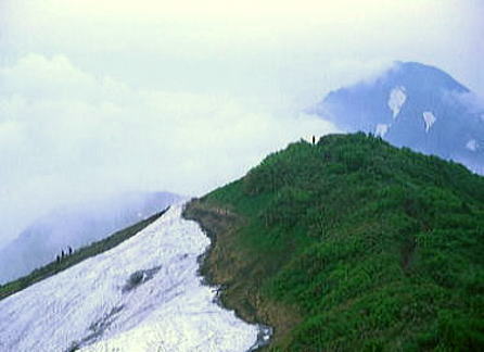 | 7月18日晴.夜半雨強し・・祓川.停滞 百草ノ池では空しく力を失った私達は祓川に出てからは充分.気持も癒され憩いの場を創りだしている。 今までと丸っきり異なる草原の台地が頂稜を覆っている。水場と寝床を考えると昨日とはドンデンの別天地。差居心地は申し分ない。 ここは草地にはび込む残雪が窪地を埋め.清い水が雪解けとなって生まれ.集まり流れている。 そして再び雪塊に潜り込み.深く切れ落ちた水無川の御月山沢へ怒涛となり流れ落ちていた。 雨上がりの草原は明るい陽射しを取り戻し.頂稜に煌めく残雪だけでなく.草木に乗る雨雫も粒となり輝きだしている。 眺望も素晴らしく.予想どうりのよいテントサイドを.ここ祓川に見出した。 御月山沢.源頭の丘にも暑さが戻ってきた。裸になる陽射しの強さをも強調していた。僕はマットを持ちトカゲに精をだす。 草地の香りが漂い.裸の体が心地よい。 脇に積る残雪から雪解け水がチョロチロ流れ.その低い音色の贅沢さが耳に伝わってきた。 静かだ。本当に静かだ。彼女達の明るい会話も風に乗り漏れてきた。 ![]() でかいテントと乙女達 |