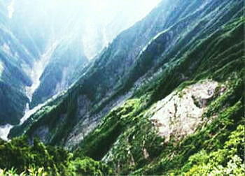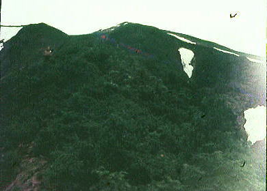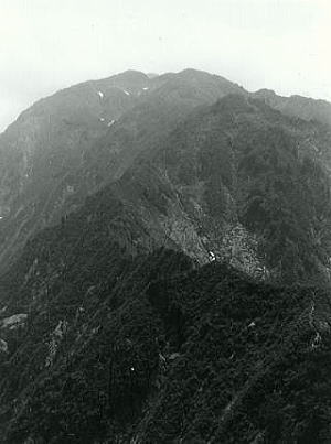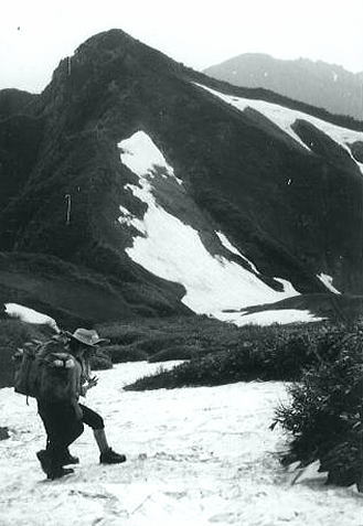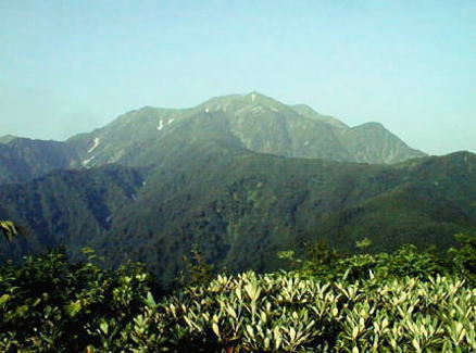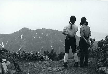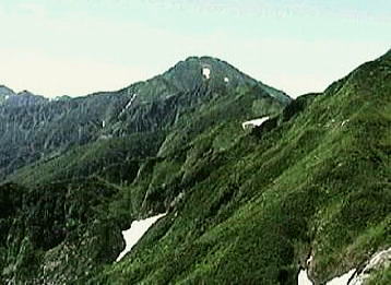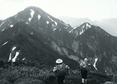 | 晴上がりの停滞 私はこの山気を胸一杯に吸った。遠くの眺望を楽しみ.昼寝をしながら.グリーンエメラルドに酔いもいる。 又この大気を彼女らが作る質素だが贅沢に思える食事と一諸に吸いもした。 又それでも飽きたらず天気回復をよいことに.予定通りの停滞日と決めいた。 更に強まった陽差しに.日傘を差しながら山のオゾンを。この時ばかりはゆっくり頂いている。 私の頭には「荒天は行動中止.回復はコースを縮める。」と云う規まりは今はない。合宿ではない。個人山行の特権でもある。 鉄則は「余禄を幾分蓄えておけ.それがある以上.十二分に山を楽しめ。」と云うことだった。 それにしても今度は贅沢に.暑いオアシスになった。 7月19日晴後霧.祓川c―オカメノゾキ―五龍岳―1500m地点c 消え逝く残雪祓川c3. 7:35一8:20小:35一9:25小:35一9:52月老ノ頭一10:25小:40一10:45オカメノゾキ一11:35大12:15 一13:05小:20一13:37荒山一13:55小14:10一14:50五龍岳15:00一15:20(1500m地点)c4. 昨夜.激しい通り雨が降り.7人天の馬鹿でかいテントに傘を差して眠っている。 その為か起きた時.体は固まり重かった。 甲南大WCはこの雨の中.ビバークしたそうだ。早朝祓川へやって来た。 僕等は彼等に擦れ違うように御月山へ登って行く。 ![]() オカメノゾキより御月山.中岳 |