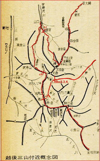 新潟県魚沼郡付近から東へ越後三山(八海山.中ノ岳.越後駒ヶ岳.)を望む。 s38年(1963年)のこの山域で全日本登山大会が開催され.その折各団体と協議して「越後三山」と改名されるまでは, 魚沼三山(八海.銀山.魚沼駒ヶ岳.)と呼ばれていた。越後駒ヶ岳は山容が馬の形をしていることから付けられたと云われている。 越後三山は魚野川の支流.水無川流域を囲むよう山群を連ね.深い谷間は幾つもの滝やスラブを形成し. 頂稜は信仰霊山の長い歴史を持つている。八海山は修験道として山伏達の「三山駆け」の苦行する姿も見受けられている。 7月16日高曇. 枝折峠―百草ノ池―1550m地点c1. 4:27小出6:40.越後交通\290=7:45枝折峠8:10一8:45旧枝折峠一9:00小:10一10:00小:15一11:04水場:40 一11:50小倉山12:13一13:03百草ノ池:32一14:20小:30一14:45(1550m地点)c1 昨年秋.平ヶ岳入山の為に枝折峠越えを行ったばかりの国道352に再び通う。小出の町並みを抜けると凸凹道が続いていた。 大湯を過ぎ.つずらのうねり道が越後駒からの東山稜まで続き.バスは新枝折の峠にでる。 朝もやに霞む銀山湖を背に.峠に降り立った。延々と続く脊稜を背に.駒ヶ岳は雄大な山容を構え聳えている。 小出=銀山湖間アプローチ 今回は如何しても好天の祓川か.中岳山頂付近でのんびり憩いたい気持を持ってたい。その為入山はスピーディに。 所々.水場もあることだし空ポリで精神力の増強を図っての行動。 しかし何と蒸し暑いことか.早くも弱気が出てしまっていた。 登る一歩々に汗が吹きだし.楽園であるはずの百草ノ池は汚れているだけの涸池でしかなかった。 先に進むしかなく再び樹林帯に入り込む。 枝折峠直ぐ傍の旧枝折峠(明神峠)は「銀の道」として江戸時代.1700年代に奥只見銀山への物質路として開かれた古い峠。 銀山平から駒の湯を経て小出に繋ぐ古道。 |