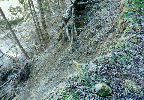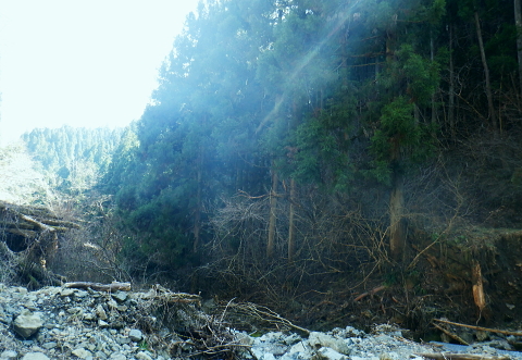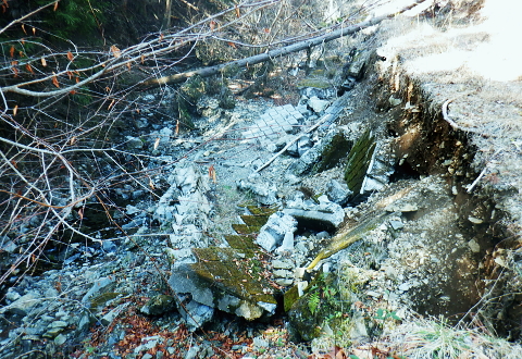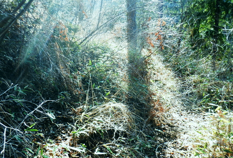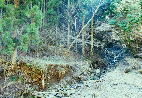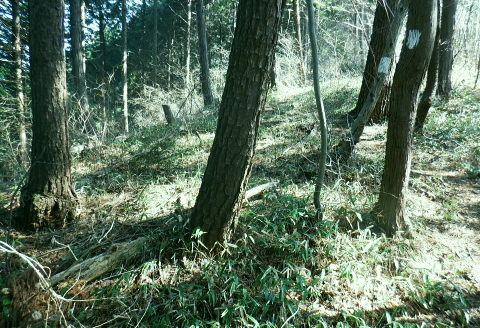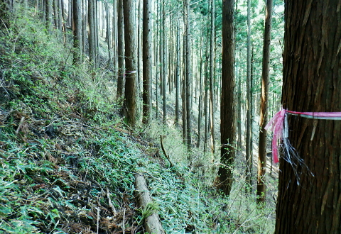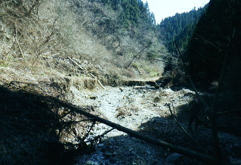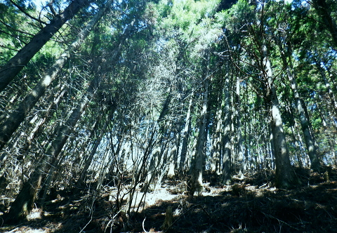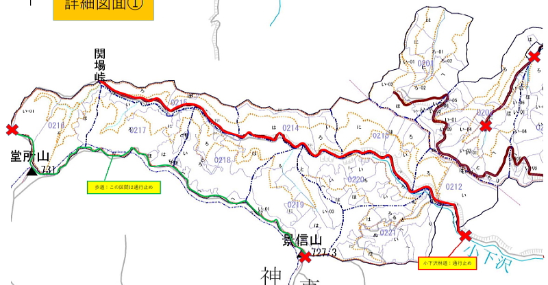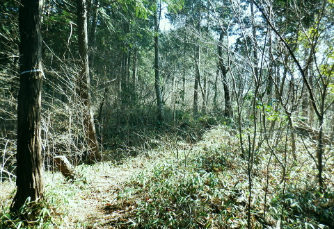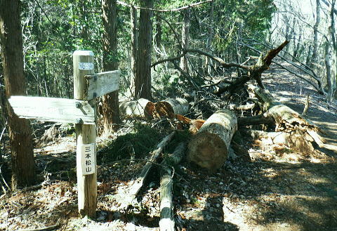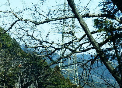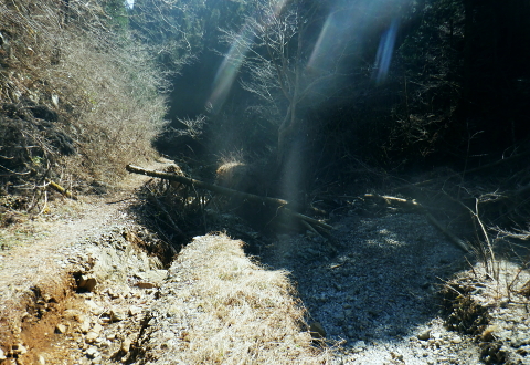 | 新多摩線74号鉄塔巡視路から小下沢林道に下り対岸の逆沢林道を詰める・・北高尾山稜越え. 北高尾山稜の関場峠から三本松山を経て74号鉄塔の巡視路にでて.劇斜面を下り.小下沢左岸の台風で荒れ果てた小下沢林道を下る。 小下沢本流を含め下流側右岸の逆沢林道の起点付近は深く抉り屑られ.見るも無残な姿。そこを乗り換え逆沢ノ沢右岸尾根を詰めている 便楼左岸・鞍骨沢左岸尾根から北高尾山稜 関場峠から三本松山・74号鉄塔・小下沢・逆沢林道・・台風19号の崩落現場 逆沢ノ頭から景信山東尾根.木下沢梅園 関場峠 559m・・小下沢林道の分岐.10:50北高尾山稜の関場峠は北側に峠路がないせいか突き上げる尾根筋の肩にあるようなイメージを抱かされていた。 東側の三本松山から延びる尾根末端地区には関場の集落があり.峠名はそこからの由来か? ここは北高尾山稜と裏高尾主稜に挟まれた小下沢沿いに延びる小下沢林道で.その分岐にも当たっていた。 立木の黄色いテープ裏からは小下沢の林道終点へ細道が降りている。小下沢林道は一昨年の台風19号以来.今だ閉鎖されていた。 ただ人の通行は可のようだった。私は74号鉄塔基部から直接.小下沢へ下る積りでいた。・・おぼろの背は堂所山. 三本松山 小広い山頂を直角に右に折れ「三本松山」の道標を振り返る.11:06頂の手前には林班界標が立ち.山稜の前後には「三本松山」と「偽りの山名標がある。 関場峠から緩やかな登りで北稜の一番大きな山容を持つ三本松山661mの細長い平頂にでる。脇には伐採された巨樹が積み重ねられた台地。 道標「←八王子城山・関場峠.堂所山→」が立ち.立木にはベタの赤ペンキが塗られ「山名標が掲げられていた。展望はない。 頂の北面には2つの北支尾根を案下川に落とし.頂の少し手前から延びる北尾根は便楼沢右岸尾根になる。 今朝は左岸尾根から鞍骨沢左岸尾根に移り詰めて来た。三本松山北東尾根には77号鉄塔が建ち.関場の手前て案下川を渡り街道にでられる。 又枝尾根には76号鉄塔が建つ。その先は城山から黒ドッケ・湯ノ花山。又ここから北側へは.北土代沢林道を利用し下りられた。 尾根北高尾山稜伝いに東側に74号鉄塔を目指すと立木に「三本松山」とある。赤杭の三本松山からは北側の北土代沢林道に下りられる。 更に590m圏峰の都の道標「←城山6.0km・堂所山2.0km.景信山4.6km→」が立つが山名標は間違い。 更に598mでは偽りの「三本松山」を通っている。距離は短いが点々とあり.新多摩線74号鉄塔の基部にでていた。 新多摩線の鉄塔群 北高尾山稜に建つ74号鉄塔から小下沢林道へ下る.11:10鉄塔基部から狐塚峠方面に平行する踏み跡は北高尾山稜中断歩道。 74号基部から小下沢対岸の北枝尾根に建つ73号.72号鉄塔 三本松山の東側の分岐(誤報点)から林道に落ちる枝尾根に建つ75号鉄塔 北高尾山稜の499m圏に建つのが送電線新多摩線の巨大な74号鉄塔。首都圏を取り囲む超高圧ネットワークの500KVの送電線。 新秦野変電所から新多摩変電所までを鉄塔91基で結び.昭和55年12月から運用されている。 基部の真下を流れる小下沢へは薄い踏み跡の激斜面を巡視路が横切っている。対岸の陣馬高尾縦走路の小尾根に建つのが 73号.72号鉄塔。この先.都県界尾根を越えた所に直ぐ71号鉄塔が建つ。 底沢を下りた送電線は津久井湖・宮ケ瀬湖を横切り.東丹沢を縫い新秦野変電所と結ばれている。北側の75号鉄塔から先の送電線は 醍醐川流域を横切っている。先々月登った中谷山尾根の78号鉄塔を架け..醍醐・通り尾根から戸倉の五日市近くにある新多摩変電所と繋がれている。 真下の鉄塔巡視路を下り小下沢へ手前の鉄塔標柱脇の立木の白帯を追い.小下沢の左山腹に回り込んで.ほぼ枯葉で埋まるプラ階段をジグザグに激下すると小下沢林道に降りている。 74号鉄塔基部の真下 雑木の覆う急斜面から見上げる小下沢林道.関場峠方面 小下沢左岸沿いの広い河原状台地に降りる.11:2474号鉄塔からの古い送電線巡視路のプラ階段から鉄製階段を下る。 左岸に綴られた小下沢林道. ここは小広く開かれた林道の台地で.原形は留めていたが下流側は荒れていた。 鉄塔標柱は斜めに傾き.悲惨だった姿が残されていた。それでも大分改修され.人の通行は可になっている。 小下沢流域 荒れ放大に崩壊した左岸道を逆沢林道の起点まで綴る.11:272019年の台風19号の被害による小下沢林道の通行規制・・2012年2月29日現在 浅川林務出張所路肩崩壊のため通行止は関場峠〜小下沢林道方向・狐塚峠〜小下沢林道方向・景信山〜小下沢林道方向・・2021年3月13日現在 災害 YamaRecoに投稿したpiste氏が2019年10月14日に小下沢林道を訪れたHPを拝読させて頂きました。 「野営場とゲート間にて林道が完全に崩壊し.沢水の減水により沢筋の通過が可能か否か慎重な判断が必要となります。 高巻きは地質が軟弱なため滑落する可能性があり危険です。中央道は通行止め.中央線は運転見合わせ.とても静かで怖いです。 旧甲州街道沿いも沢水の氾濫により流木と泥土が多くありました。」とあ