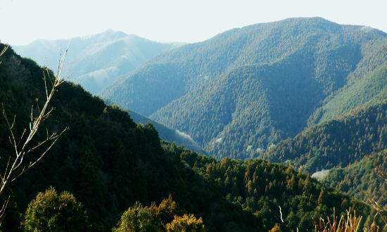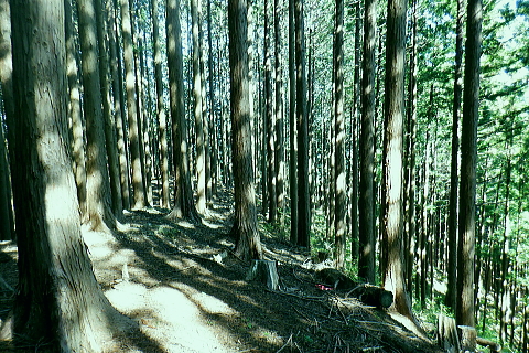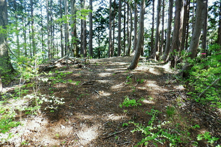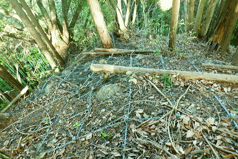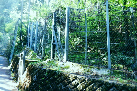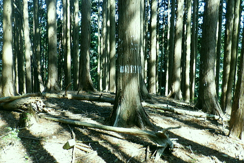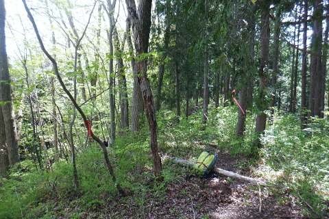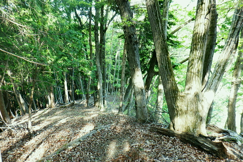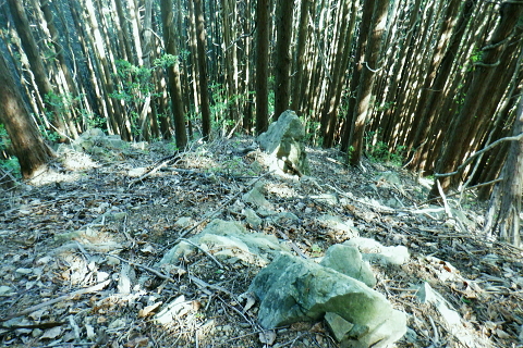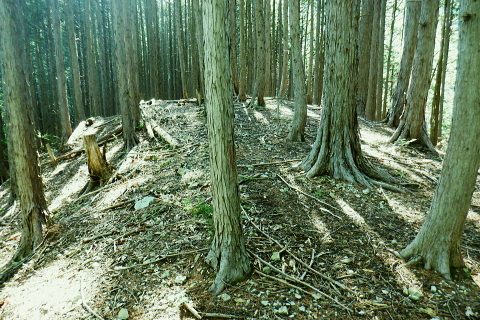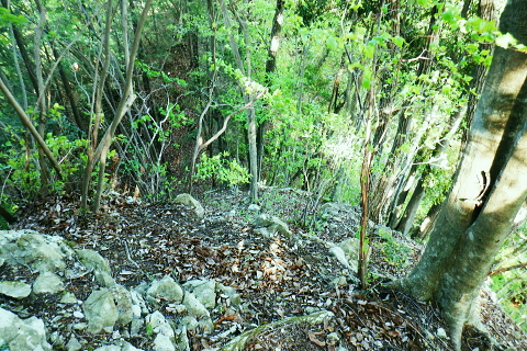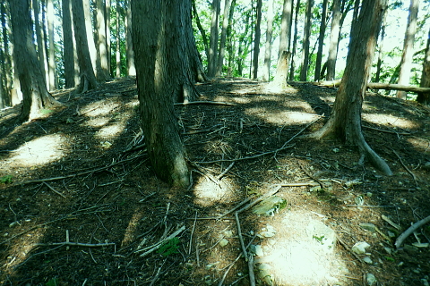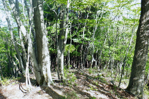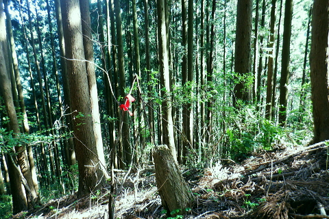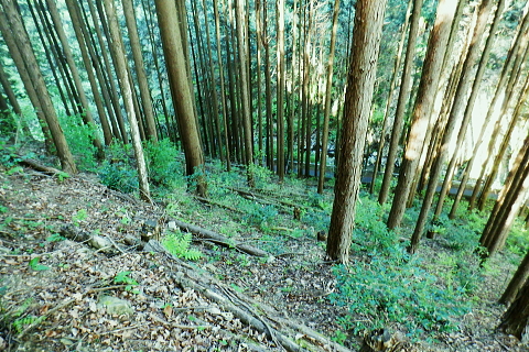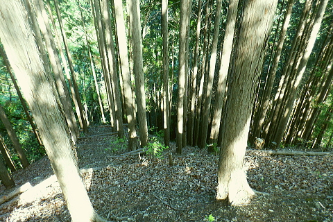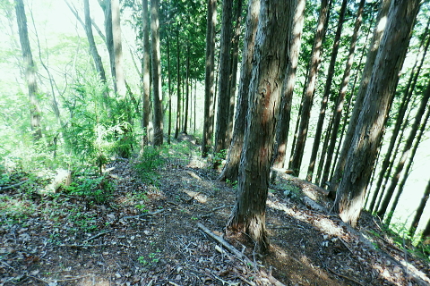 | メシモリ岩山南東尾根 2021年04月. 椚沢林道から本郷山北西尾根を下り三ノ沢左岸道にでて.二俣中間尾根から再び中谷山尾根に乗り.メシモリ岩山南東尾根から陣馬街道 2023年08月. 南郷bsから熊倉沢西沢.北尾根と繋げ.猛暑の笹尾根を醍醐丸.高岩山へと綴り.メシモリ岩山南東尾根から陣馬街道 2025年09月. 椚沢橋bsから高茶山東尾根..高尾陣馬縦走路.山王峠南尾根.吉野矢ノ音南尾根から甲州古道.与瀬神社・・南東尾根変更. 再び中谷山尾根の720m圏コブに立ち.案下川側へ尾根を横断する。 三ッ沢沿いに入り.高岩沢・サネクボの中間尾根を詰め中谷山尾根のコブに立ち.メシモリ岩山南東尾根から陣馬街道..陣馬高原下bsへ。 椚ノ沢南尾根と本郷山北東尾根 三ッ沢左岸道から二俣中間尾根 720m圏コブからメシモリ岩山南東尾根・・低山ゆえ下りはやや気を遣う 高岩山.メシモリ岩山と本宮山 伐採地跡からの展望・・2023.02.01/13:18高岩山と本宮山との間に小さな尖っ付きメシモリ岩山.見えぬがその笹尾根側を横切るのが陣馬林道で手前の鞍部.和田峠に繋がる。 便桜沢右岸尾根の450m圏の平坦地に降りて北西側の伐採帯から望む。左上の正面.頂点から派生するのが 笹尾根の高岩山で.手前の小コブがメシモリ岩山。正面に落ちる尾根がメシモリ岩山の南東尾根。 更に手前の堂々たる山容は本宮山東尾根と南東尾根。本宮山参道ルートで.550m圏コブからの東枝尾根は麓にで熊野神社の境内に降りている。 メシモリ岩山の下りで陣馬街道に下り.上案下で左上の高台に熊野神社を見上げ.陣馬高原下バス停に作業道伝いに降りられる。 又メシモリ岩山と本宮山とを結ぶ南面の醍醐側は三ッ沢流域で.三ッ沢伝いに二俣にでて.高岩沢とサネクボの中間尾根を今詰めてきた。 痩せ気味の小コブに立つと左手の樹冠を通し.堂々と聳える本宮山が.丸い山容を膨らませ.大きく望まれる。 中谷山尾根の720m圏小コブ コブから西方を望む・・高度725m圏→720m圏訂正中谷山尾根720m圏の肩とも云うべき小コブに突き出る。黄色いプラ杭を跨ぎ.灌木との林相の境の高みに立つ。 稜右手の高岩沢源流側は植林に深く覆われていた。コブの立木に付けられたテープには「本宮山」と記されている。 逆側のの西方に示された.メシモリ岩山は直ぐ脇だった。 メシモリ岩山 14:25メシモリ岩山750m圏コブは植林に覆われ展望はない小平地. ここで関場から登ってきた女性の単独行者と今日初めて出会っている。 関場から登り.厳しい藪山で2度ほど迷ったとのこと。醍醐林道に下りればと頑張っている。山名標があると足元の根元を指し. 「飯盛岩山」と教えて頂いた。私は彼女とは反対側の尾根から南側に降り.中谷山尾根とも分れる。 メシモリ岩山南東尾根 下山した陣馬街道の降り口に「林道ひるくぼ線」とあった。灌木は出だしだけで殆どが植林に覆われた尾根を下る。急坂があるものの低山特有の分かりずらい地形を成していた。 高低の変化はあるものの周囲は何処も杉林の中を陣馬街道に向かい下る。 メシモリ岩山南東尾根を下る 680m圏.最初は明るい尾根から正面の杉の植林帯に入り込む 670m圏.植林された広い斜面を適当に下る.高度にして20mほど下り.南北に横切る踏み跡に突き当たる。右に折れ南側に修正した。 620m圏.東北東へ斜めに横切る.14:55 600m圏.この立木の白帯から右(南)寄りの尾根へ.14:56 赤印を見て左(南東)の尾根に乗り.笹薮帯を抜ける.15:01 580m圏.案下川沿いの平坦な尾根に乗る.15:03北東寄りに下り過ぎたようで途中で真南に下り修正した 560m圏.陣馬街道に突き当たるまで真東へ直進.15:07538m点コブ 足場は軽やかな長閑な尾根.15:08 東方へ.15:09 右手の中腹に明るい平坦地を見下ろす.15:10 露岩の激痩せ尾根を抜ける.15:12 街道まで激斜面を下降.15:13 確りした踏み跡を下るも.5:17この下で左に折れず.忠実に尾根筋を下った 460m圏.鉄製の網骨下部.15:20 地面に広がる土砂崩落防止用の鉄製の網骨.15:20鉄製の網骨を右に側に回り込み.下流側の左側に回り込むところで.右下に陣馬街道が横切るのが見下ろされた。 ルートとは反対に尾根中央から南西の激斜面を下る。度を越した斜面は植林の立木を利用している。 見下ろされた街道へ直下.15:24陣馬街道 破れた獣網から陣馬街道に降りる.15:30落石防止用の網が側壁の高みに連なり街道に下りられず。網の手前には街道に添い踏み跡が続いていた。 左へ折れ小沢が現れるまで進めば.網壁は途切れ街道に下りられる。菱型の標柱「林道ひるくぼ線」が立てられ.その先が上案下配水所。 丁度下りてきた柵を境に道路にはマイカーが一台駐車していた。運転手は椅子を持ち出し何かをしているようだった。 声を掛ける。「済みませんが出口は見当たりませんでしょうか? 」と。直ぐ反応して頂き.やや上流側にあることを知り降りている。 破れた金網を抜け.擁壁にストックを落し.ズリ降り落ちた。 外側より山側を囲む網壁降りた陣馬街道は南郷林道の起点から陣馬街道を下った最初の小沢.ヤマケ沢と案下沢との出合前付近に降りている。400m地