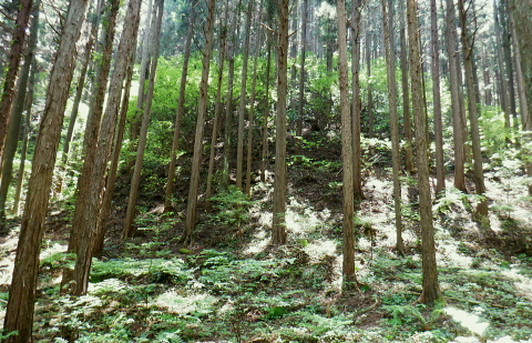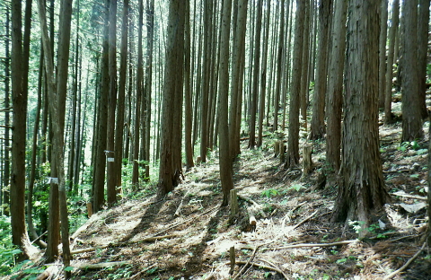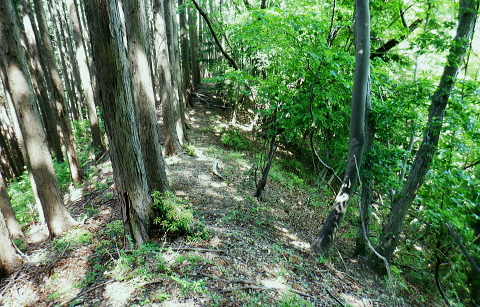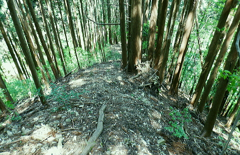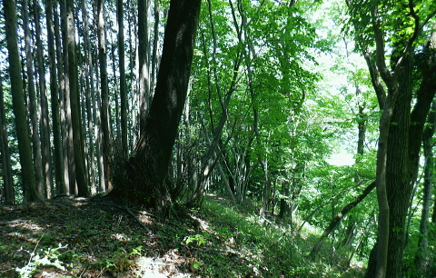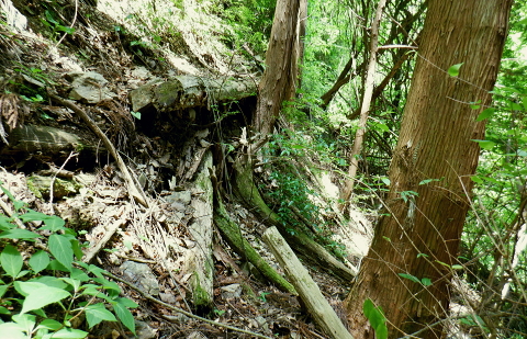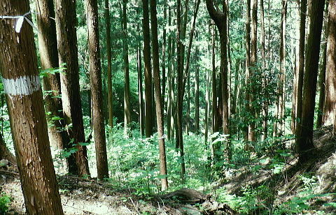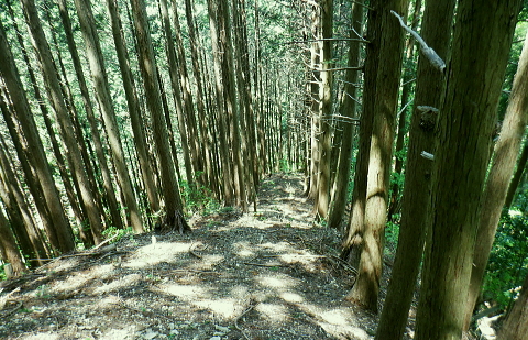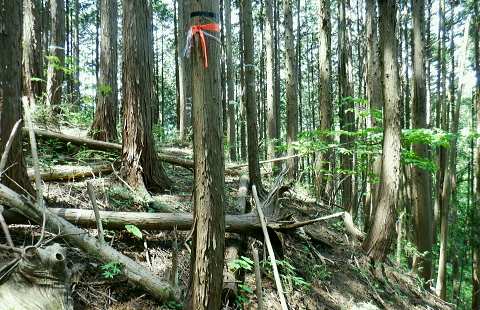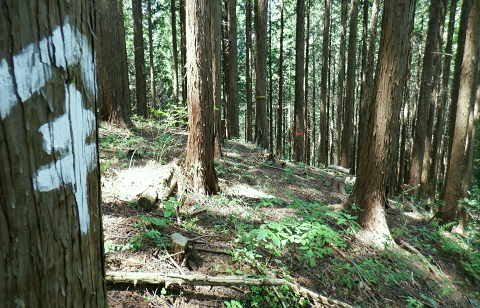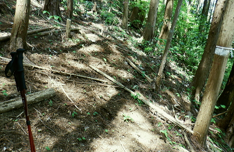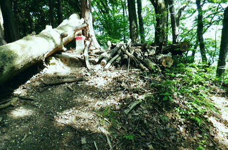 | 便楼沢左岸尾根から鞍骨沢左岸尾根を横切る 便楼沢左岸尾根の左支尾根(鞍骨沢中間尾根)から鞍骨沢ノ滝の左岸を高巻き.伐採地から鞍骨沢左岸尾根を横切り下案下.へ古道分岐 底沢の白沢川左岸の新多摩線69号鉄塔尾根から入山 堂所山と便楼沢左岸尾根から鞍骨沢左岸尾根を横断・・幻の鞍骨沢ノ滝 旧案下道を綴り難渋し再び鞍骨沢左岸尾根を越え末端を下る 堂所山から鞍骨沢左岸尾根のツメ.680m圏までは初めてのコース. 越えて屈曲点の640m圏で北側に延びる便楼沢左岸尾根から案下へ下る。 それが順調に磁石で調べた筈が左支尾根に入ってしまっていた。踏み跡は明瞭だが少し悩み.戻っては再び同じ支尾根に入り込んでしまった。 結果的にはそのまま鞍骨沢ノ滝の上部に降り.大滝から鞍骨沢左岸尾根側に回り込み.小さな伐採地にでて尾根を横断し.下案下地区に下りている。 春先には逆に川井野から便楼左岸に乗り.林道伝いに鞍骨沢左岸尾根の中半に移り.北高尾山稜へと詰めていた。 堂所山 高度計726m→733m.9:45堂所山は東京都八王子市と神奈川県相模原市との境界にある標高731.0mの頂になり.奥高尾縦走路の分岐付近にある。 確り踏み固められた小広い頂にはこれまた立派な山名標が立てられていた。間近を何度も通っているわりには初めての登頂だった。 又北高尾山稜のツメに当たり.長く延びる小下沢左岸尾根は富士見台で.八王子城山と熊野山とに延びる2つの支尾根を分けている。 北高尾山稜は右に大きく回り込む形てUターンしていた。その北側から東側に回り込む屈曲点から便楼沢左岸の北尾根に入る。 その先の関場峠からは小下沢沢へ下る分岐があり.下沢沢林道へ降りられる。ただ頂の案内板には「小下沢林道は下山できません」とある。 一昨年の19号台風の影響がまだ続いているようだ。 北高尾山稜に入る 鞍骨沢左岸尾根のツメ.10:06鞍骨沢左岸尾根のツメまでは初めてで確り踏み固められた登山道を歩む。このツメでは2ケ月前にはなかった真新しい白い境界見出し標. 「37支12 林野庁」が立てられていた。初めて見る形の見出し標.右脇にある林班界板は健全, 640m圏.便楼沢左岸尾根のツメ.10:17尾根幅一杯に広がるジグザグ道を下ると屈曲点にでる。先はほぼ直角に急下降し関場峠に下りている。 コブともならぬ点には1本の太い倒木があり.その根元にはここでは珍しい赤笠のコンクリート杭がある。 前回はここから関場峠越え74号鉄塔から小下沢へ降りている。北尾根のツメは右(北東)に主尾根に合わせ. 左方(北西)にも短い支尾根を鞍骨沢に落していた。地形的には鞍骨沢の中間尾根で.この支尾根を下る。 左支尾根 右主尾根でなく左へ?磁石で方角を見定めた筈が何故か.群がるトレイラーに気が散り.奥側にもある倒木を越え左支尾根に入ってしまった。 540m点で可笑しいと登り下りを繰り返すも,折角入った尾根. 鞍骨沢左岸尾根に移ればと伐採された尾根筋の黄色いプラ抗のある尾根を下る。 そして鞍骨沢ノ大滝を見て下る積りが.左岸は藪絡みむトラバースは猛烈な薮に阻まれた。大滝があると分かるも.確り見定めることはできなかった。 左支尾根 590m圏.鞍骨沢中間尾根へ.10:21下藪は殆どなく林相の境を下る 木洩れ日が続く歩き易い尾根伝い.10:23 危険性のない素朴な尾根.10:25 一時逆側の林相に被われ.共に植林の中になる.10:25 植林に巨樹が1本.目立ち残されていた.10:26 すっきりした尾根筋から末端にでる.10:29 506m圏.尾根末端の岩コフ.10:34 550m圏.一度戻るが再び下り沢沿いへ.10:52一度戻るが確りした尾根筋の末端近くに真新しい黄色いプラ杭を見付け.前進して沢底へ.鞍骨沢ノ滝へ。 鞍骨沢上流・・中間尾根末端 対岸に桟橋が見下ろされ.跨いで鞍骨沢を左岸に渡る 470m圏.鞍骨沢の沢底.11:00流水の殆どない沢底から左岸のボロボロの作業道へ? 否踏み跡とも云えぬ藪絡みのトンネルに入る。 真横が鞍骨沢ノ滝? 11:03枝草の擦る音だけが騒めく藪の中から如何やら滝音らしき落ちる音色が聞こえてきた。 流れるような静から瀬々らぎとは異なり.ド〜と落ちる怒号とも違う。谷間は覗き込めぬほど深く抉られている。 見えぬ沢底からの高度感は強い.滝音は真下でなく.横から聞こえているようだ。水量が少ないのは今確認したばかり. 少ない流水の筈の滝. 何故が滝音だけが耳に付く。ここだけは日も閉ざされ.木洩れ日もなく薄暗い。 不安定な足場の藪絡みをトラバース.11:03地形的には鞍骨沢ノ滝らしき深山の様相を抱き.滝場の高巻きには藪絡みの中にバラ系の棘がある。 足場はかなり悪いだろう。上部からは谷間を覗き込めぬほど深く抉れ落ち.高度差も分らぬほど見定めるものはなかった。。 上部から滝を見ることはできなかった。目の前を覆うのは短いながら四つん這いでストックで支えての藪又藪。 覗き込めぬ深さに.おぼつかぬ足元を確認し支える両手はよく動いた。 480m圏.左岸山腹の伐採切り開き斜面にでる.11:11左上に藪が途切れると急に開かれた明るい斜面にでる。小さな伐採地で尾根末端にあった黄色いプ