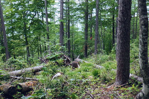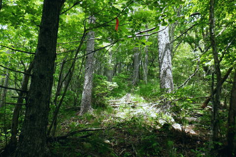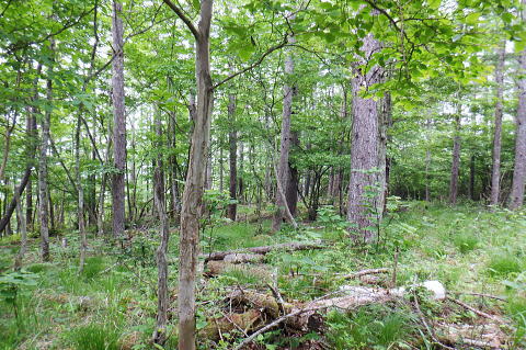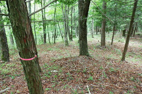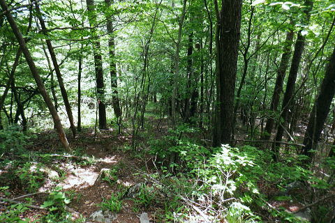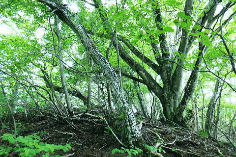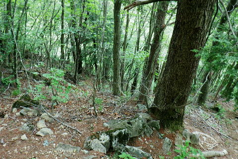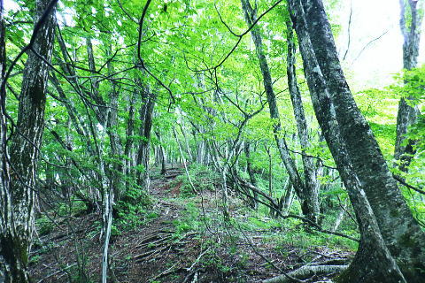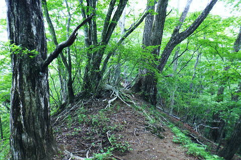 | 水ケ森林道から水ケ森越え.荒川支線分岐から境界尾根へと繋ぐ. 一ノ森林道を分けて水ケ森の北峰寄りに規模は狭いが.私にとっては何とも云えぬ秘密の森をもう1つを見付けている。 ゆっ切りしたいが時間が気になりだしたのは確か.慌てて防火帯の弓張峠を経て更方に延びる尾根歩み.以前の直線コースを分け高成林道へ。 乙女高原からヨモギノ頭を経て水ケ森林道 支線分岐から水ケ森・弓張峠・・1つ加わった秘密の森・春蝉 弓張峠から1410m圏峰北西尾根・高成林道 1450m圏.登ってきたダードの支線と合わさる.10:46もう1つの支線林道 荒川支線の分岐から更に水ケ森林道を南方へ下ると2つの1416m圏コブの鞍部で林道が合わさる。 その右後方から直ぐ登ってきたのがダートの支線林道。ゲードはない。覗き込むと立派な林道だった。 ただ昨年.水ケ森林道の終点にあった「荒川上流の林道図」には記載されていなかった。 地形図を読むと板敷渓谷の源流に当たり.下の二俣には林道奥千丈線が綴られ.更に奥の二俣は広い河原状の台地が広がっている。 そこは植林されていると考えるのが普通だろう。奥二俣まではここから直線距離にして800mほど。繋がっている可能性は高い。 林道奥千丈線は延長9.599m.幅員5.0m.抜. 起点は甲府市川窪町北の川.終点は黒平町黒平で荒川林道とも繋がられている。 昨年の秋は奥帯那山天神峠尾根を詰め.帯那山から塚原へ下っている。その帯那山は主な山稜を三方に派生させ. 北側は奥帯那山を経て弓張峠から水ケ森へと高度を上げ.更に乙女高原から倉沢山・塩水山へと延びている。 今回はその中程を綴り南下している。水ケ森林道を下り.一ッ木林道の分岐を過ぎてから林道とも分かれ.山道に入り水ケ森を目指した。 又この辺りから.ハルセミが鳴き出している。林道を下りながら途切れ.途切れに聞こえ.疎らだった。 その鳴き声は.水ケ森の頂にでて煩いほどの賑やかさに変わっていた。 御巣鷹山・1521.8m三角点峰 林道から右手に開かれた今日最初の展望.11:02本来はこの奥に黒富士・升形山・曲岳から茅ケ岳・金ケ岳.そして八ケ岳が望められるとか? 濃霧 真近は分かるが離れると濃霧が垂れ込む濃霧と云うより.層雲の雲の中を歩んでいる。 長城山を越えた辺りから.鐘を叩く音が鳴り響き聞こえだしている。低い音は遠方から山を越えて伝わる感じの音量. 遠近の感覚は気にすほど障るほどでもなかった。更に遠くなる筈の音色は何処を歩いていても同じような音量に聞こえている。 又程よい間隔を開けて聞こえていた。ここに来ても鐘は鳴り続けている。 計算しつづけた所に点々とスピーカーがあり.流しているのだろうか? 又.広い山並を包み込むよう鳴り続ける作法は 何を意味しているのだろうか? 鐘の音が伝わって来るも.如何処理してよいのか.聞く方が如何理解するか.方法が分らないでいる。 鐘に導かれる訳でもないだろう。展望のよい所にでて.霞みはこの程度。だが朝方から変わらずよく鳴り続いていた。 中津森 更に下部で 林道を振り返す三本の巨樹と石祠 ![]() ブナヨコテノ沢左俣の鞍部を過ぎた所で林道の右手に3本の巨樹が立ち.その根元には石祠が祀られていた。11:06. 巨樹に守られるよう備えられた石祠は林道向かいの塩平の里を向き.扉は確りしたコンクリートの壁で塞がれていた。 又石祠の向かい.林道の脇には「保安林」の標識が立つ。その裏が一ッ木山1480mへ至る尾根の取付き。里に下るには判り易い分岐. 一ッ木山を越えて一ッ木山南東尾根を下りれば.一ッ木水ケ森林道と東山中部林道(塩平〜切差間)とが交差する谷間にでる。 一ッ木林道から街道にでるにはほうき窪の直ぐ上に林道の起点がある。 水ケ森一ッ木林道の分岐を振り返る.11:24林道分岐から下る水ケ森一ッ木林道は延長2156m.幅員4.0m/抜. 水ケ森林道の中間付近から東山中部林道を横切る ダートを含む林道。沢沿いに下ると.沢の広がりに合わせ明る差を増すが展望はない。 切差から南北に繋ぐ東山中部林道を横切り.一ッ木沢出合の角が.一ッ木山の登山口に。 分岐の一ッ木林道からはほうき窪へ.東山中部林道に入れば.林道終点の塩平.始点の切差に分かれ結ばれている。 1385m圏は水ケ森への取付口で.道標類はない.11:35更に本林道を下り振り返って林道が右に大きくカーブし両側壁が途切れる写真の左側がから取付く。 林道分岐から本線は南南西に下り.左手の2つの小コブを過ぎ.林道が左に大きく回り込む。 更に右に回り込む所が北水ケ森の取付で山道に入り.左の競り上がる尾根に乗る。本林線は何処もがフリーで舗装されている。 高原林道に係わらず.擦れ違った車は4台.オートバイ6台と往来は少い。遠くから見れば山は厚い雲の中.なるほどと頷いている。 水ケ森双耳峰と一ッ木山 jr塩山駅上り線ホームより・・2020.11.08/14:06登って初めて気が付く.塩山駅ホームから境界尾根に聳える帯那山。一ッ木山との鞍部.右方から双耳峰を登っている。 北側の痩せた背稜に乗る 林道から取付く取付きは踏み跡もなく消えている。ただ